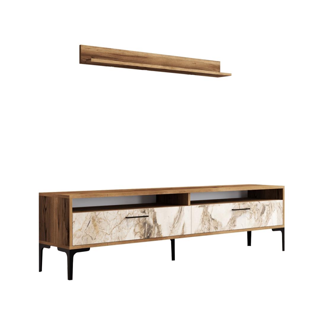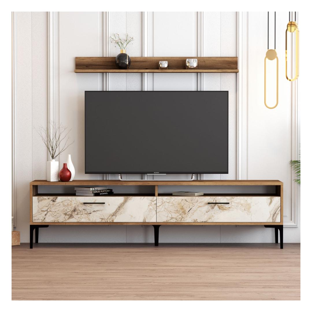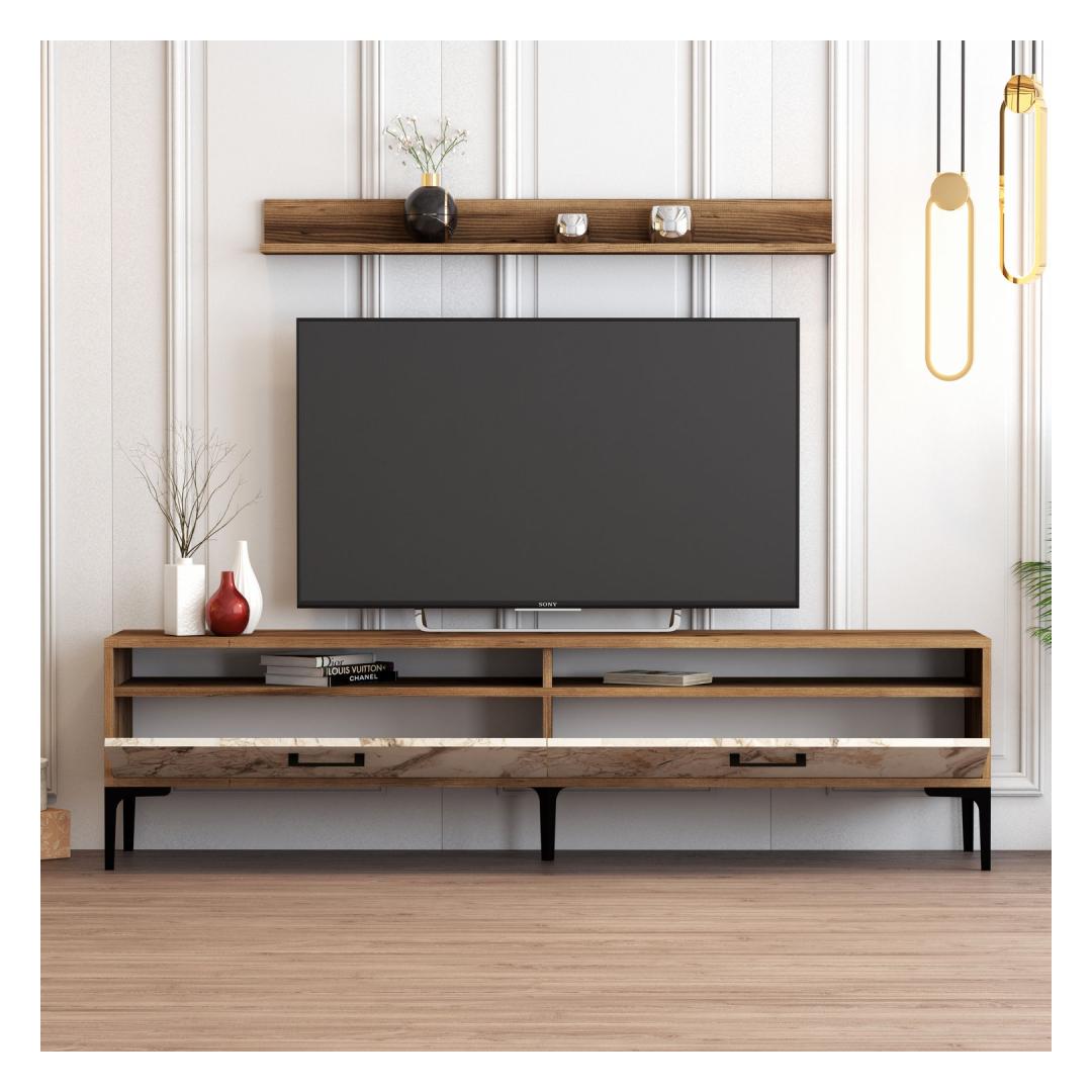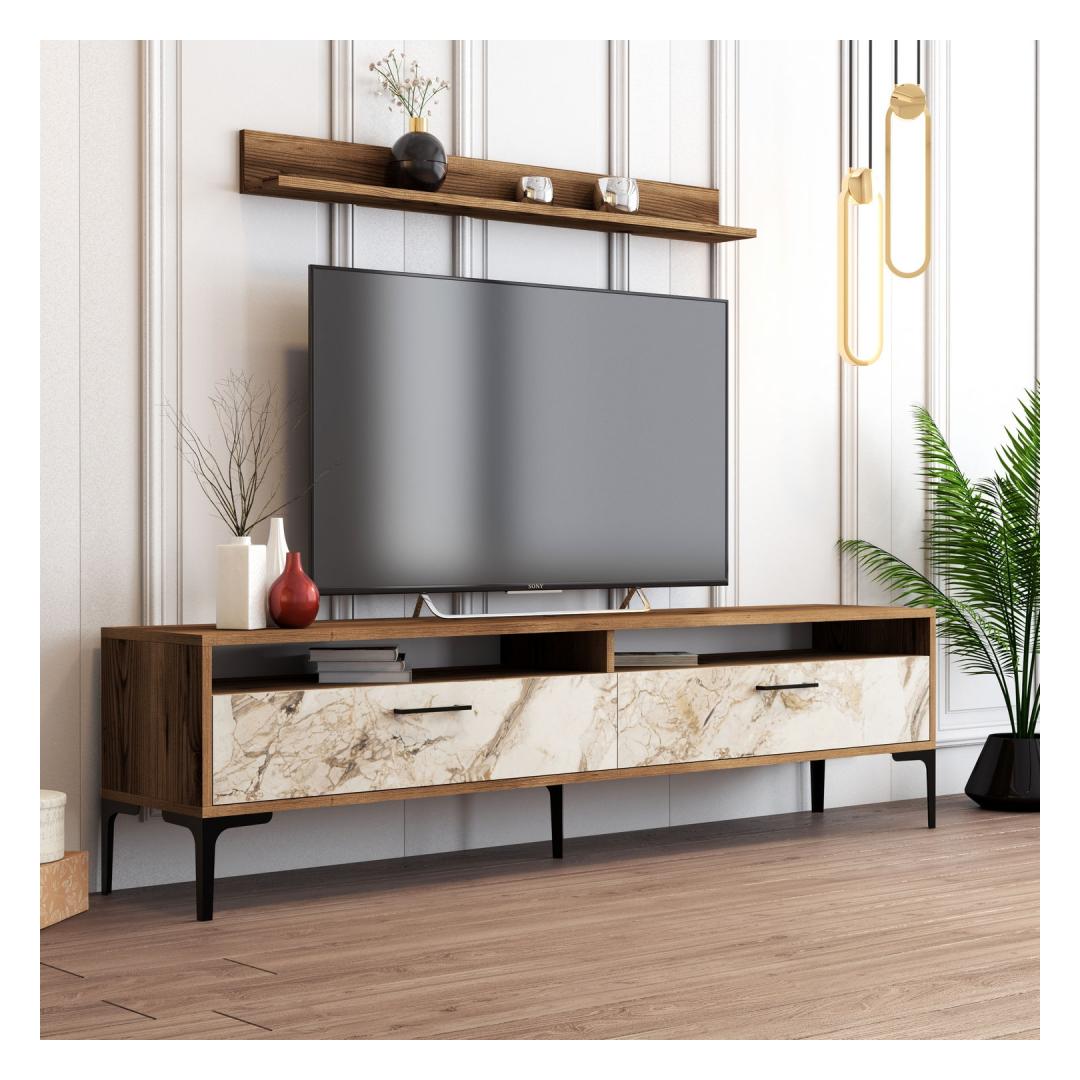 Tänu moodsale ja uudsele disainile täiustab see telerikapp vaevata teie kodu sisekujundust. Pähklipuu ja valge värvi kombinatsioon lisab elegantsust ja rafineeritust, muutes selle tähelepanu keskpunktiks igas ruumis.