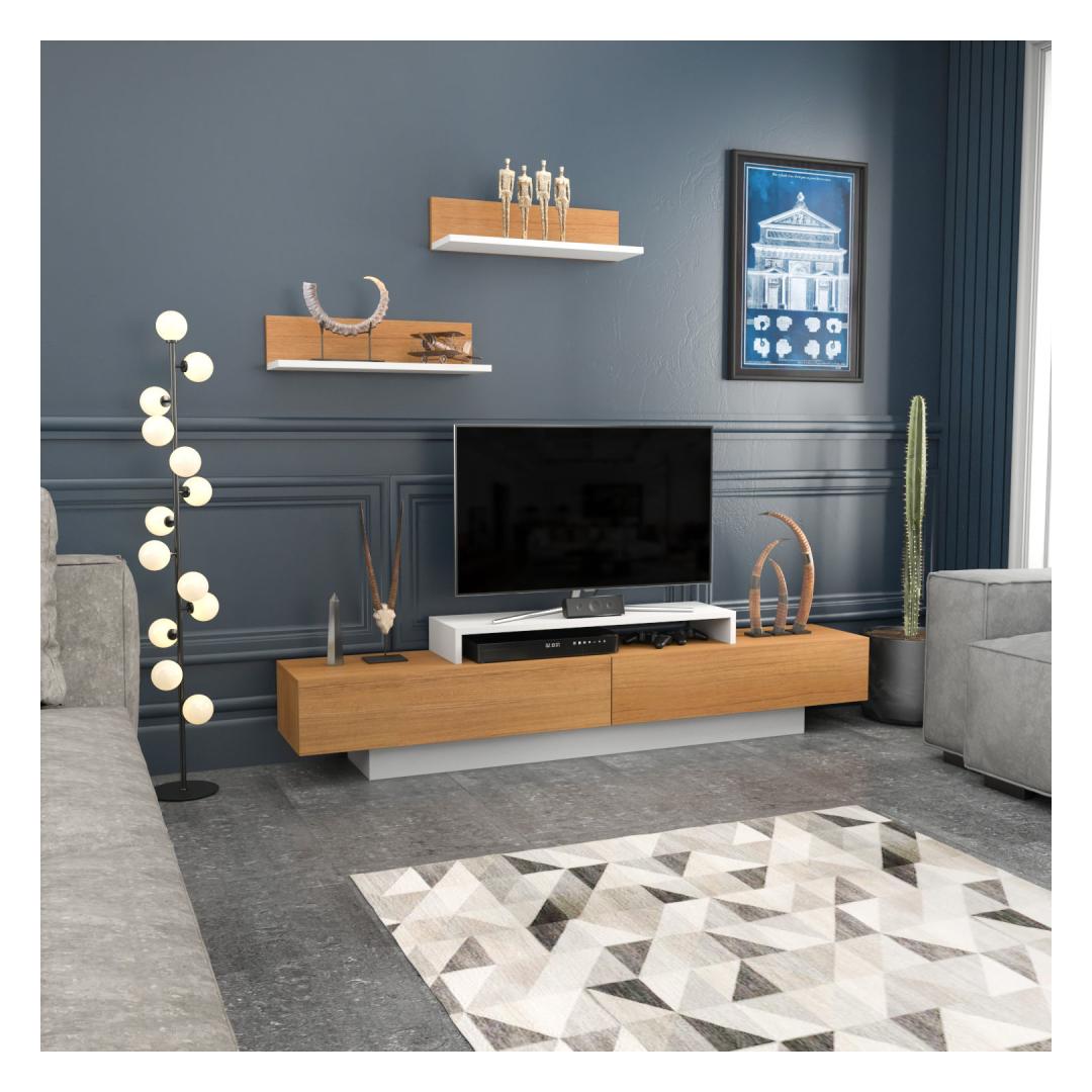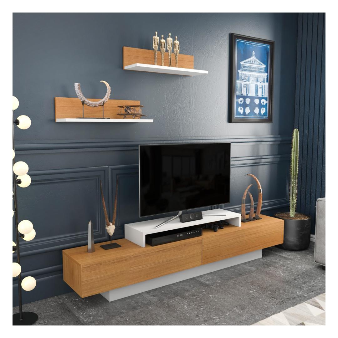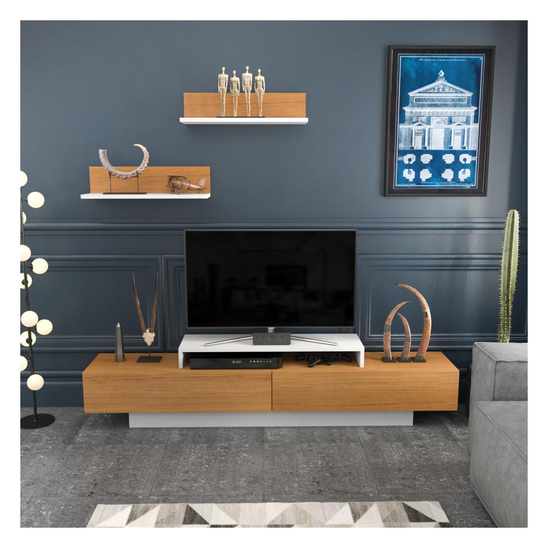 Transformeeri oma eluruum kaasaegse ja stiilse televiisorigaKas olete väsinud oma igavast ja vananenud elutoast? on aeg tuua elegantsust ja elegantsust meie uimastava teleriga. See skandinaavia minimalismi kontseptsiooni järgi disainitud telerikapp tõstab koheselt teie eluruumi esteetikat. Kogege võrratut vastupidavust ja kvaliteetiSee 100% melamiiniga kaetud puitlaastplaadist valmistatud televiisor on ehitatud kestma. 18 mm paksus tagab selle tugevuse ja vastupidavuse, mis teeb sellest pikaajalise investeeringu teie koju. Jääge hüvasti hapu mööbliga, mis kulub kiiresti ära, ja võtke vastu kvaliteet, mida pakub meie telerikapp. Rikkalik hoiuruum kõigi teie meelelahutusvajaduste jaoksMeie telekaplaadi laius on 180 cm, sügavus 31 cm ja kõrgus 40 cm, mis pakub piisavalt hoiuruumi kõigile teie meelelahutuslikele esmatähtsatele asjadele. Alates dvd-mängijast kuni mängukonsoolideni saate kõik korrastada kenasti ühes kohas. Lisaks sellele on kaks valget ja teekivivärvi seinariiulit, mille laius on 60cm, sügavus 18. 8cm ja kõrgus 15cm, pakuvad täiendavaid hoiu- ja väljapanekuvõimalusi. Täiendab teie kodu sisekujundust elegantse puudutusegaValge ja tiikpuu värvi kombinatsioon lisab elegantsi ja rafineeritust igale kodu sisustusele. Olenemata sellest, kas teil on modernne või traditsiooniline interjöör, see teler sulandub sujuvalt, parandades teie elutoa üldist esteetikat. On aeg avaldada külalistele muljet oma laitmatu maitsega mööbli osas. Tehnilised üksikasjad:Toote tüüp: Mööblileht, mis on valmistatud ja paigaldatud, kuid ei sisalda muid seadmeid: Telerikomplekt: TelerikomplektMaterjal: Materjal: Materjal: Materjal: Materjal: Materjal: Materjal: Materjal: materjal: 100% melamiiniga kaetud puitlaastplaatPaksus: 18mmTelerite mõõtmed: Laius: 180cm, sügavus: 31cm, kõrgus: 40cm.Seina riiuli mõõtmed: 8cm, kõrgus: 15cm (2 tk).Värv: valge ja teak Värv: White Teak