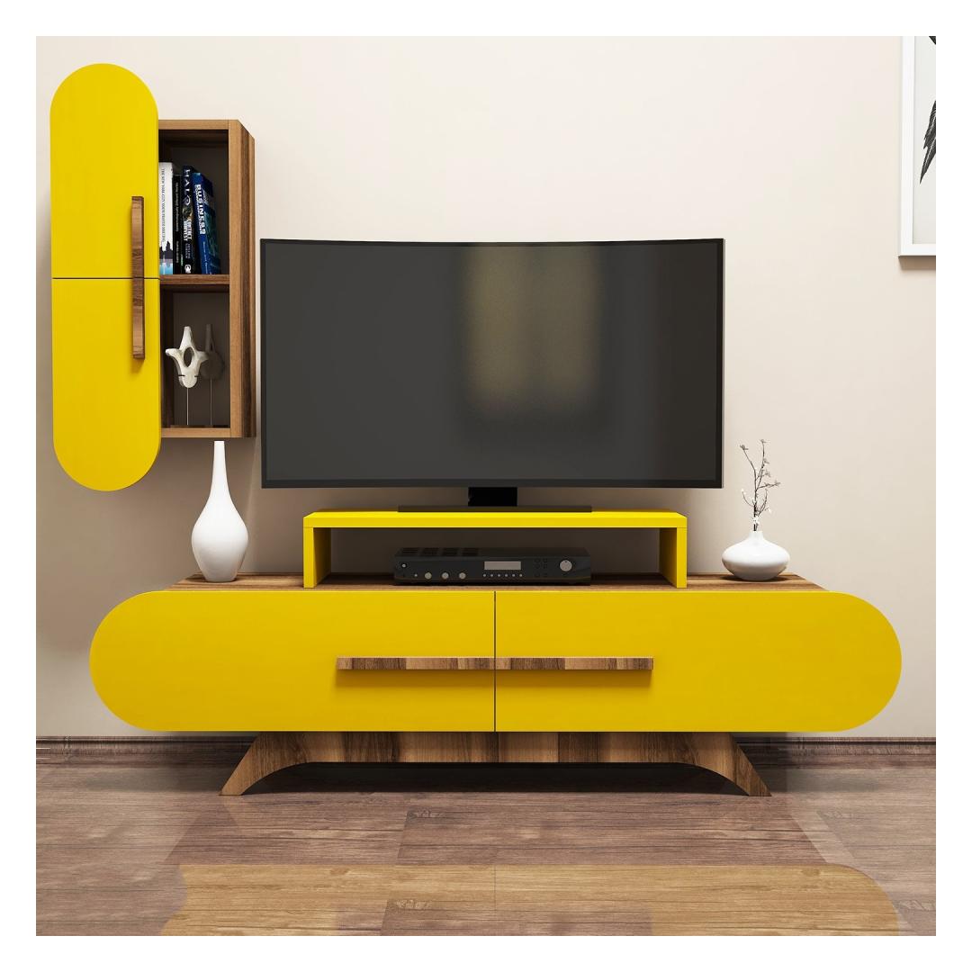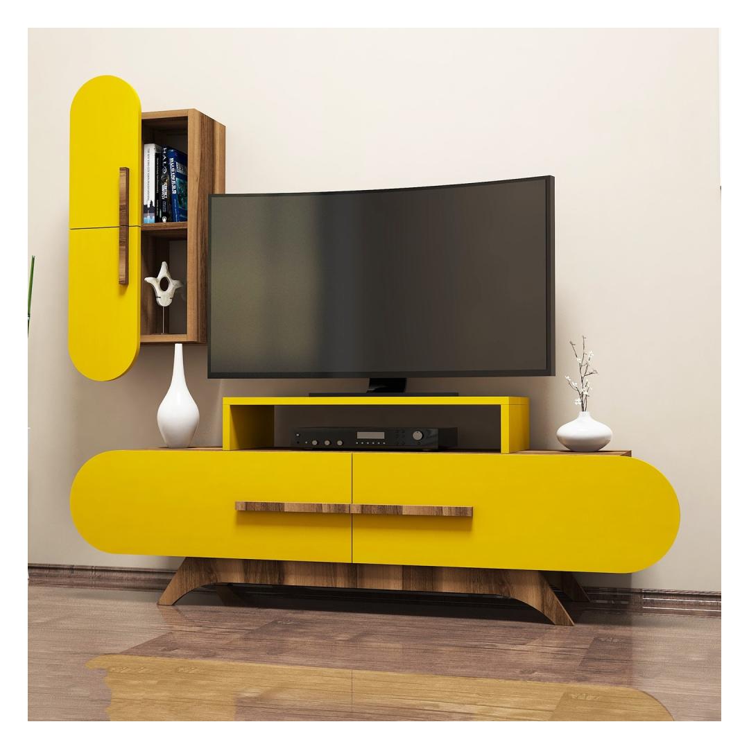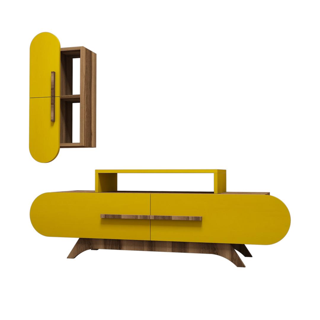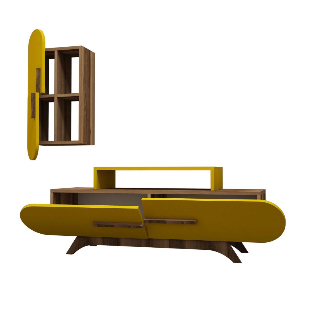 Pähklipuu- ja kollase värvi kombinatsiooniga lisab meie telerikapp teie elutuppa elurõõmu. Soojad toonid loovad hubase ja kutsuva atmosfääri, muutes selle ideaalseks kohaks, kus pärast pikka päeva lõõgastuda ja lõõgastuda.