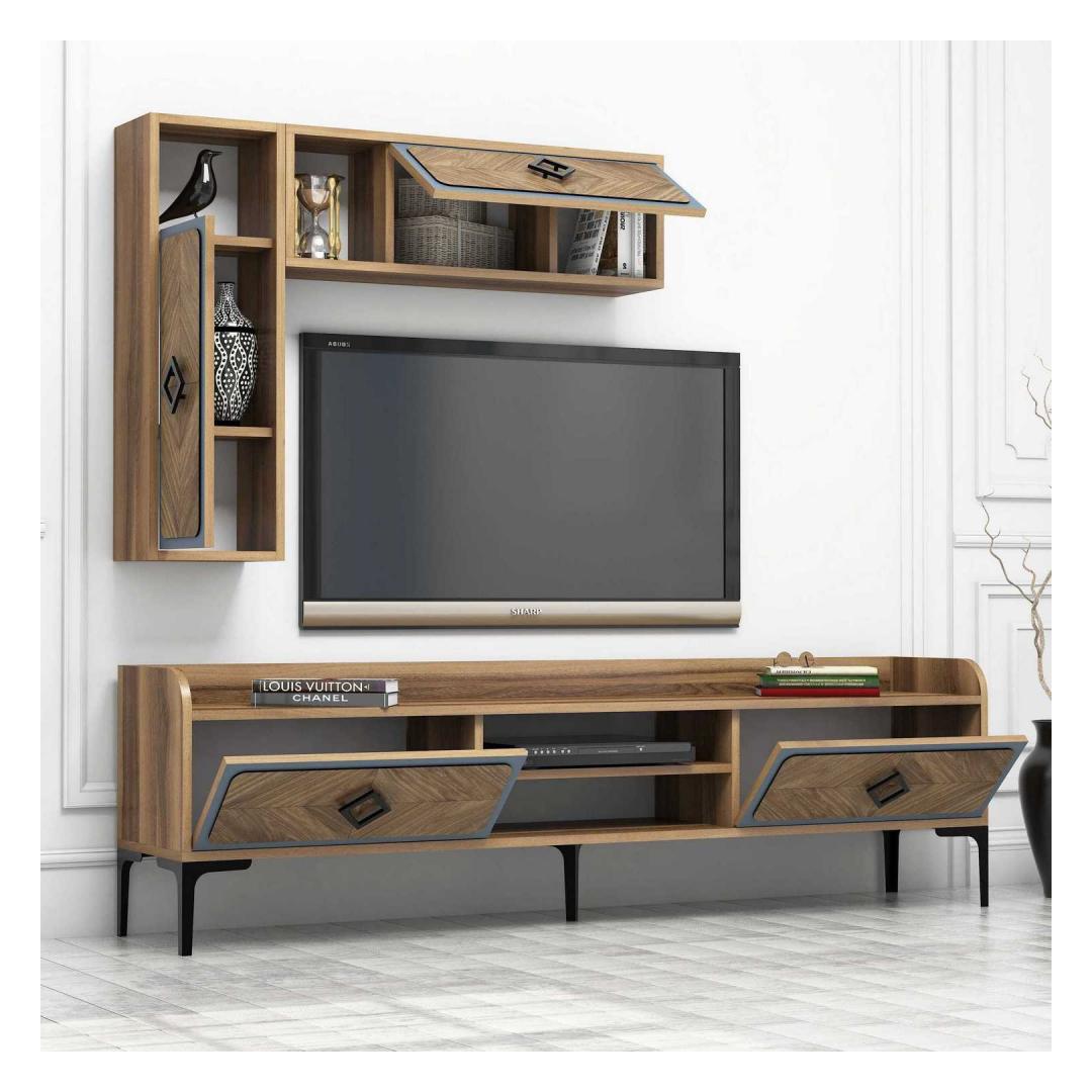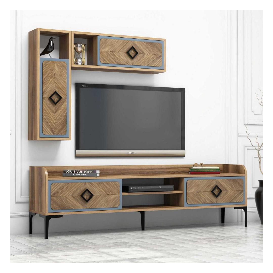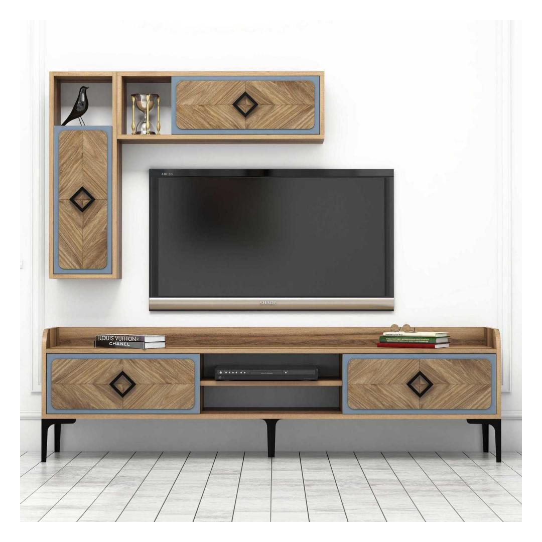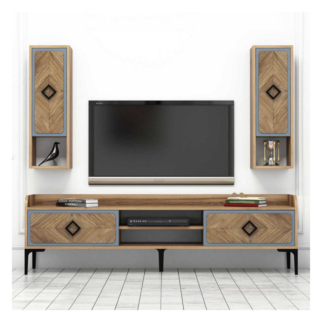 Seda televiisorikomplekti saab hõlpsasti seinale kinnitada, andes teile vabaduse valida selle jaoks ideaalne koht teie elutoas. Olenemata sellest, kas eelistate seda eraldiseisvana või olemasoleva mööbliga integreerituna, kohandub see vaevata vastavalt teie vajadustele. Pähklipuu ja sinise värvikombinatsioon lisab sellele kaasaegset hõngu, muutes selle igas ruumis suurepäraseks keskseks elemendiks.