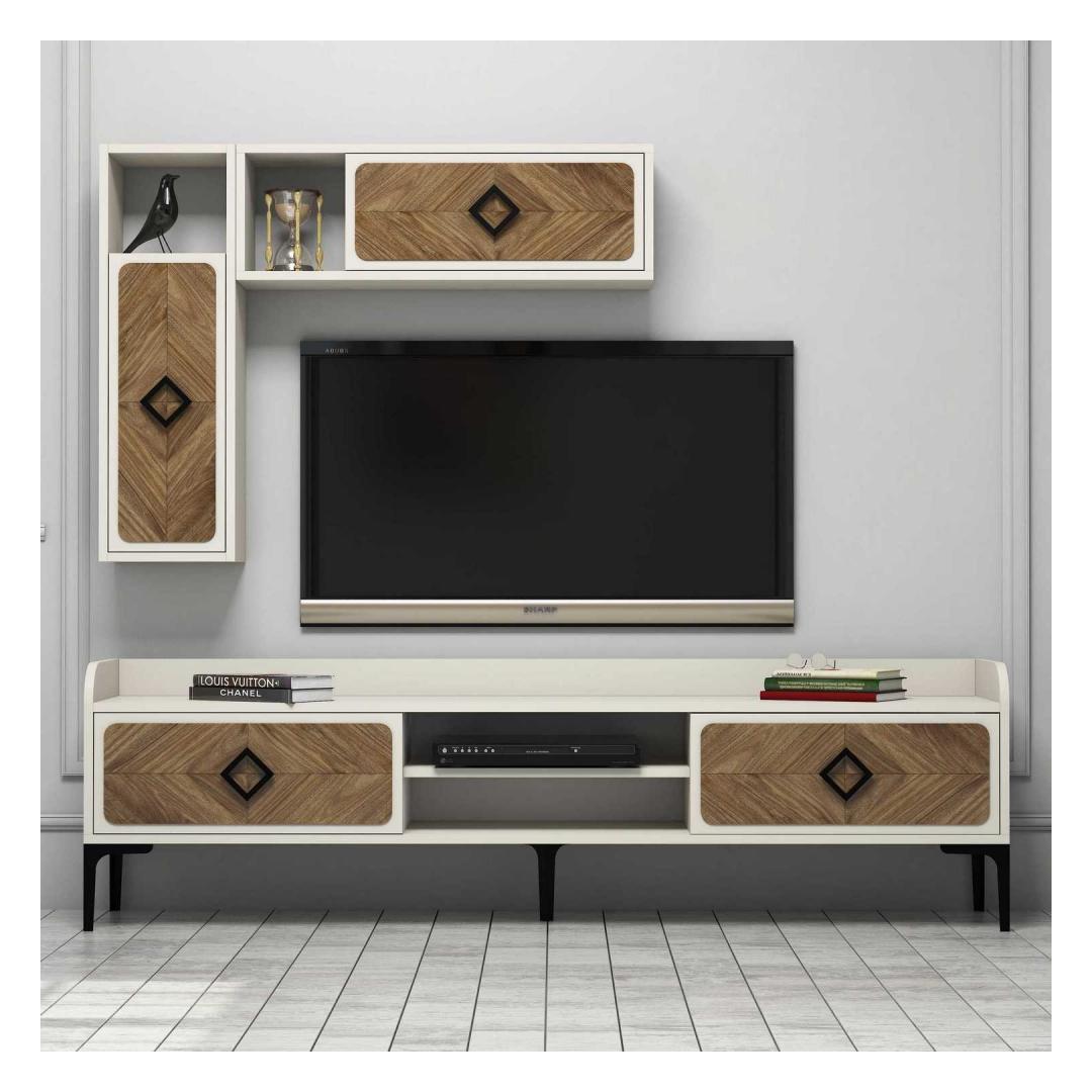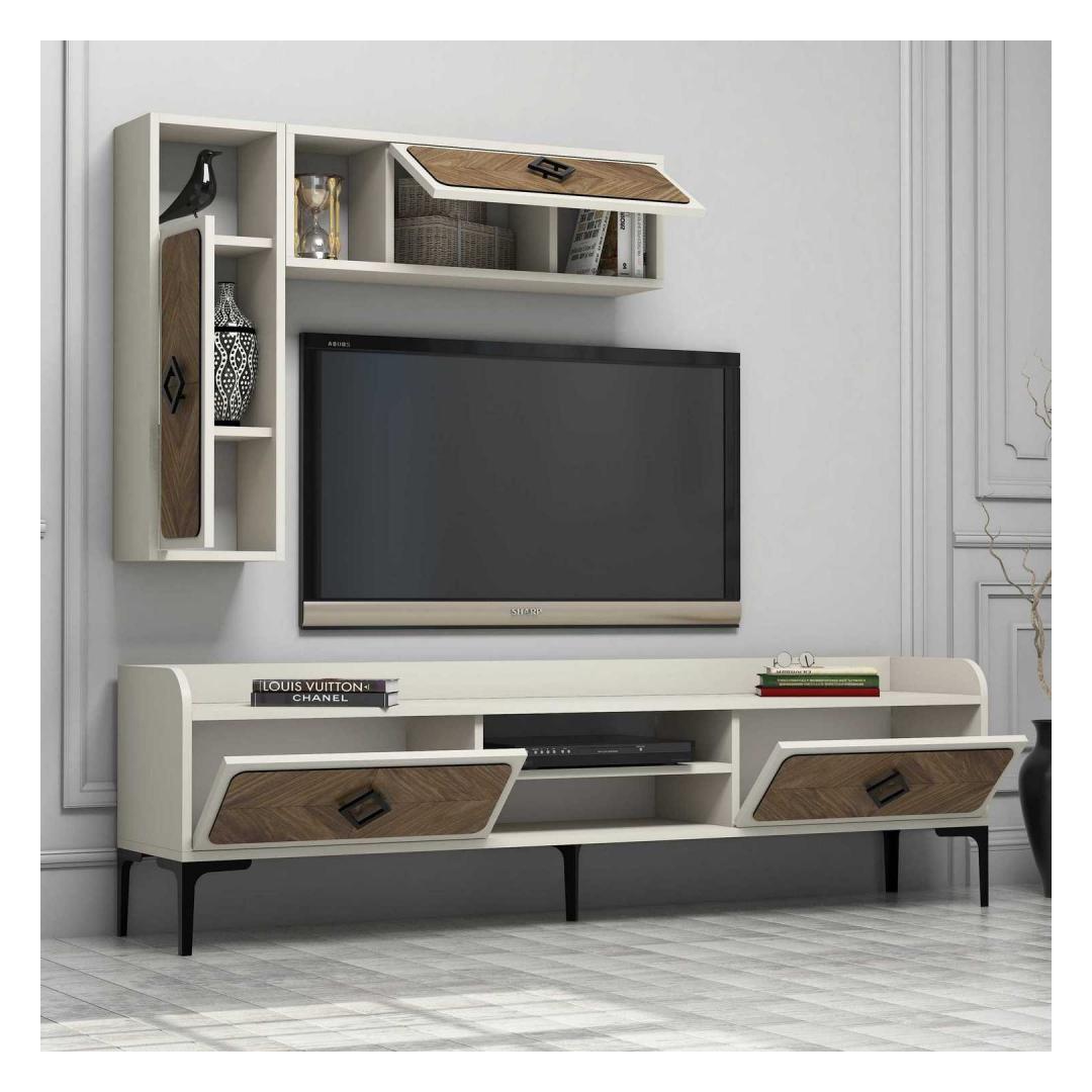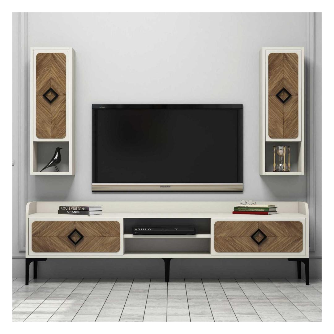 Tänu oma elegantsele ja kaasaegsele disainile saab sellest telerist kohe teie elutoa keskpunkt. Pähklipuu- ja kreemikat värvi kombinatsioon lisab igasse ruumi elegantsust ja rafineeritust. Seade on varustatud arvukate riiulitega, mis pakuvad piisavalt ruumi teie meediaseadmetele, raamatutele ja dekoratiivsetele esemetele.