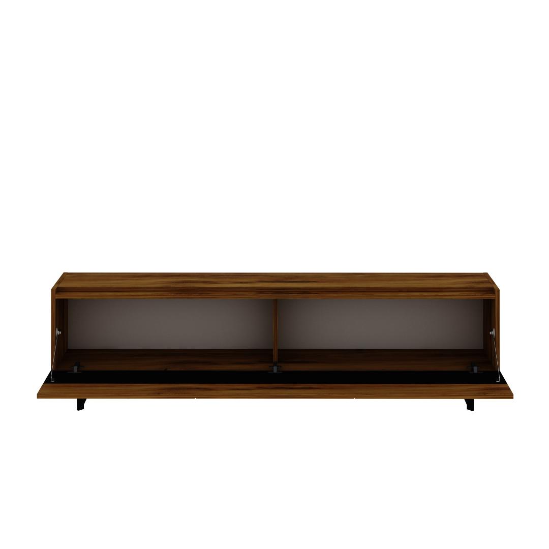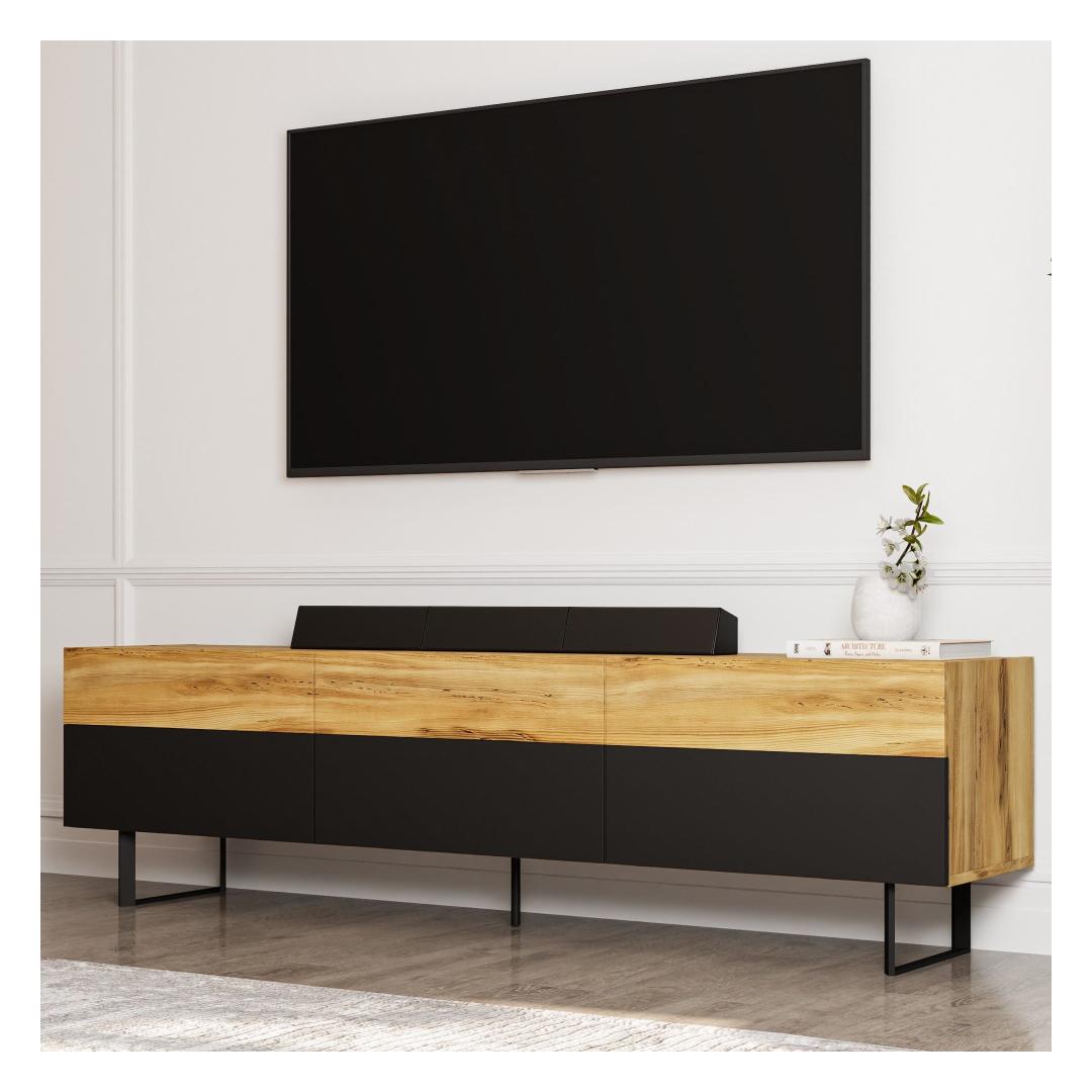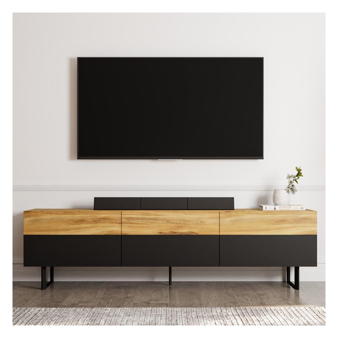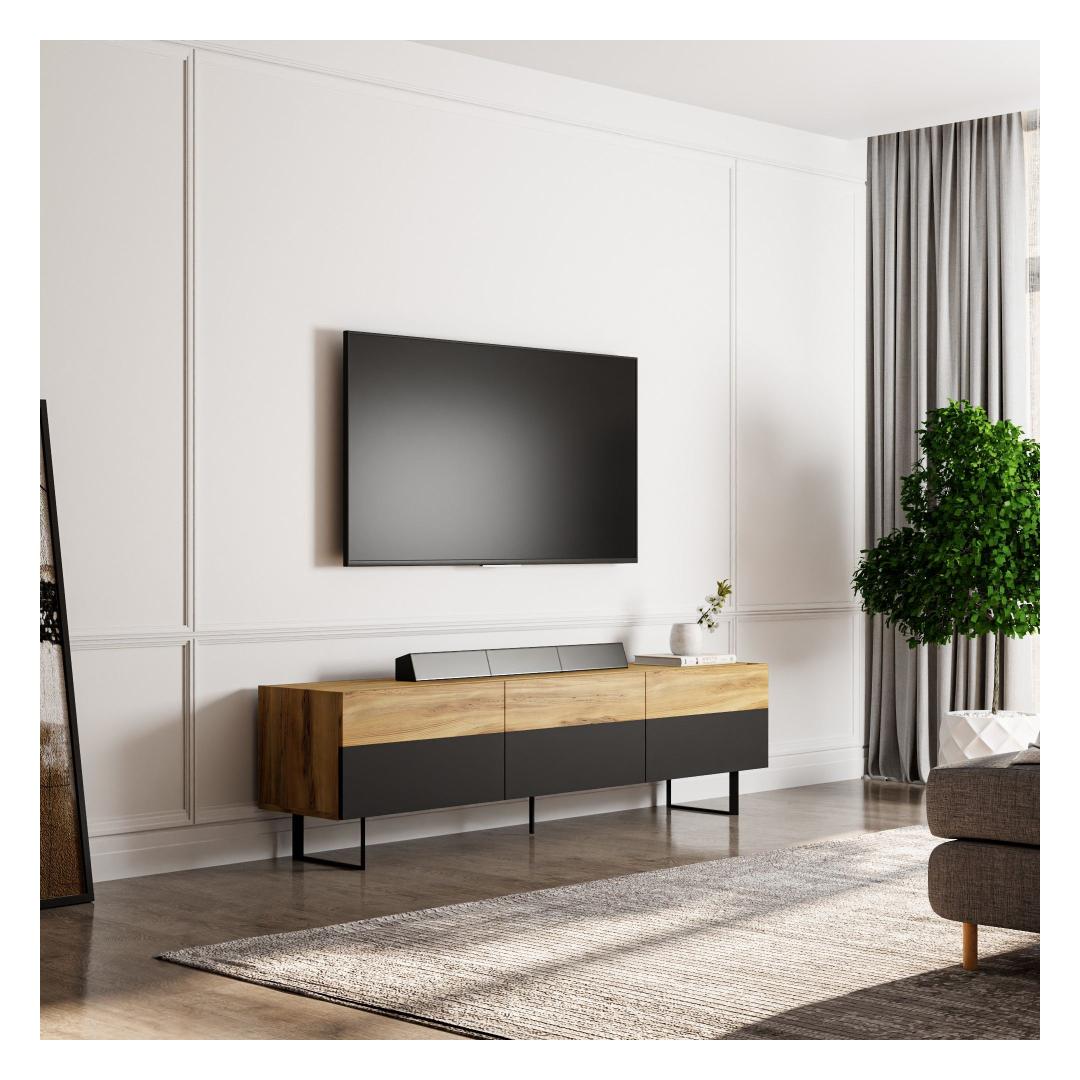 Selle voolujoonelise disaini ja modernse viimistlusega tõstab see telerialus koheselt sinu elutoa välimust. Must ja tamme värv sulanduvad sujuvalt igasse sisustusse, muutes selle mitmekülgseks lisandiks sinu koju.