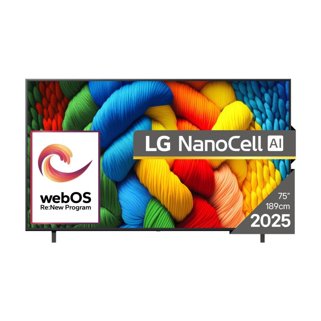 LG NanoCell AI NANO80 75NANO80A3B. Display diagonal: 190.5 cm (75"), Display resolution: 3840 x 2160 pixels, HD type: 4K Ultra HD, Display technology: LED, Screen shape: Flat, LED backlighting type: Direct-LED. Smart TV. Native aspect ratio: 16:9. Digital signal format system: DVB-C, DVB-S, DVB-S2, DVB-T, DVB-T2. Wi-Fi, Ethernet LAN. Product colour: Black