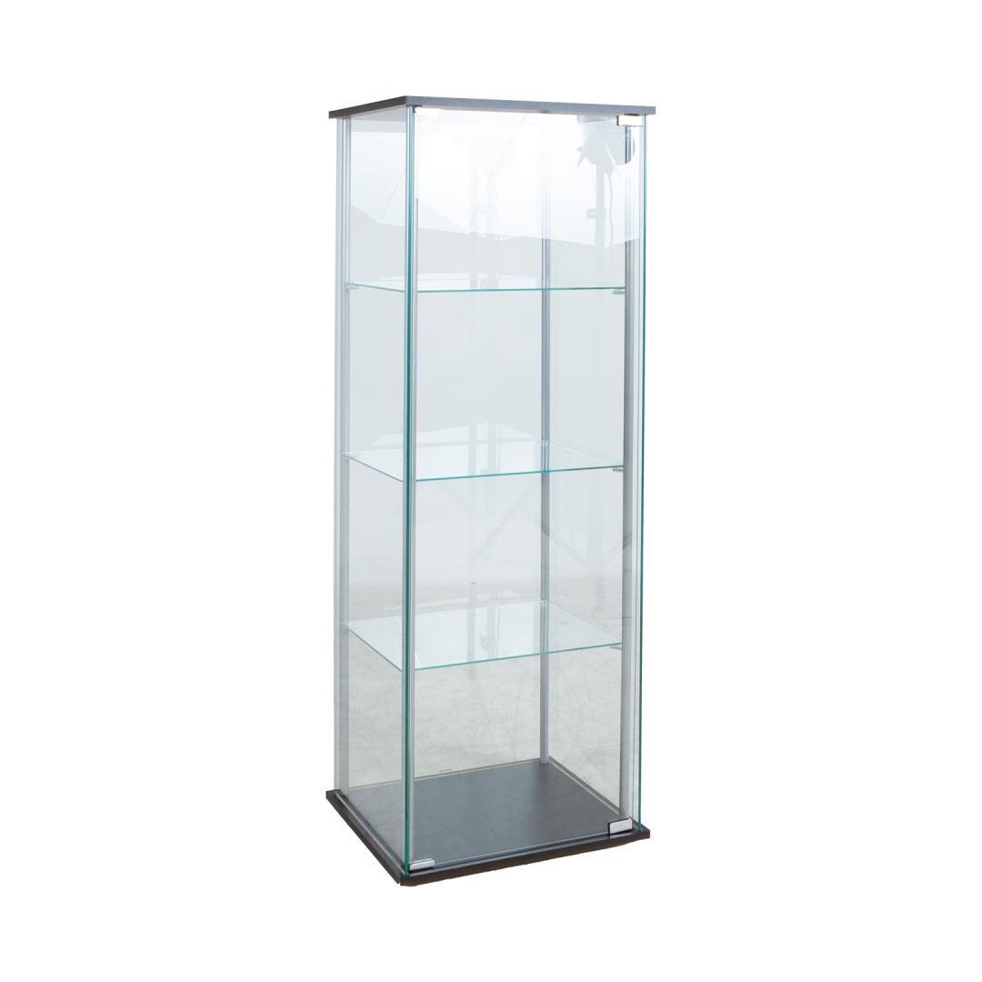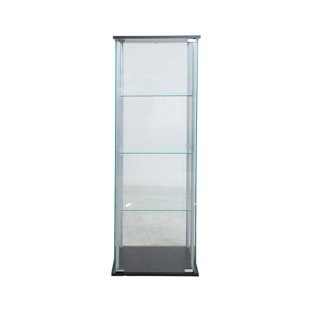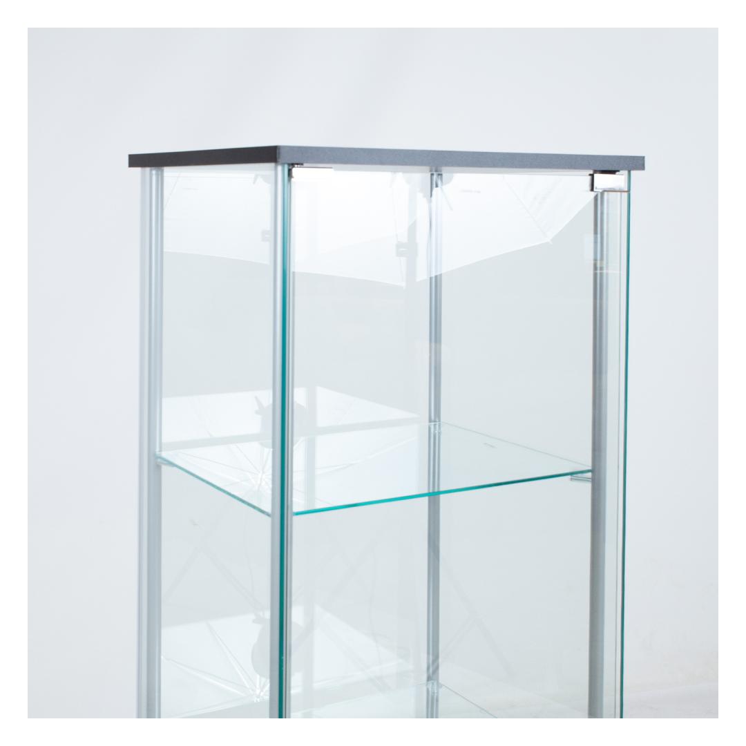 Õhulise klaasist vitriinkapi küljepostideks on hõbedased metalltorud. Vitriinkapi alus ja katus on valmistatud mustast lamineetplaadist. Kõik seinad, uks ja 3 vaheriiulit on tehtud 5mm karastatud klaasist.