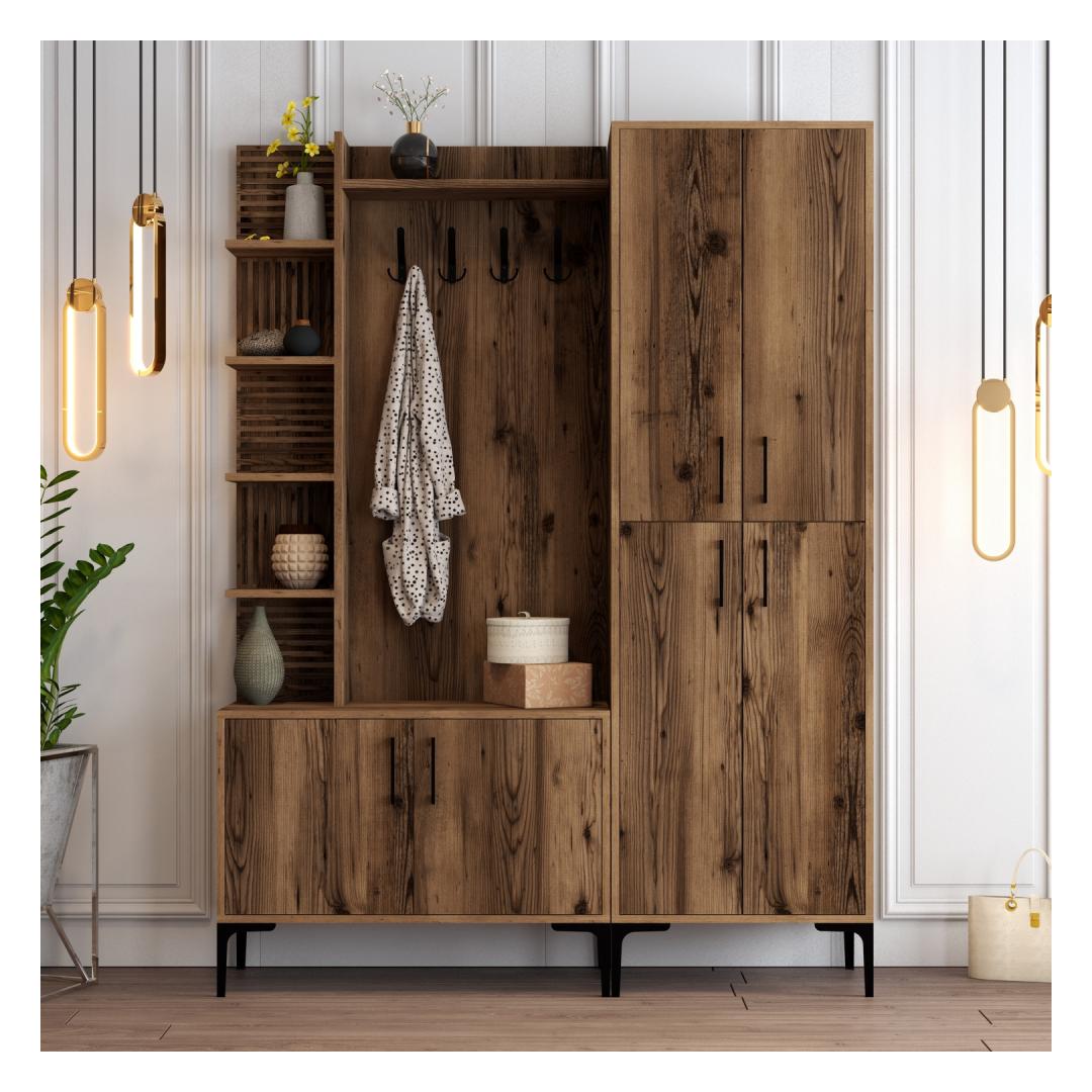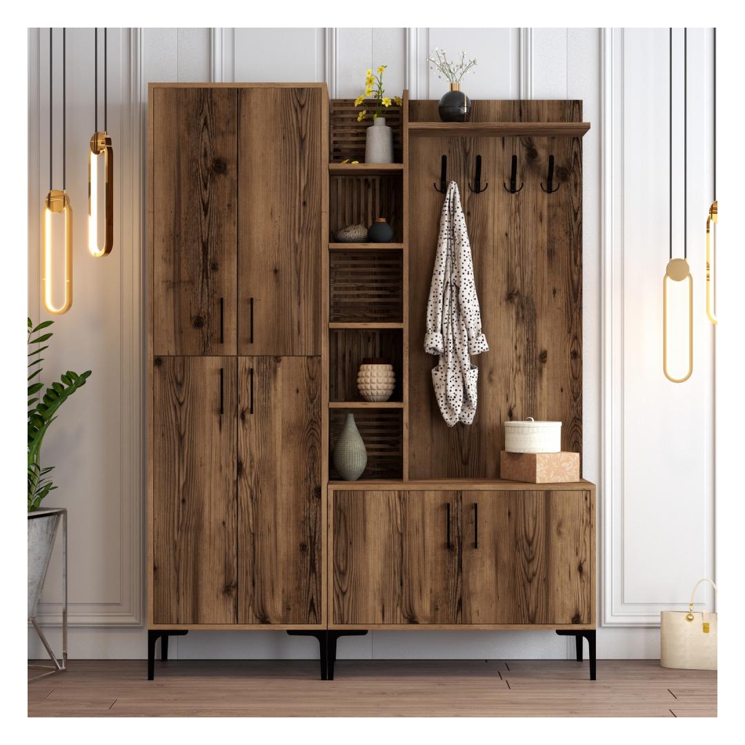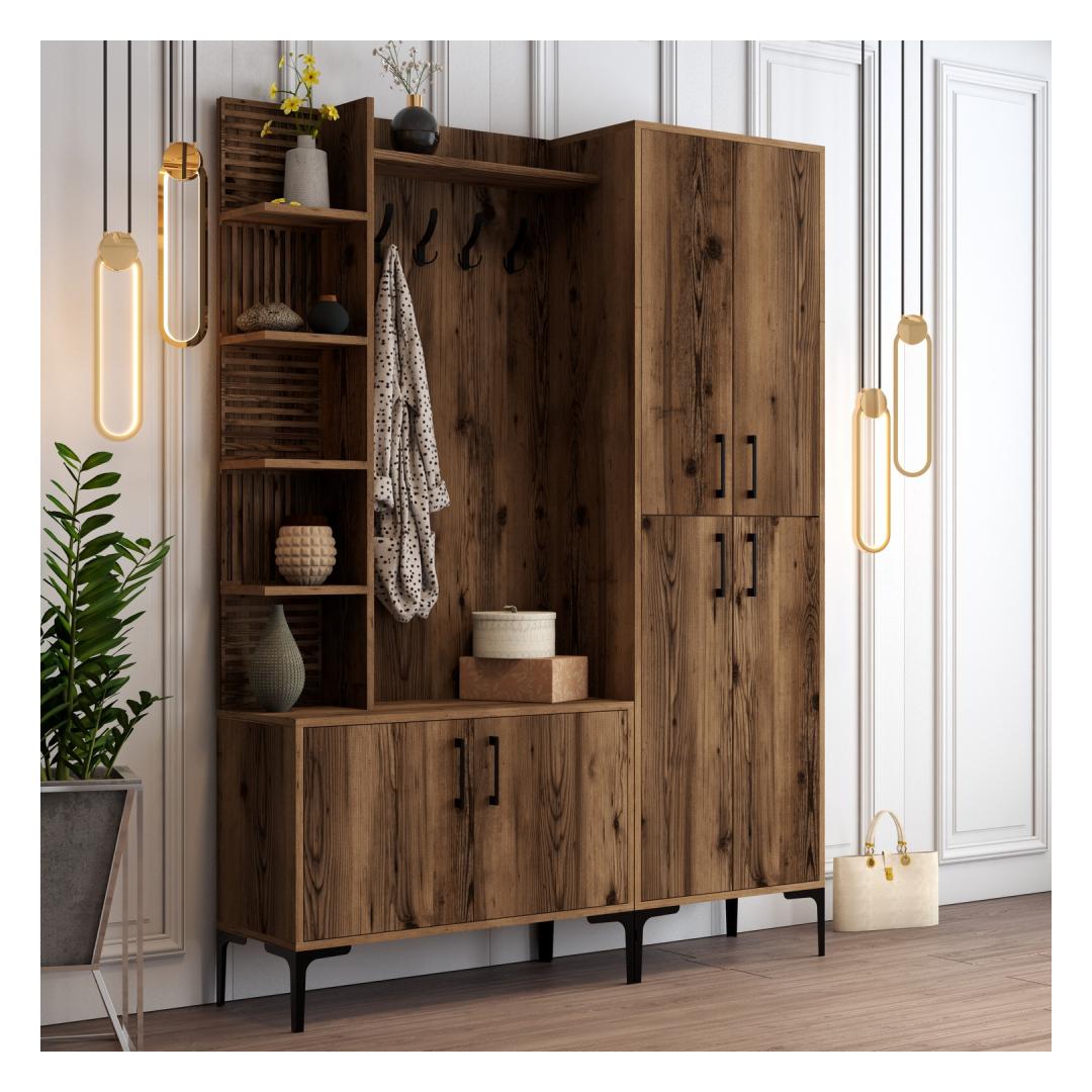 Kas oled väsinud segasest esikust koju tulemast? Ütle hüvasti kaosale ja tere korraldusele meie kauni tööstusliku esikupuu abil. Valmistatud 100% melamiinkattega puitlaastplaadist, on see esikupuu mitte ainult vastupidav, vaid ka stiilne, lisades sinu koju elegantsi.Korralda oma ruumMitmete riiulite ja kappidega pakub see esikupuu piisavalt hoiuruumi kõigi sinu oluliste asjade jaoks. Hoia oma võtmed, post ja muud esemed korralikult organiseerituna ja kergesti ligipääsetavana.Stiilne ja funktsionaalneSiidised metalljalad, käepidemed ja riidepuu lisavad sinu ruumile tööstuslikku hõngu, samas kui pähklipuu värv toob soojust ja elegantsi. See esikupuu ei ole lihtsalt mööbliese, vaid ka silmapaistev element, mis täiustab sinu kodu üldist esteetikat.Lihtne paigaldadaSeda esikupuud saab kergesti seina kinnitada, tagades stabiilsuse ja ohutuse. Väiksemad ja suuremad kapid pakuvad mitmekesisust hoiuvõimalustes, muutes selle sobivaks igas suuruses esikule.Muuda oma esik stiilseks ja organiseeritud ruumiks meie tööstusliku esikupuuga. Tellige oma täna ja kogege mugavust ja ilu, mida see teie koju toob.Tehnilised andmed:Materjal: 100% melamiinkattega puitlaastplaatPaksus: 18 mmMetalljalad, käepidemed ja riidepuuVäiksema kapi suurus: L60 x K35 x S200 cmSuurema kapi suurus: L90 x K35 x S200 cmRiiuli kõrgus: 25.6 cmKokku suurus: L150 x K35 x S200 cmJala kõrgus: 17 cmSaab kinnitada seinaVärv: Pähklipuu värv(ide) Värv: Walnut