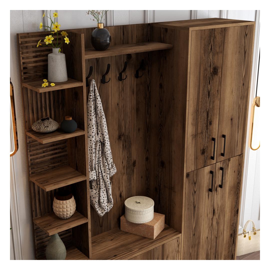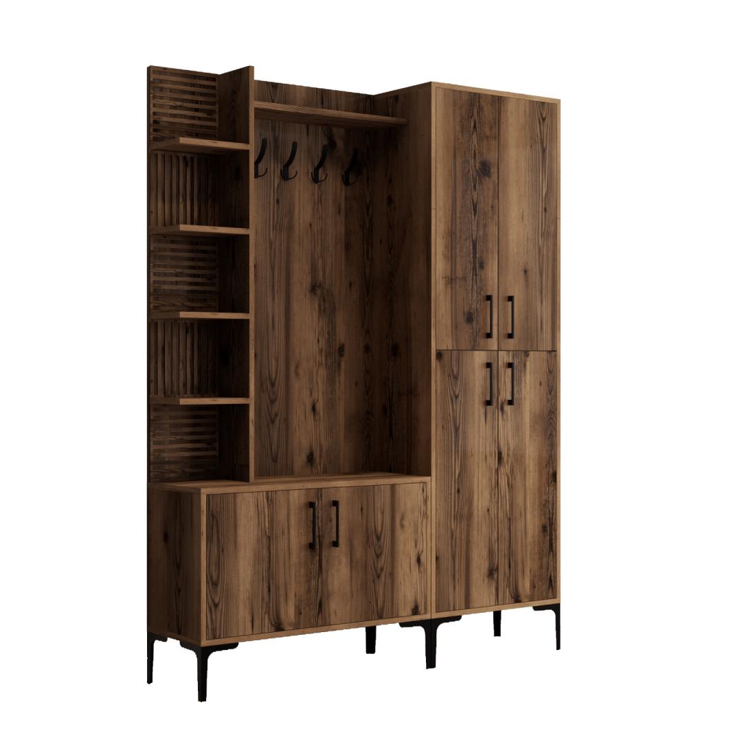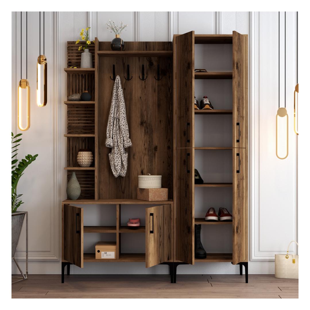 Kas oled väsinud segasest esikust koju tulemast? Ütle hüvasti kaosale ja tere korraldusele meie kauni tööstusliku esikupuu abil. Valmistatud 100% melamiinkattega puitlaastplaadist, on see esikupuu mitte ainult vastupidav, vaid ka stiilne, lisades sinu koju elegantsi.Korralda oma ruumMitmete riiulite ja kappidega pakub see esikupuu piisavalt hoiuruumi kõigi sinu oluliste asjade jaoks. Hoia oma võtmed, post ja muud esemed korralikult organiseerituna ja kergesti ligipääsetavana.Stiilne ja funktsionaalneSiidised metalljalad, käepidemed ja riidepuu lisavad sinu ruumile tööstuslikku hõngu, samas kui pähklipuu värv toob soojust ja elegantsi. See esikupuu ei ole lihtsalt mööbliese, vaid ka silmapaistev element, mis täiustab sinu kodu üldist esteetikat.Lihtne paigaldadaSeda esikupuud saab kergesti seina kinnitada, tagades stabiilsuse ja ohutuse. Väiksemad ja suuremad kapid pakuvad mitmekesisust hoiuvõimalustes, muutes selle sobivaks igas suuruses esikule.Muuda oma esik stiilseks ja organiseeritud ruumiks meie tööstusliku esikupuuga. Tellige oma täna ja kogege mugavust ja ilu, mida see teie koju toob.Tehnilised andmed:Materjal: 100% melamiinkattega puitlaastplaatPaksus: 18 mmMetalljalad, käepidemed ja riidepuuVäiksema kapi suurus: L60 x K35 x S200 cmSuurema kapi suurus: L90 x K35 x S200 cmRiiuli kõrgus: 25.6 cmKokku suurus: L150 x K35 x S200 cmJala kõrgus: 17 cmSaab kinnitada seinaVärv: Pähklipuu värv(ide) Värv: Walnut