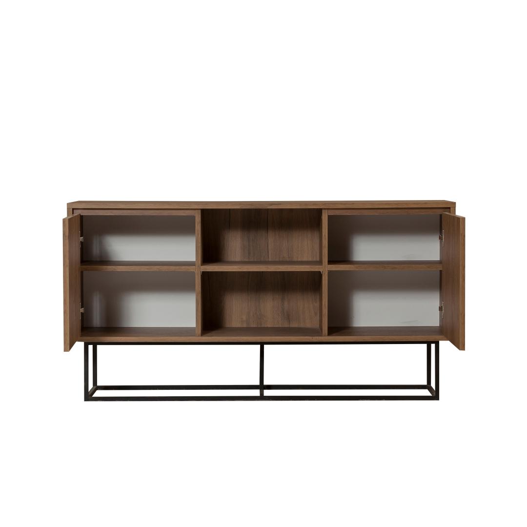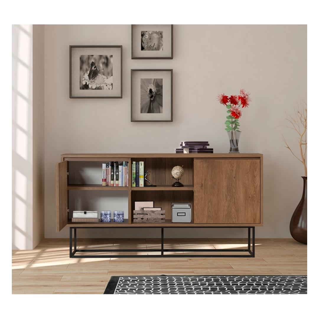 Selle konsooli elegantset disaini täiendavad metallist jalad, mis lisavad teie ruumile elegantsust. Pähklipuu ja musta värvi kombinatsioon loob silmatorkava kontrasti, muutes selle konsooli igas ruumis silmapaistvaks esemeks.