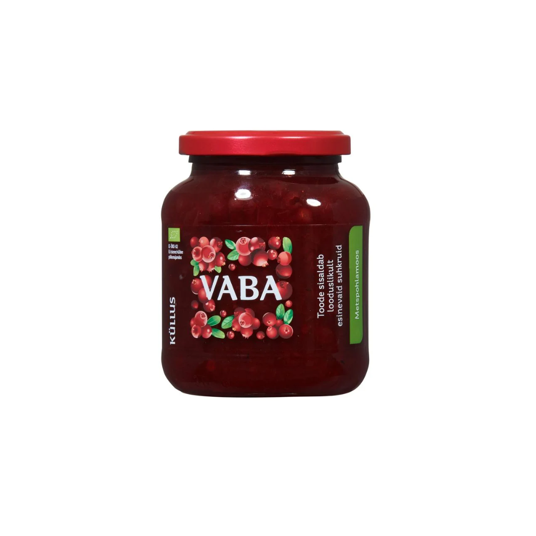 The product is made from organic raw materials, without added sugar. Made with 340 g of fruits/berries per 100 g of product. Ingredients: organic concentrated apple juice, organic lingonberries 40%, thickener pectin, thickener calcium citrate, antioxidant ascorbic acid.