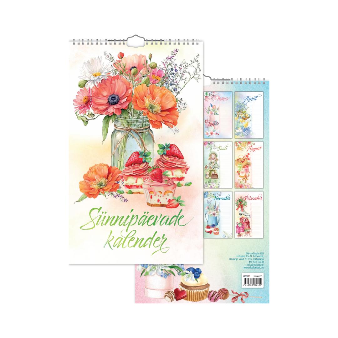 Size: 250 x 420 mm Spiral binding Hanging loop PVC pocket Static date marker Language: Estonian The calendar includes the following: Public holidays, national and national calendar anniversaries, flag and name days, phases of the moon, beginnings of seasons with times, week number, lost Thursdays.