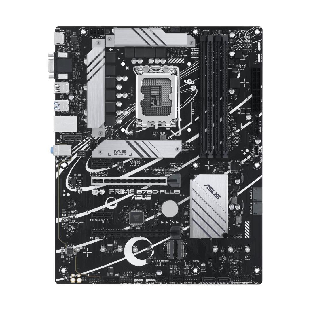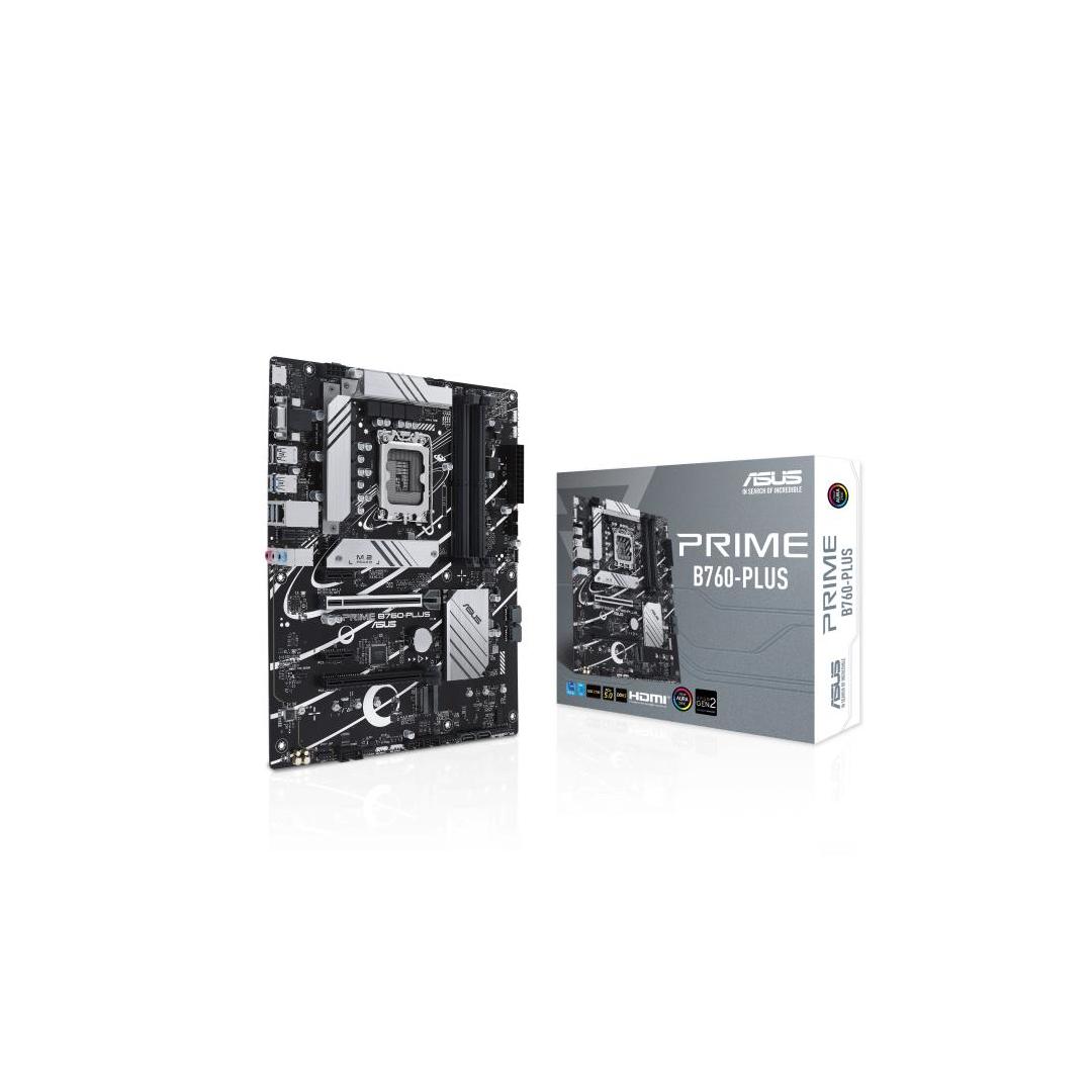 ASUS Prime B760-PLUS, an Intel® B760 LGA 1700 ATX motherboard with PCIe 5.0, three PCIe 4.0 M.2 slots, DDR5, Realtek 2.5Gb Ethernet, DisplayPort, VGA, HDMI™, SATA 6 Gbps, USB 3.2 Gen 2x2 Type-C®, front USB 3.2 Gen 1 Type-C®, Thunderbolt™ (USB4®) support, Aura Sync - Intel® LGA 1700 Socket: Ready for 13th and 12th Gen Intel® processors