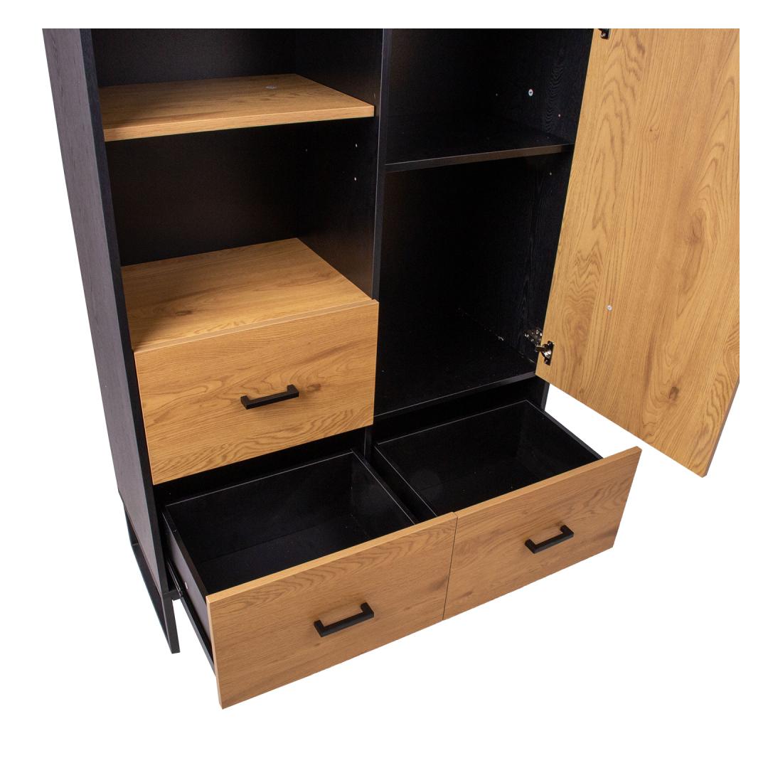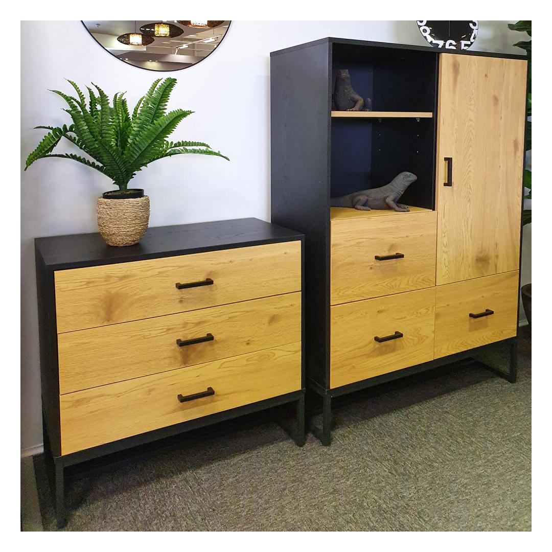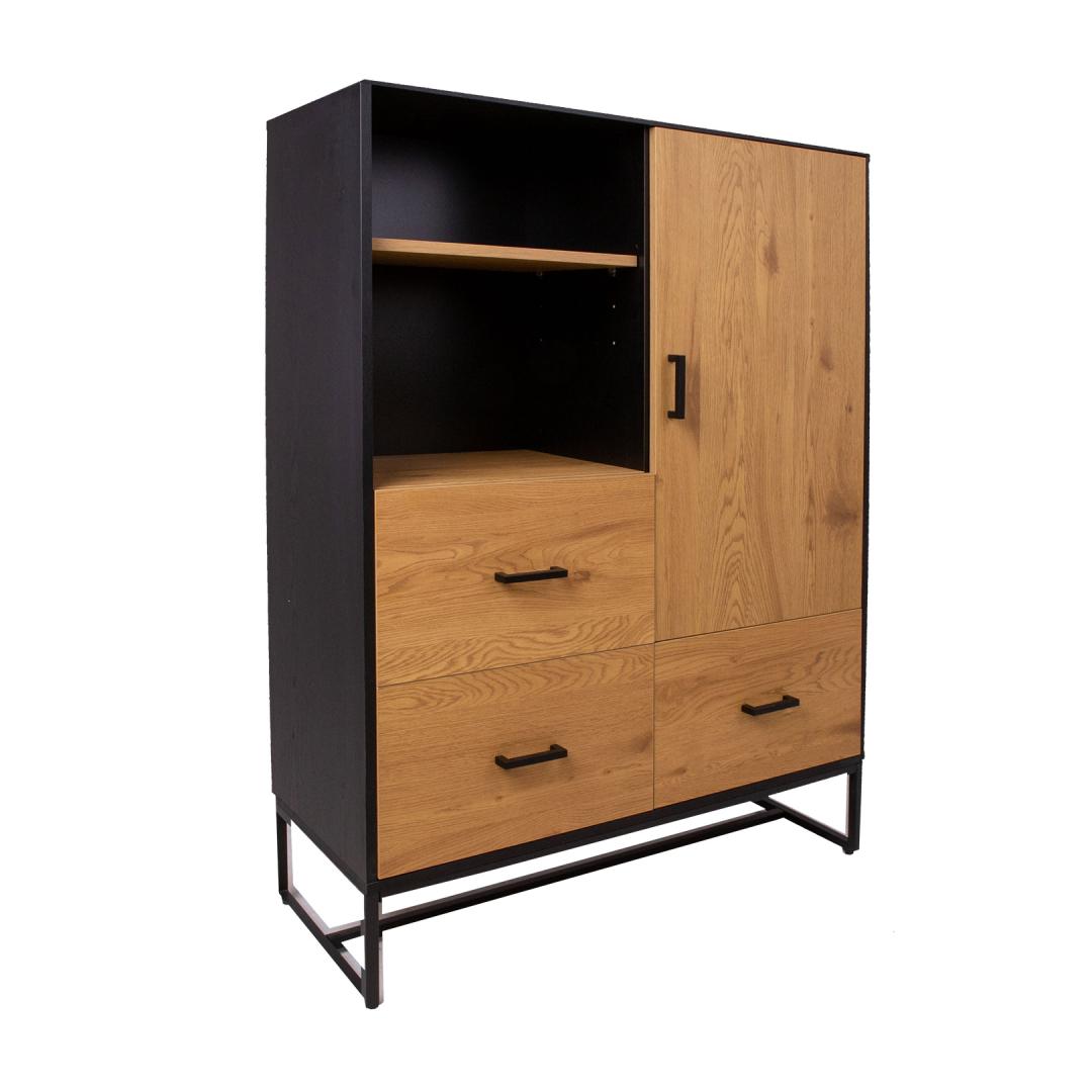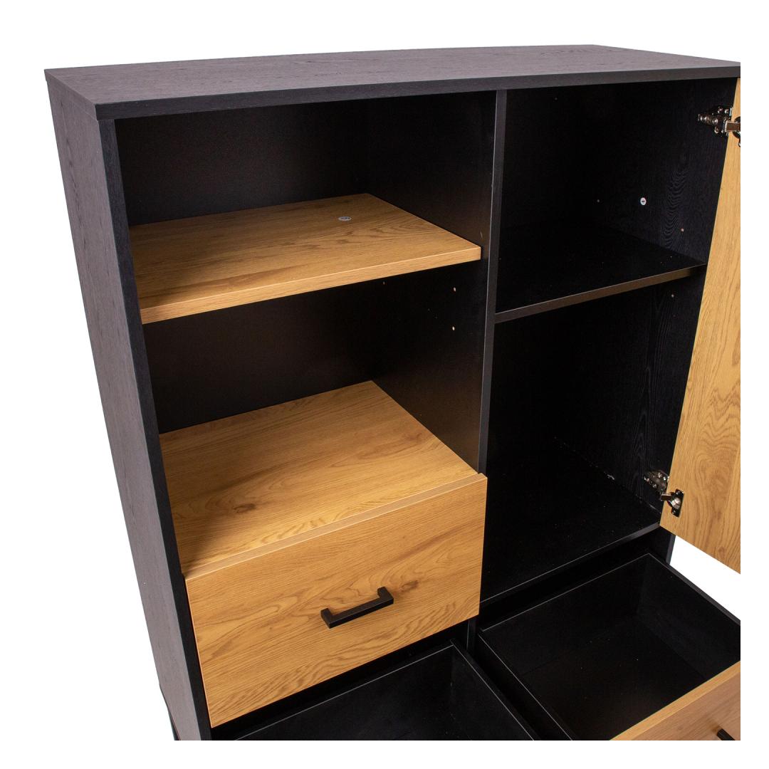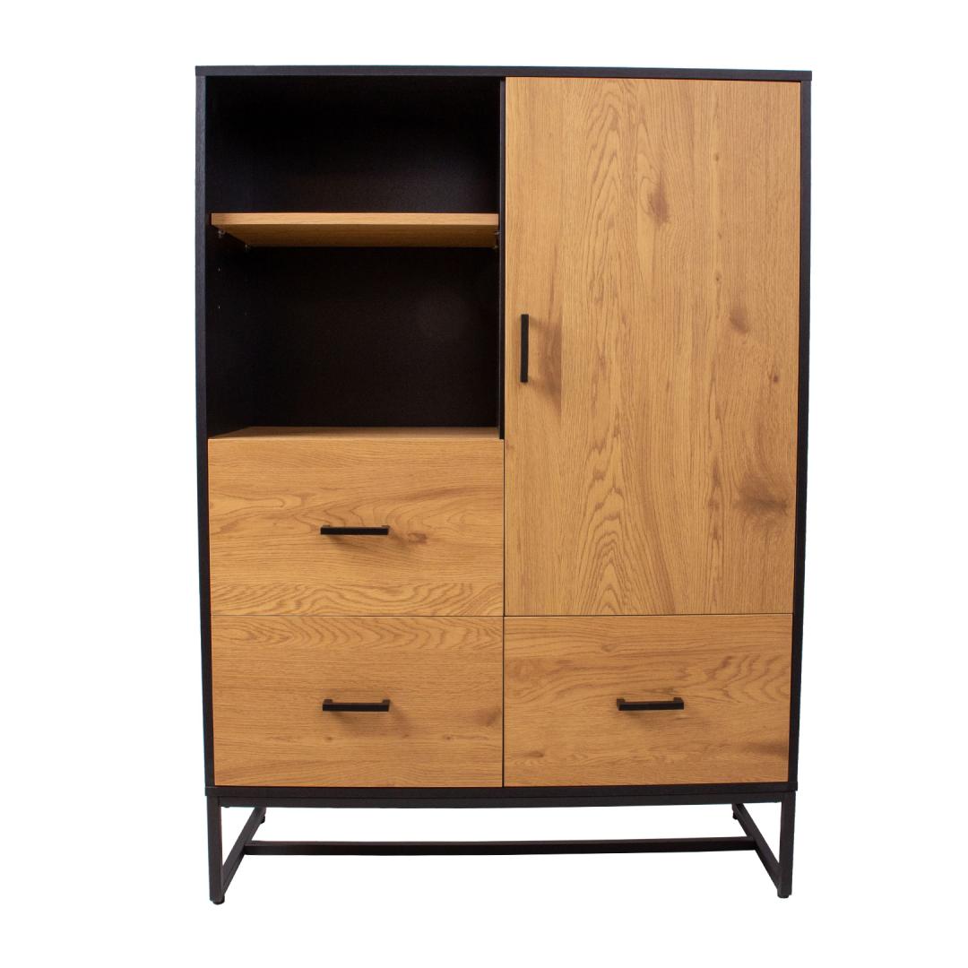 Chest of drawers AMSTERDAM 100x40xH140cm. Material: melamine board, color: oak/black. Black metal base frame. Hinges and drawer rails close quietly. Black aluminum handles. Kummut AMSTERDAM 100x40xH140cm. Materjal: melamiinplaat, värvus: tamm/must. Must metallist alusraam. Vaikselt sulguvad hinged ja sahtlisiinid. Mustad alumiiniumust käepidemed.