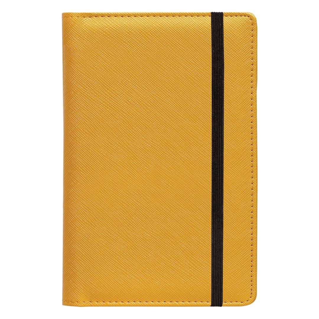 Spiral-bound calendar with artificial leather cover and day division, p. size 93x170 mm. Fastening with a screw. The calendar includes national holidays, national and national calendar anniversaries, flag days, name days, 42 national holidays as abbreviations, sunrise and sunset times, moon phases, beginnings of seasons, plans for the current and next year, tabular calendars for the year, phonetic alphabets. Pencil holder.