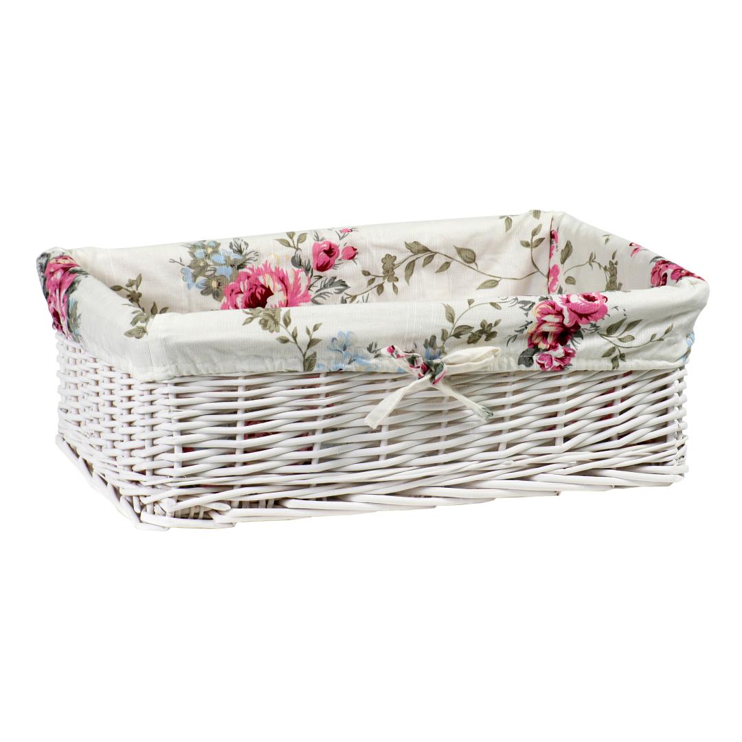 Basket material: white colored willow, fabric: rose design canvas. Korvi materjal: naturaalne korvipaju, värvitud valgeks. Tekstiilvooder: puuvillane lillemustriga.