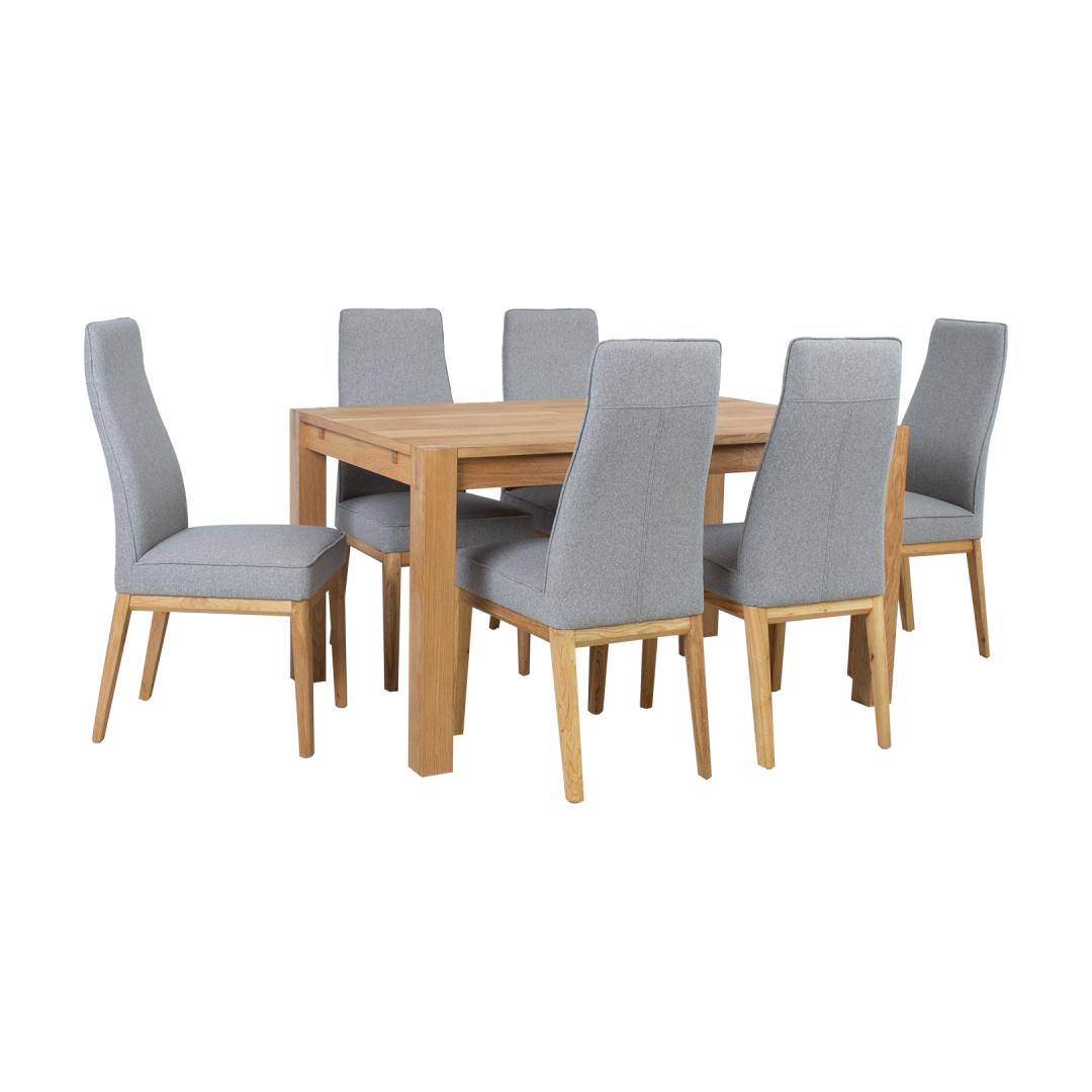 Dining set CHICAGO NEW table and 4 chairs. The dimensions of the table are 140x90xH76cm. Tabletop: MDF covered with natural oak veneer. Table legs (8x8cm) and frame are made of solid wood and covered with natural oak veneer. The table is finished with wood oil. The dimensions of the chair are 46x58,5xH102cm. The upholstered seat and backrest are covered with grey polyester fabric. The legs and base frame of the chair are made of solid oak. Seat height 48cm. Weight limit 100kg. The table can be extended and purchase an extension plate 45x90cm, code 84026. The extension plate can be installed at both ends of the table. CARE: tabletop covered with natural veneer is very sensitive to moisture and temperature. Always use mats and hotplates under the tableware. Any liquid that gets on the table should be dried immediately with a soft cloth. Avoid excessive rubbing and abrasive cleaners. Söögilauakomplekt CHICAGO NEW 4-tooliga. Laua mõõdud on 140x90xH76cm. Lauaplaat: MDF kaetud naturaalse tammespooniga. Lauajalad (8x8cm) ja raam on valmistatud täispuidust ja kaetud naturaalse tammespooniga. Laud on viimistletud puiduõliga. Tooli mõõdud on 46x58,5xH102cm. Tooli iste ja seljatugi on polsterdatud ja kaetud halli polüesterkangaga. Jalad ja alusraam on valmistatud tammepuidust. Istme kõrgus 48cm. Kaalupiirang 100kg. Lauale on võimalik juurde osta pikendus 45x90cm, koodiga 84026. Pikendus on võimalik paigaldada laua mõlemasse otsa. HOOLDUS: naturaalse spooniga kaetud lauaplaat on väga tundlik niiskuskahjustuste ja temperatuuri suhtes. Kasutage alati lauanõude all alusmatte ja kuumaaluseid. Igasugune lauale sattunud vedelik tuleb koheselt kuivatada pehme lapiga. Vältige liigset hõõrumist ja abrasiivseid puhastusvahendeid.