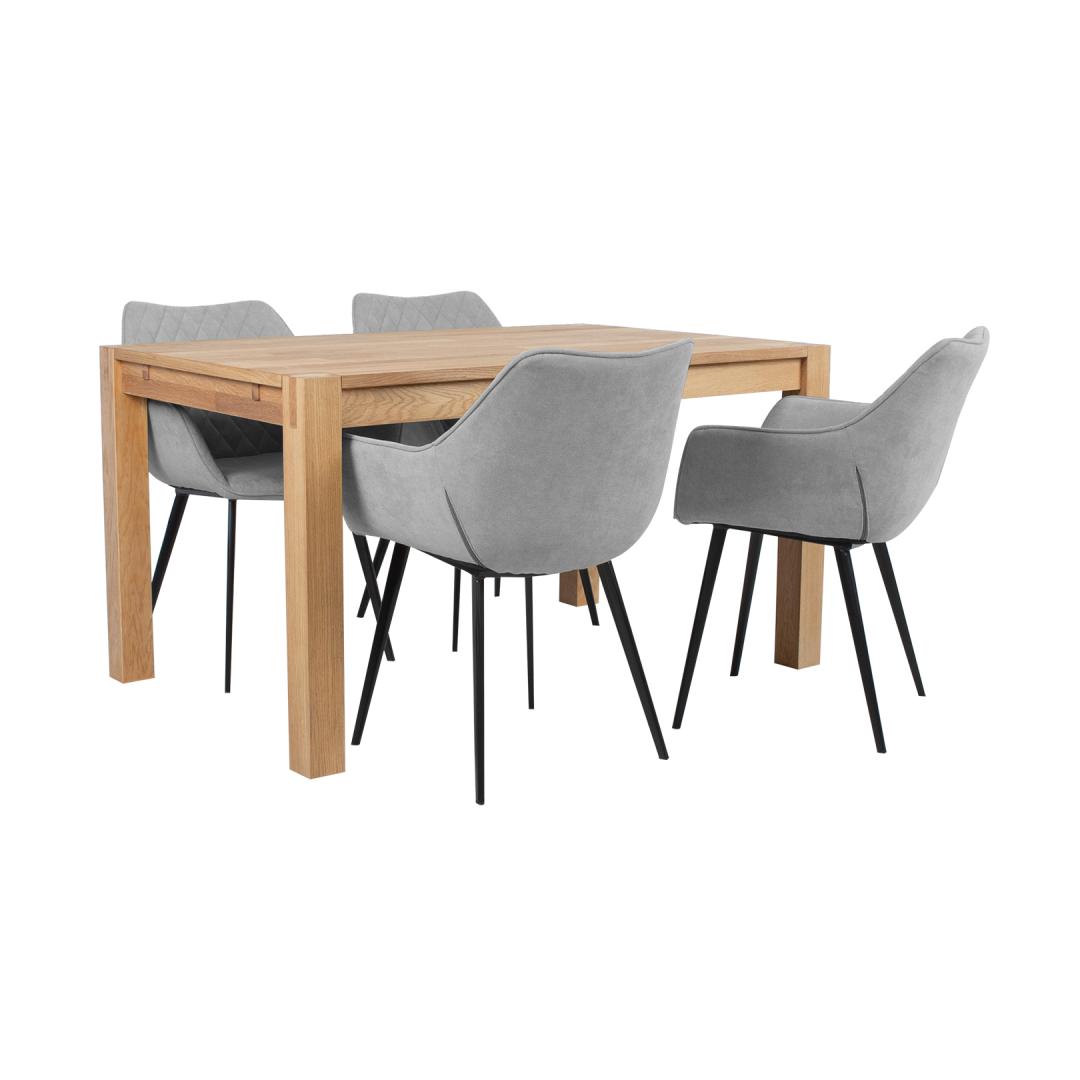 Dining set CHICAGO NEW with 4-chairs (37046). Table 140x90xH76cm. Table leg 8x8cm. Legs are made of lower-grade hardwood and covered with oak veneer. Extension plate 45x90cm is available separately, item code 84026. Extension plate can be mount at both ends of the table. Chair 61x60,5xH47/84cm, grey fabric, black metal legs. Max weight capacity 100kg. Söögilauakomplekt CHICAGO NEW 4-tooliga (37046). Laud 140x90xH76cm. Lauaplaat: MDF naturaalse tammespooniga. Lauajalg 8x8cm, täispuit. Lauale on võimalik juurde osta pikendus 45x90cm koodiga 84026. Pikendus on võimalik paigaldada laua mõlemasse otsa. Tool 61x60,5xH47/84cm, hall kangas, mustad metallist jalad. Kaalupiirang: 100kg.