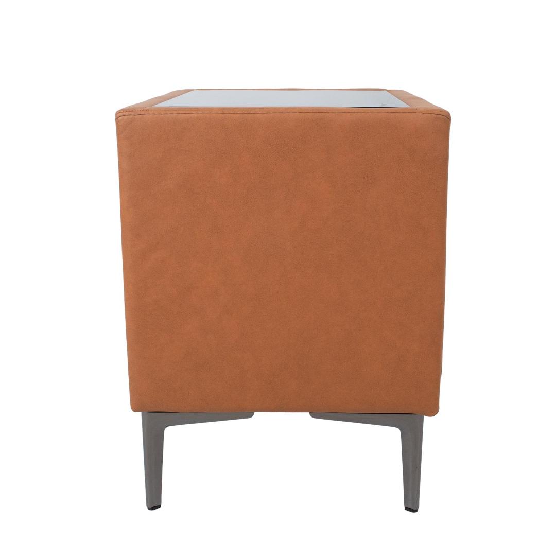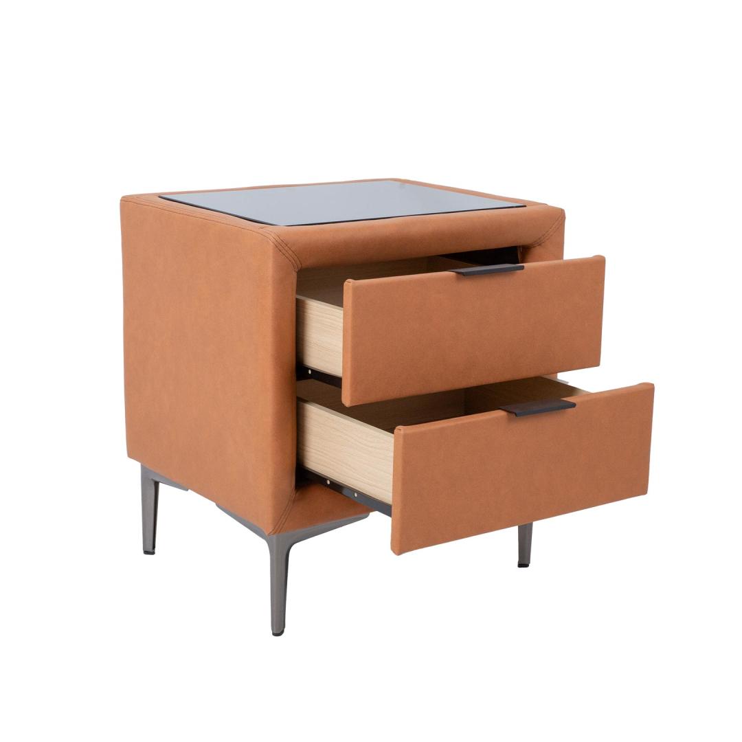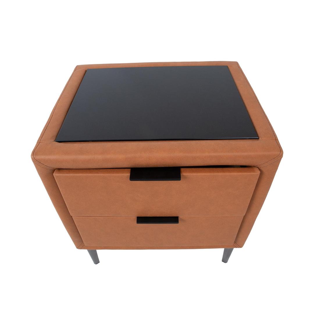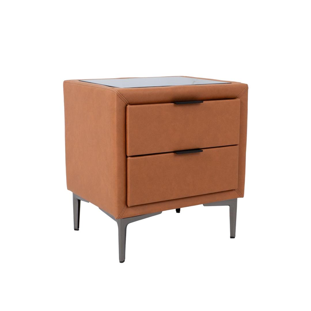 Nightstand LENA 50,5x41xH54cm, cognac brown. The body of the nightstand is made of furniture board and covered with a new leather-like material (Leathaire), which combines the beautiful texture of leather and the warmth of fabric. Leathaire is an ideal furniture covering material because it is highly breathable, water-repellent, scratch-resistant, and very durable. The nightstand has a tempered glass top and dark metal legs and drawer handles. Öökapp LENA 2-sahtliga 50,5x41xH54cm, konjakipruun. Öökapi korpus on valmistatud mööbliplaadist ja kaetud uudse kunstnahka meenutava materjaliga (Leathaire), mis ühendab endas naha kauni tekstuuri ning kanga soojuse. Leathaire on ideaalne mööblikattematerjal, sest on hästi hingav, vett hülgav, kriimustuste kindel ning väga vastupidav. Öökapi peal on tume karastatud klaasist plaat. Öökapil on tumedad metallist jalad ja sahtlite käepidemed.