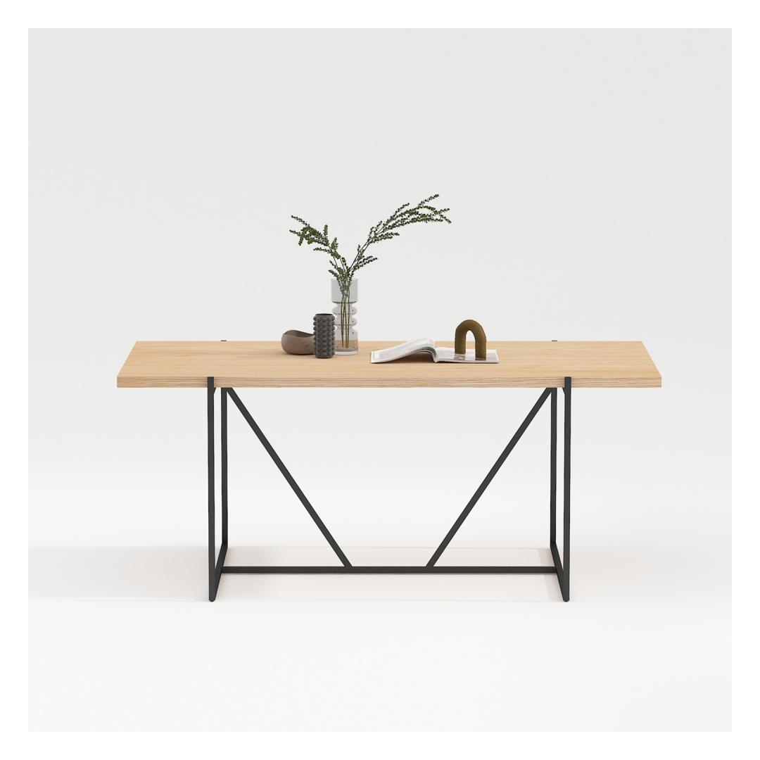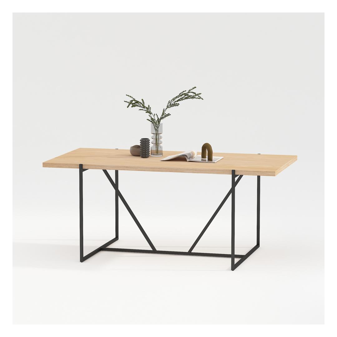 Dining table CINDY 180x90xH75cm, melamine oak. Tabletop: melamine board with light oak bark. Table legs and base frame are made of metal and finished with black powder coating. Söögilaud CINDY 180x90xH75cm, melamiin tamm. Lauplaat: hele tammedekooriga melamiinplaat. Laua jalad ja alusraam on valmistatud metallist ja viimistletud musta pulbervärviga.