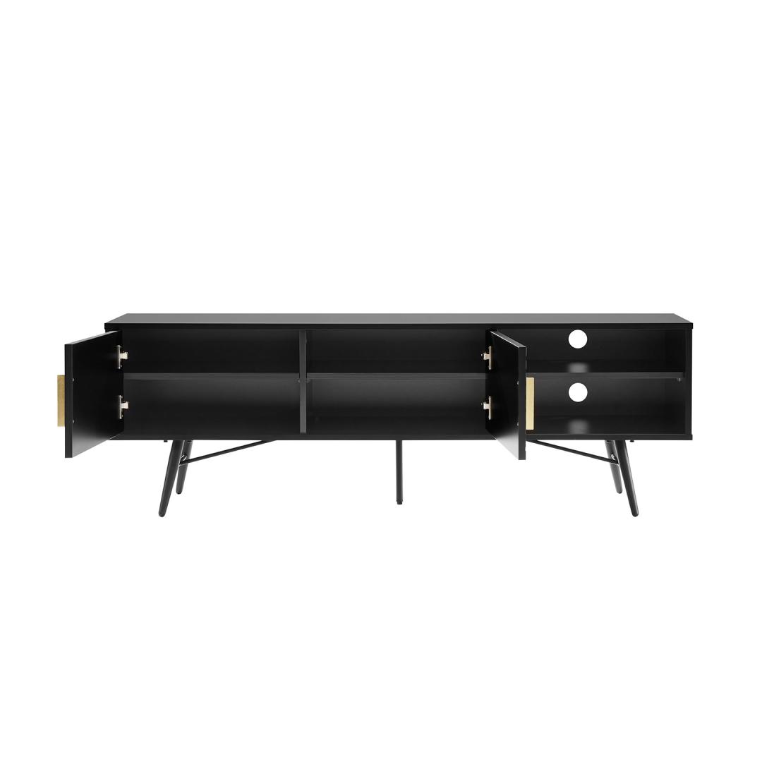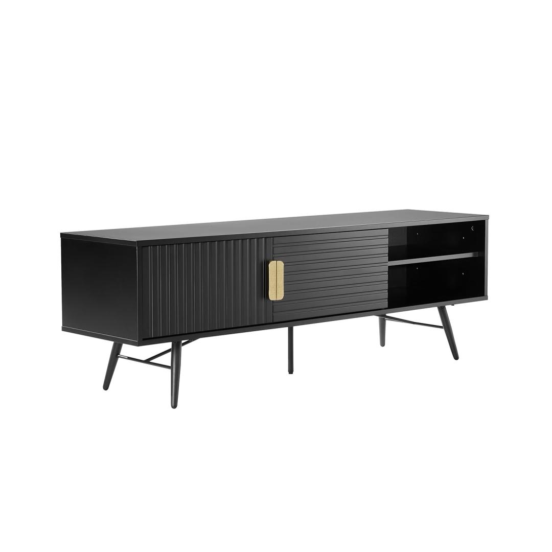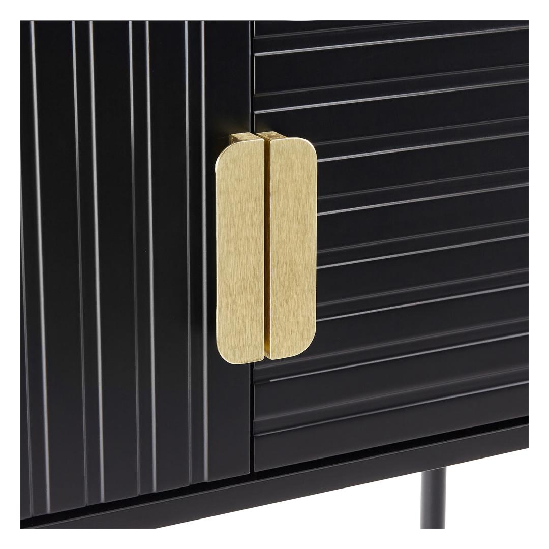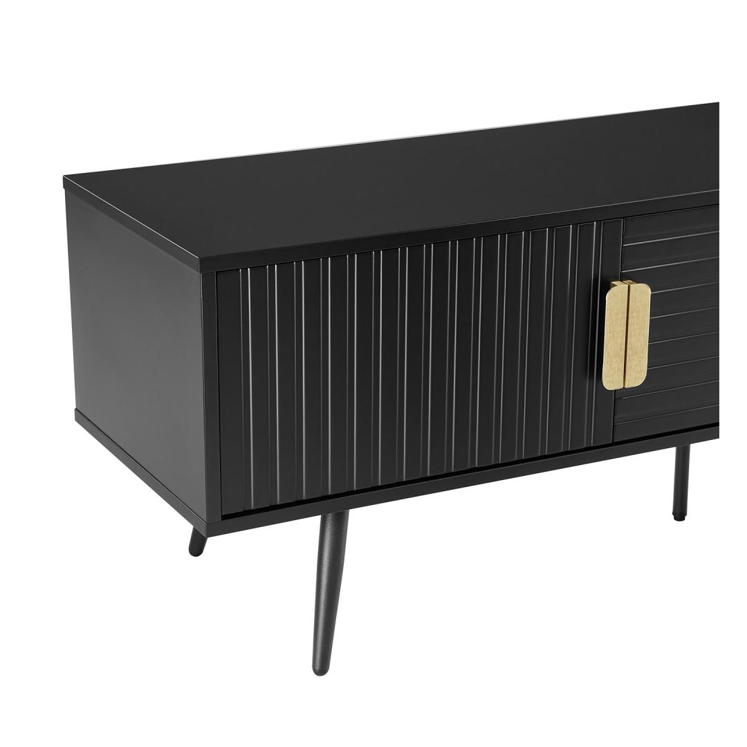 TV laud PIXAR 150x40xH50cm, must. Mööbliplaadist valmistatud TV laud on viimistletud musta polüuretaanvärviga. Ribipaneelist uksed ja kuldsed käepidemed annavad lauale pilkupüüdva välimuse. TV laua jalad ja alusraam on valmistatud metallist. TV laud PIXAR 150x40xH50cm, must. Mööbliplaadist valmistatud TV laud on viimistletud musta polüuretaanvärviga. Ribipaneelist uksed ja kuldsed käepidemed annavad lauale pilkupüüdva välimuse. TV laua jalad ja alusraam on valmistatud metallist.