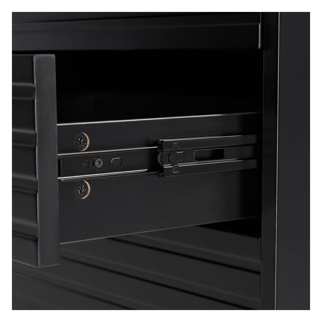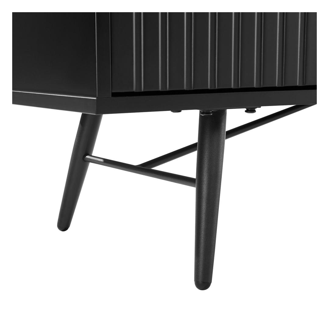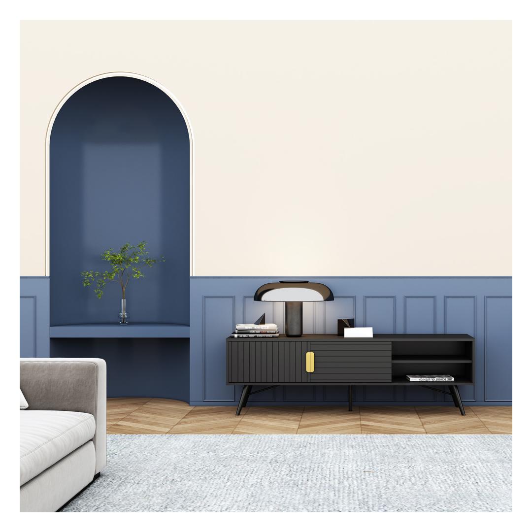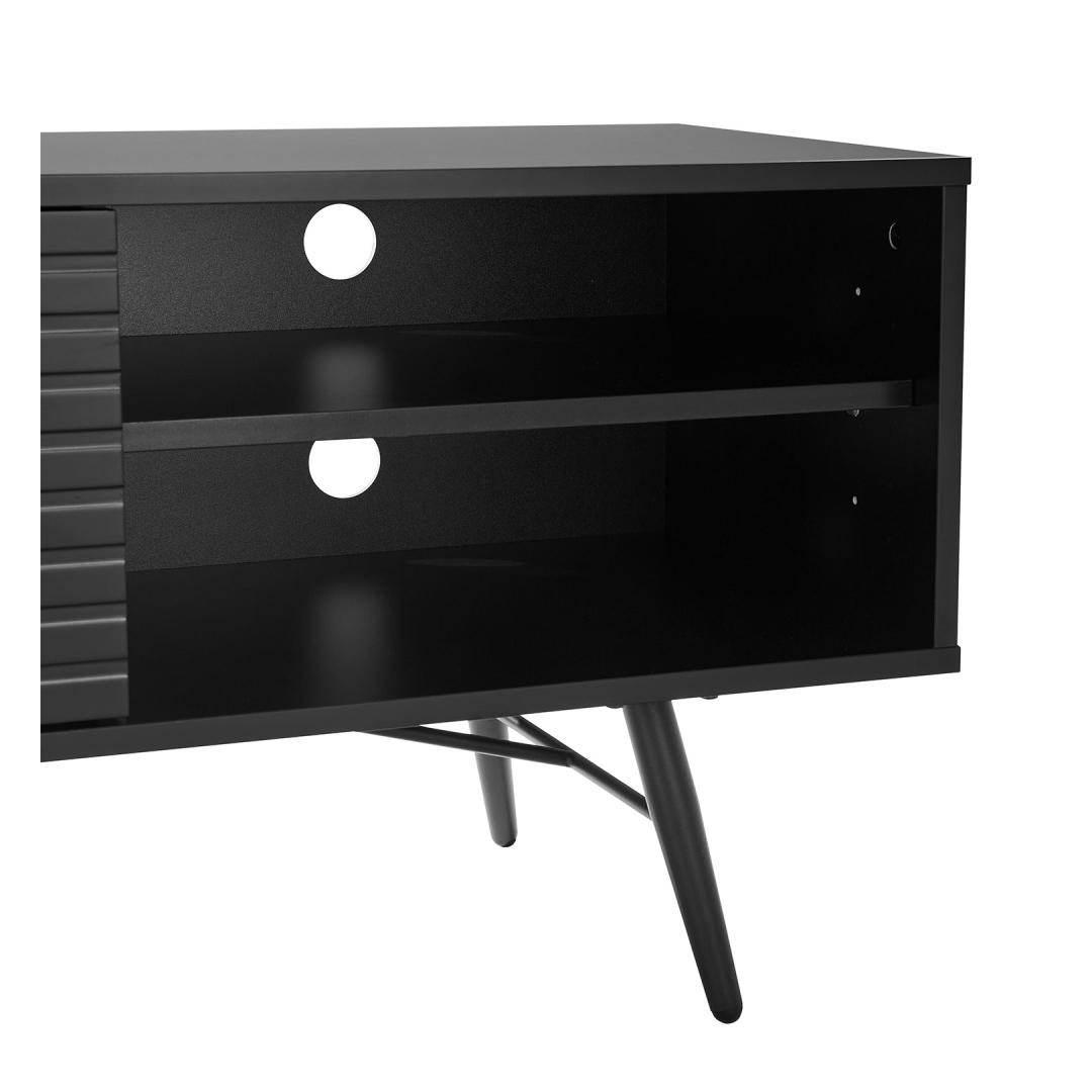 TV laud PIXAR 150x40xH50cm, must. Mööbliplaadist valmistatud TV laud on viimistletud musta polüuretaanvärviga. Ribipaneelist uksed ja kuldsed käepidemed annavad lauale pilkupüüdva välimuse. TV laua jalad ja alusraam on valmistatud metallist. TV laud PIXAR 150x40xH50cm, must. Mööbliplaadist valmistatud TV laud on viimistletud musta polüuretaanvärviga. Ribipaneelist uksed ja kuldsed käepidemed annavad lauale pilkupüüdva välimuse. TV laua jalad ja alusraam on valmistatud metallist.