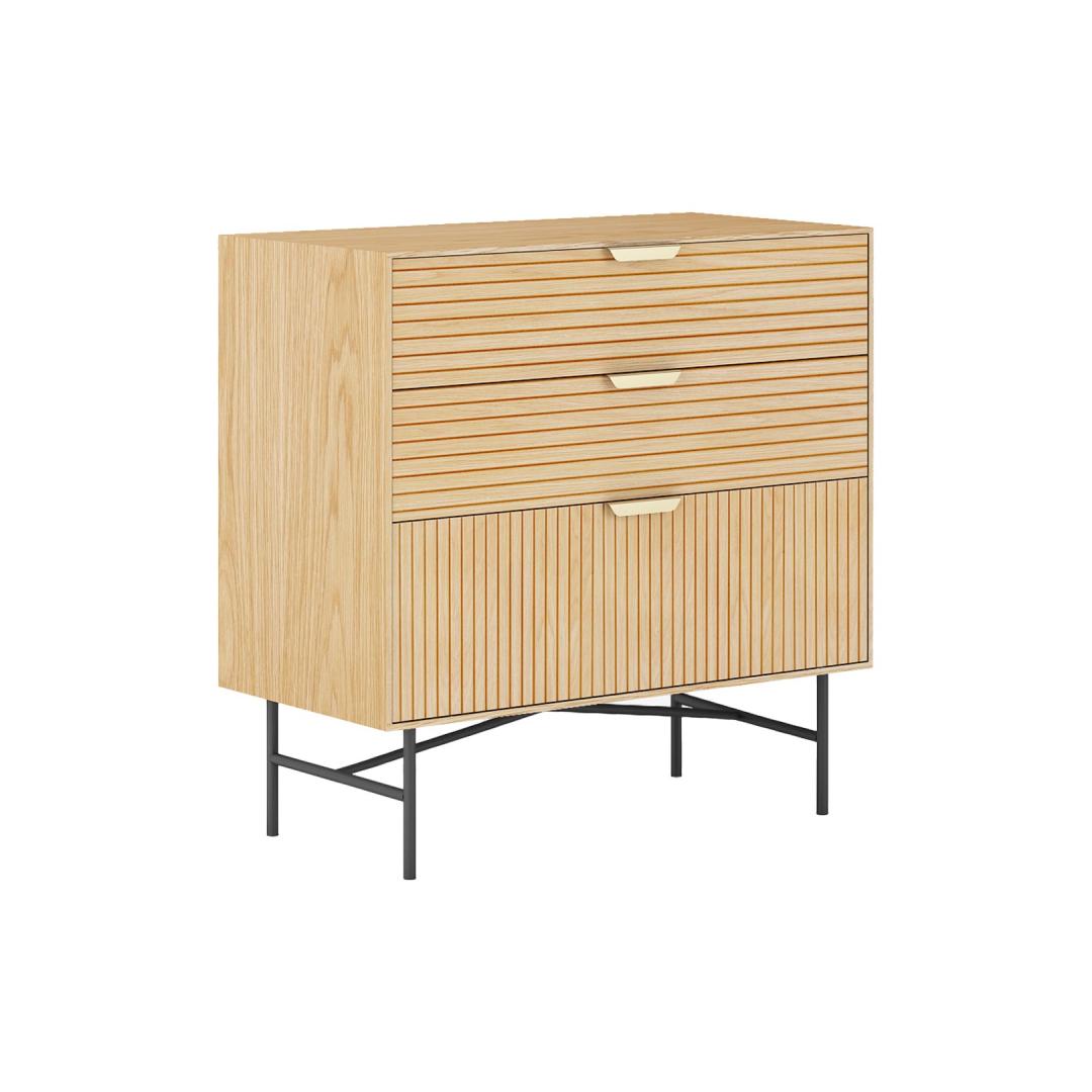 Kummut BASSEL 3-sahtliga 80x40xH80cm, 3D melamiin. Kummut on valmistatud heleda puidudekooriga melamiinplaadist. Erisuunalised, ribilised esipaneelid ja kuldsed käepidemed annavad kummutile trendika välimuse. Metallist jalad ja alusraam on viimistletud musta pulbervärviga. Kummut BASSEL 3-sahtliga 80x40xH80cm, 3D melamiin. Kummut on valmistatud heleda puidudekooriga melamiinplaadist. Erisuunalised, ribilised esipaneelid ja kuldsed käepidemed annavad kummutile trendika välimuse. Metallist jalad ja alusraam on viimistletud musta pulbervärviga.