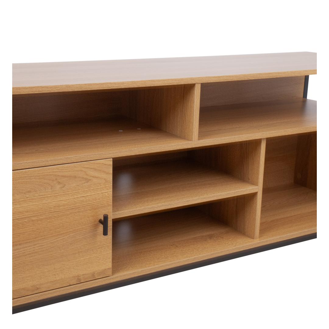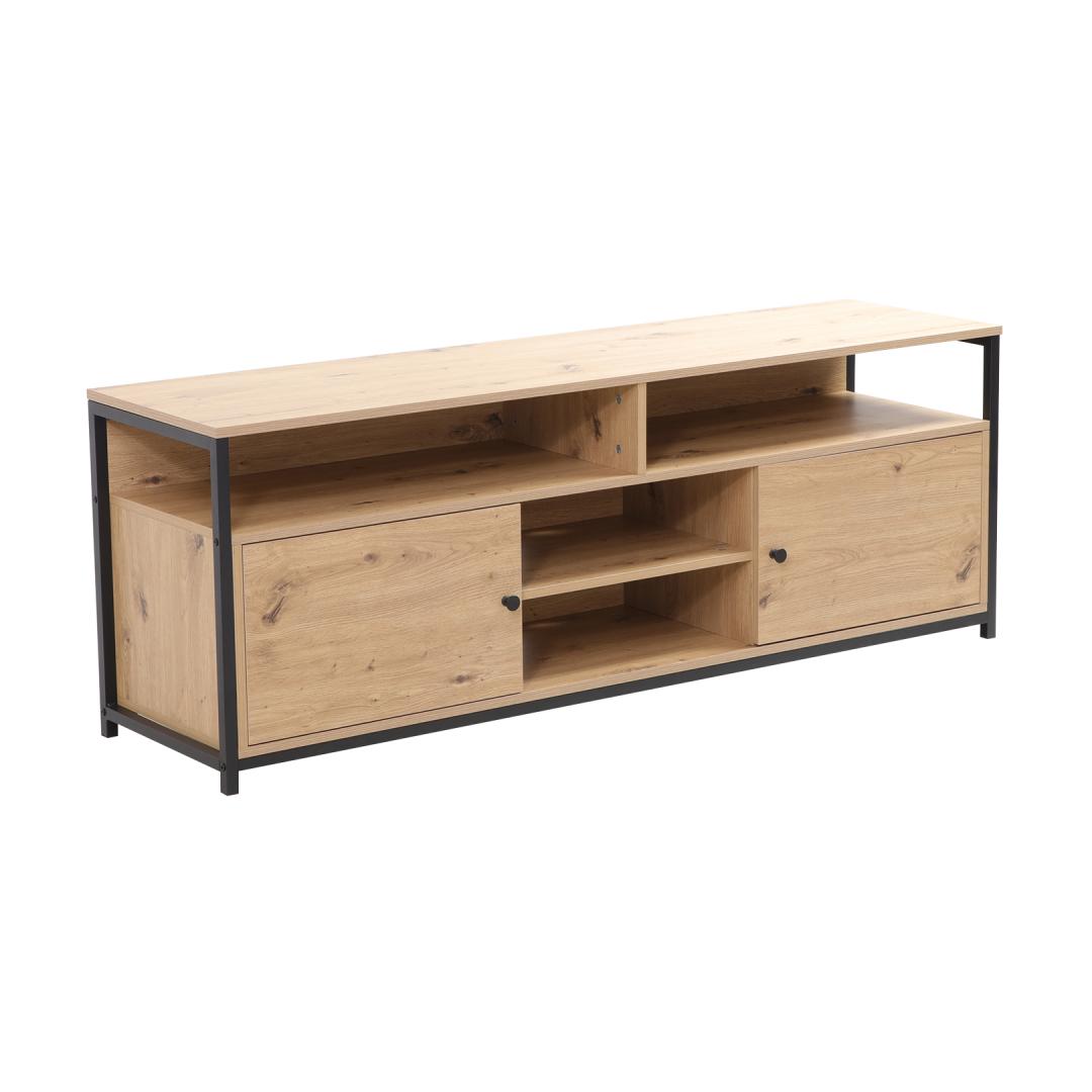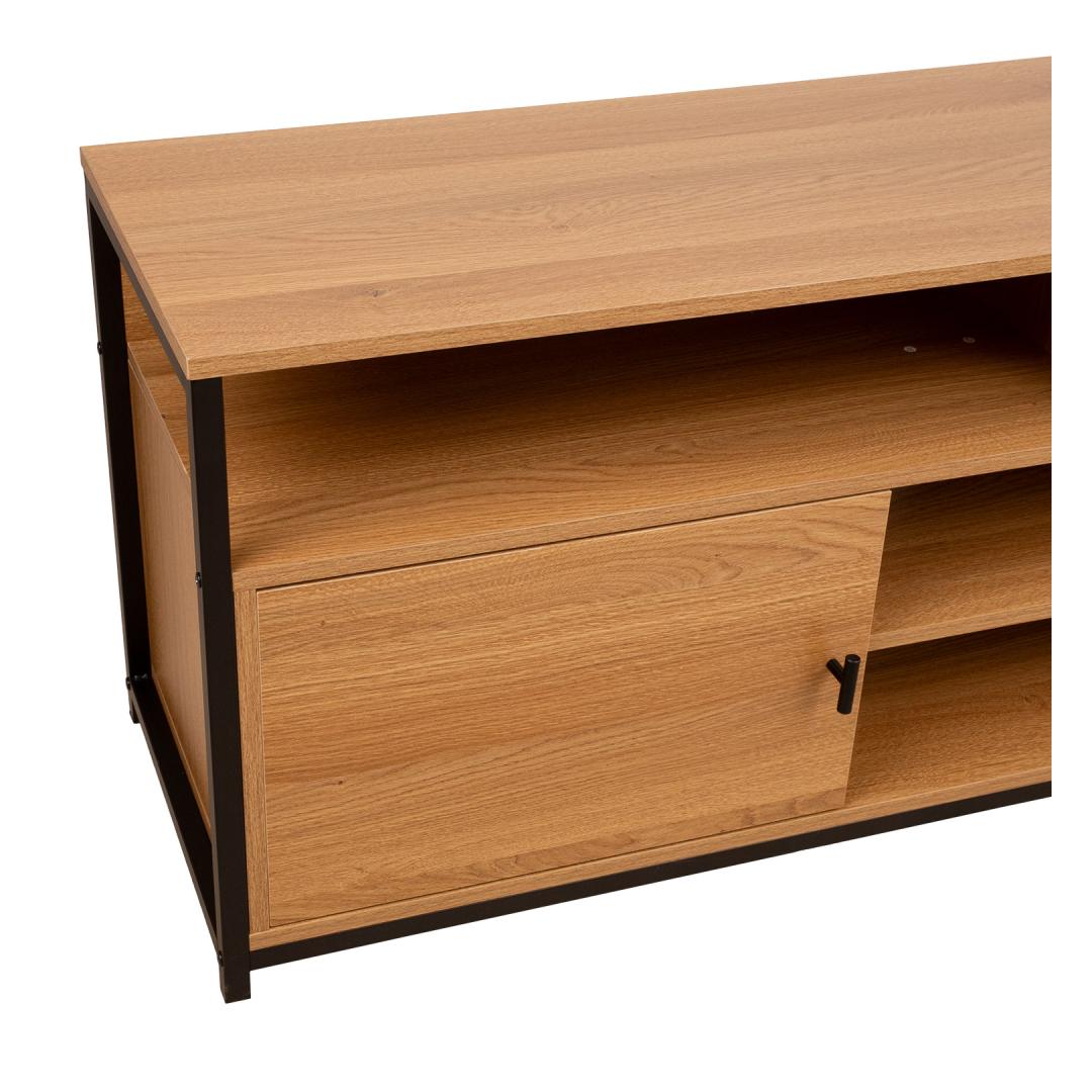 TV table STUDY 150x40xH54cm, oak/black. Body and doors: melamine board with oak decor. The frame is made of metal and finished with a black powder coating. TV laud STUDY 150x40xH54cm, tamm/must. Korpus ja uksed: tamme dekooriga melamiinplaat. Raam on valmistatud metallist ja viimistletud musta pulbervärviga.