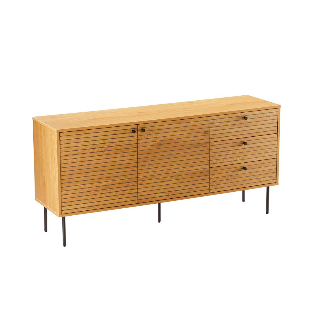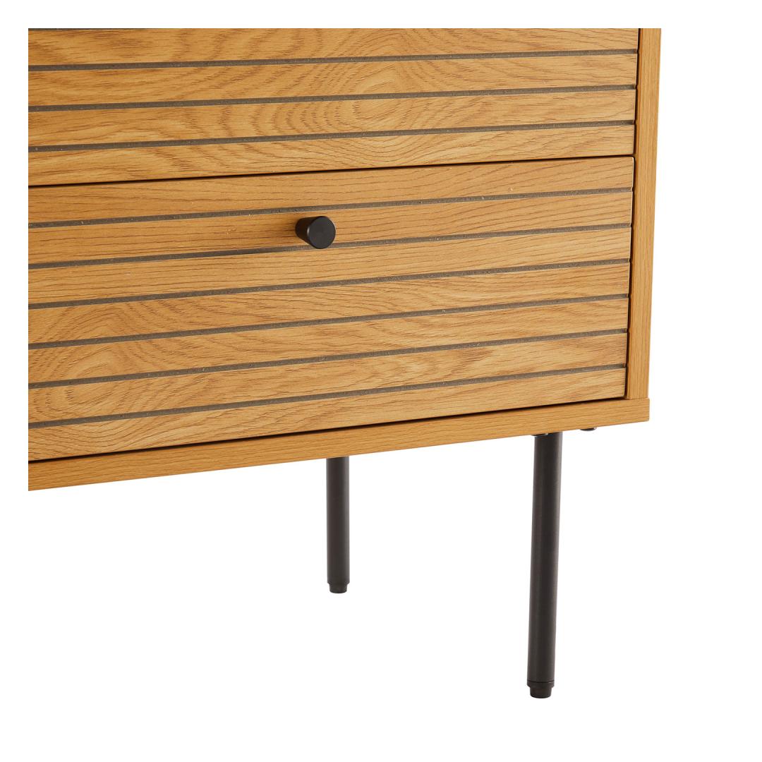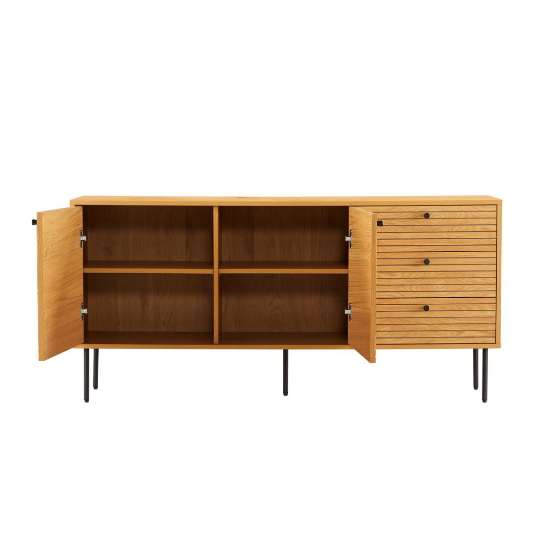 Sideboard LINE with 2-doors and 3-drawers 150x40xH74cm. The sideboard is made of melamine board with oak bark. The striped drawer fronts and door panels with an embossed surface are made of black MDF board, and decorated with narrow oak-colored slats. The metal legs of the sideboard are finished with a black powder coating. Kummut LINE 2-ukse ja 3-sahtliga 150x40xH74cm. Kummut on valmistatud tammedekooriga melamiinplaadist. Efektsed reljeefse pinnaga triibulised sahtlite esipaneelid ja uksed on valmistatud mustast MDF plaadist, mida kaunistavad tammevärvi kitsad liistud. Kummuti metallist jalad on viimistletud musta pulbervärviga.