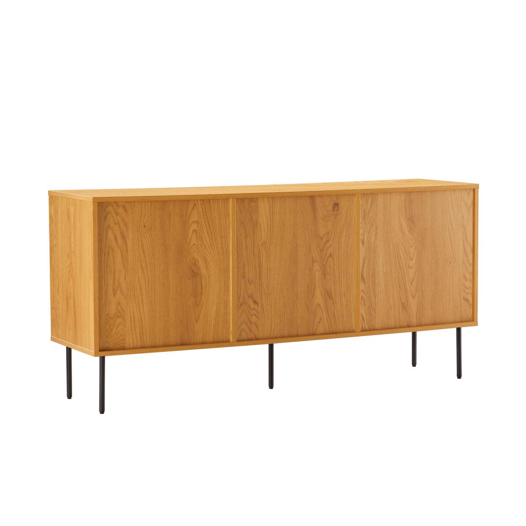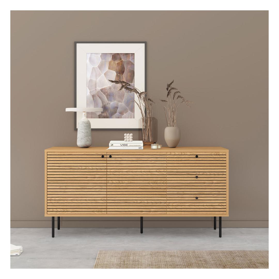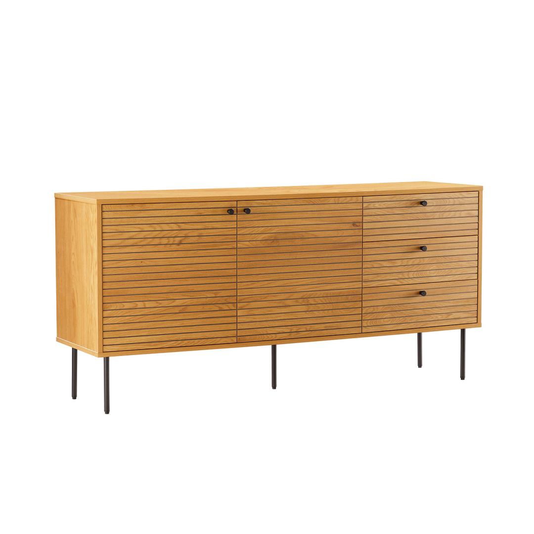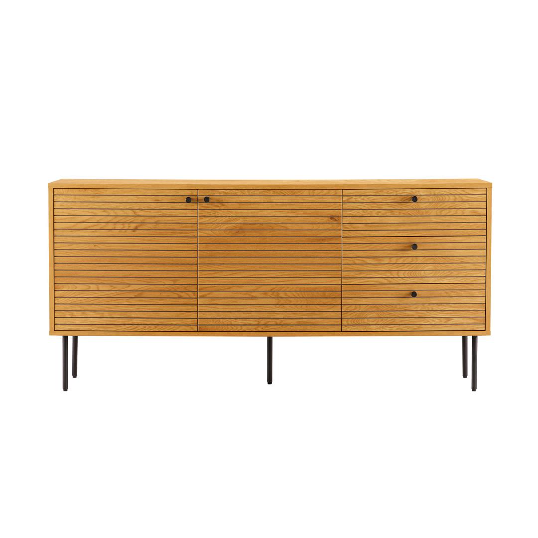 Sideboard LINE with 2-doors and 3-drawers 150x40xH74cm. The sideboard is made of melamine board with oak bark. The striped drawer fronts and door panels with an embossed surface are made of black MDF board, and decorated with narrow oak-colored slats. The metal legs of the sideboard are finished with a black powder coating. Kummut LINE 2-ukse ja 3-sahtliga 150x40xH74cm. Kummut on valmistatud tammedekooriga melamiinplaadist. Efektsed reljeefse pinnaga triibulised sahtlite esipaneelid ja uksed on valmistatud mustast MDF plaadist, mida kaunistavad tammevärvi kitsad liistud. Kummuti metallist jalad on viimistletud musta pulbervärviga.