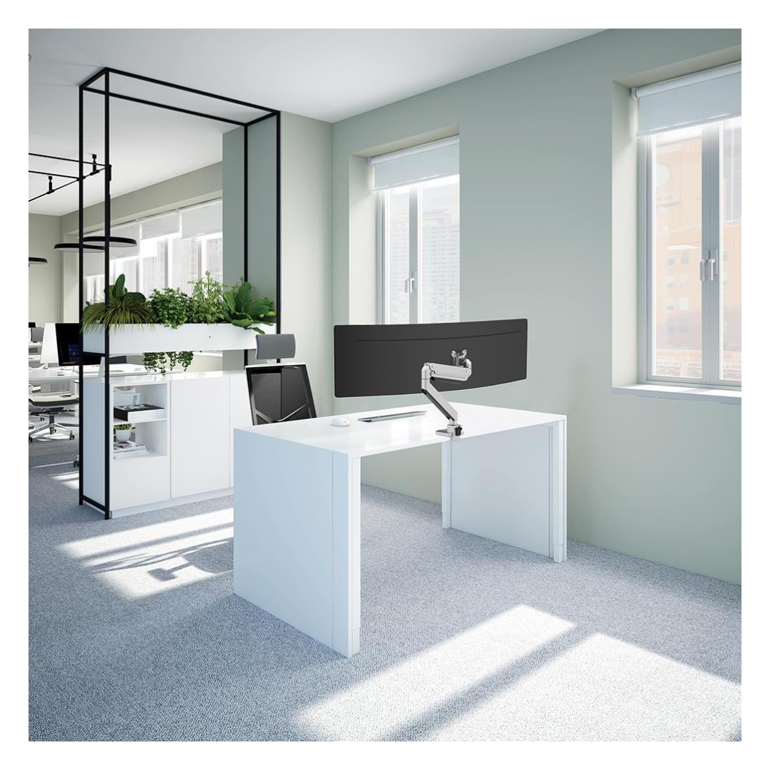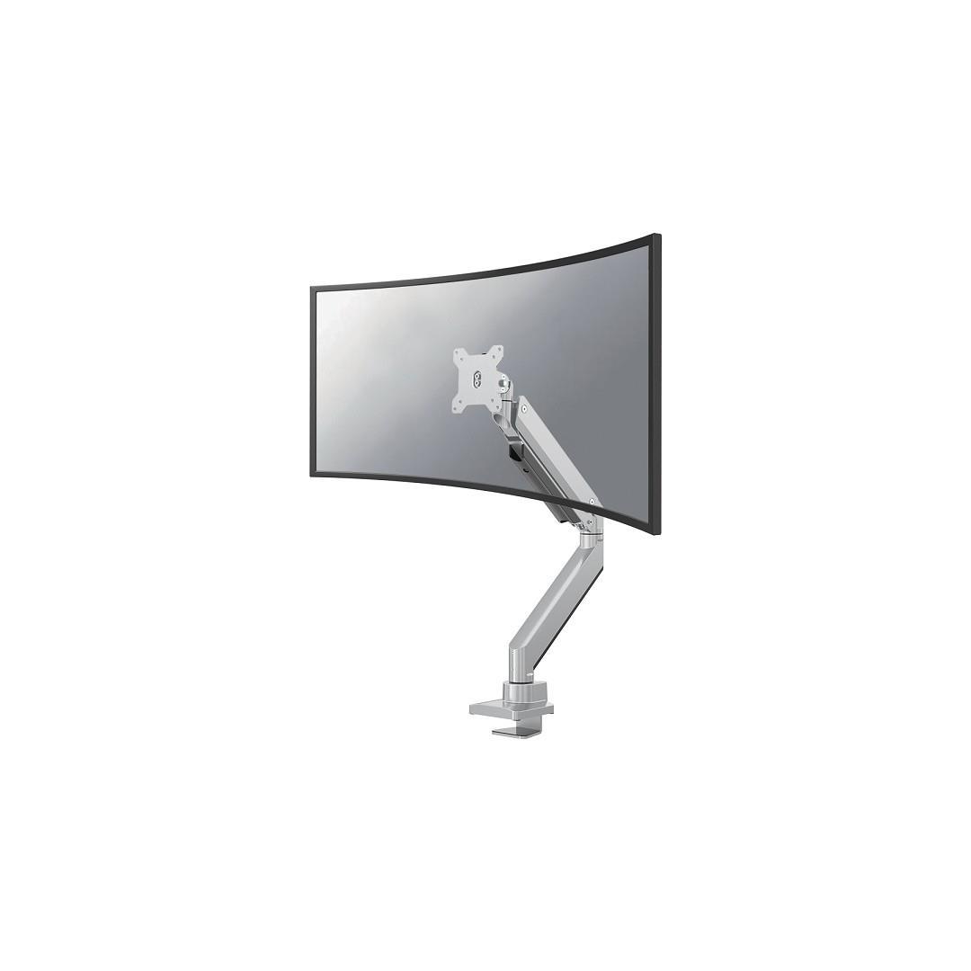 The Neomounts Select NM-D775SILVERPLUS is a tilt-, swivel and rotatable desk mount for curved screens up to 49". This mount is a great choice for space saving placement on desks using a top-fix desk clamp or grommet mount. The NM-D775SILVERPLUS mounts are specifically designed to support curved screens. They feature a strengthened head for curved screens and are designed to support a higher total capacity up to 49" and a maximum weight of 18 kg. Neomounts Select's unique tilt (90°), rotate (180°) and swivel (180°/ 360°) technology allows the NM-PLUS mounts to change to any viewing angle for optimal use of the capabilities of the ultra-wide screen. The mount is equipped with a 180° stop mechanism. The mounts are easily adjustable in height to 59 centimetres, using a gas spring. Additionally, the mounts are also adjustable in depth, from 0 to 63 centimetres. A unique cable management conceals and routes cables from mount to the ultra-wide screen. The NM-D775SILVERPLUS desk mounts are ideal for use in offices, on counters and in reception areas. All installation material is included with the product.
