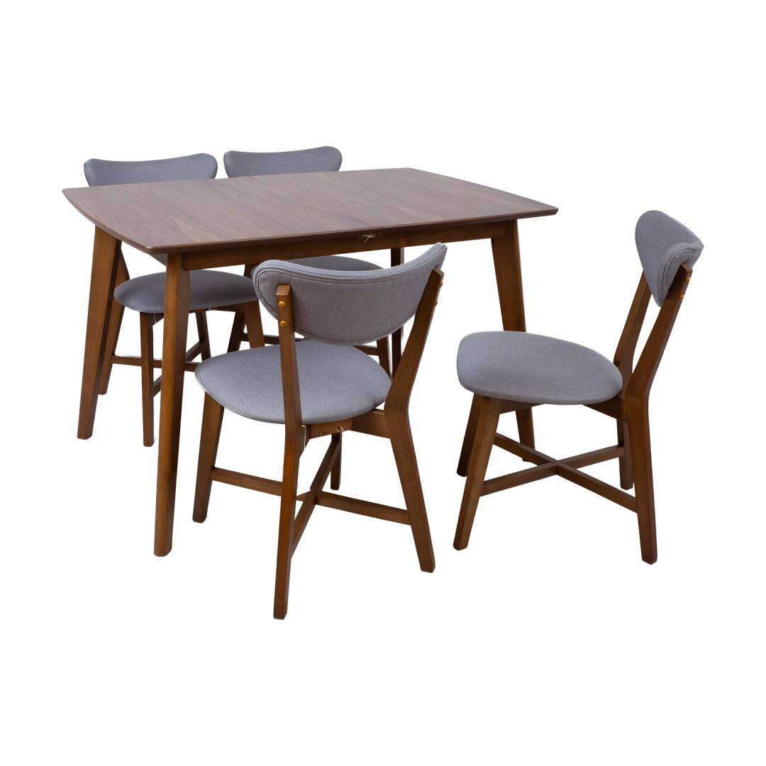 Söögilauakomplekt JESPER 4-tooliga. Lauaplaat: MDF naturaalse pähklispooniga. Laua jalad ja raam on valmistatud kummipuust. Laud on viimistletud pähkli toonis lakiga. Laud on keskelt pikendatav, 40cm lai keskelt kokku klapitav pikendusosa asub lauaplaadi all. Laua mõõdud on 120/160x80xH76cm. Tooli kergelt polsterdatud iste on kaetud halli polüesterkangaga. Tooli jalad ja raam on valmistatud kummipuust ja viimistletud pähkli toonis lakiga. Tooli üldmõõdud on 44x56x79,5cm. Istme kõrgus 45,5cm. Kaalupiirang 100kg. Söögilauakomplekt JESPER 4-tooliga. Lauaplaat: MDF naturaalse pähklispooniga. Laua jalad ja raam on valmistatud kummipuust. Laud on viimistletud pähkli toonis lakiga. Laud on keskelt pikendatav, 40cm lai keskelt kokku klapitav pikendusosa asub lauaplaadi all. Laua mõõdud on 120/160x80xH76cm. Tooli kergelt polsterdatud iste on kaetud halli polüesterkangaga. Tooli jalad ja raam on valmistatud kummipuust ja viimistletud pähkli toonis lakiga. Tooli üldmõõdud on 44x56x79,5cm. Istme kõrgus 45,5cm. Kaalupiirang 100kg.