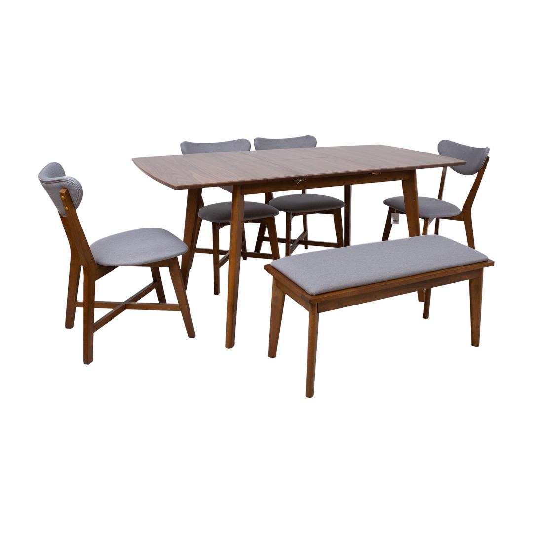 Söögilauakomplekt JESPER 4-tooli ja pingiga. Lauaplaat: MDF naturaalse pähklispooniga. Laua jalad ja raam on valmistatud kummipuust. Laud on viimistletud pähkli toonis lakiga. Laud on keskelt pikendatav, 40cm lai keskelt kokku klapitav pikendusosa asub lauaplaadi all. Laua mõõdud on 120/160x80xH76cm. Tooli kergelt polsterdatud iste on kaetud halli polüesterkangaga. Tooli jalad ja raam on valmistatud kummipuust ja viimistletud pähkli toonis lakiga. Tooli üldmõõdud on 44x56x79,5cm. Istme kõrgus 45,5cm. Kaalupiirang 100kg. Pingi kergelt polsterdatud iste on kaetud halli polüesterkangaga. Pingi jalad ja raam on valmistatud kummipuust ja viimistletud pähkli toonis lakiga. Pingi mõõdud on 92x40xH45cm. Söögilauakomplekt JESPER 4-tooli ja pingiga. Lauaplaat: MDF naturaalse pähklispooniga. Laua jalad ja raam on valmistatud kummipuust. Laud on viimistletud pähkli toonis lakiga. Laud on keskelt pikendatav, 40cm lai keskelt kokku klapitav pikendusosa asub lauaplaadi all. Laua mõõdud on 120/160x80xH76cm. Tooli kergelt polsterdatud iste on kaetud halli polüesterkangaga. Tooli jalad ja raam on valmistatud kummipuust ja viimistletud pähkli toonis lakiga. Tooli üldmõõdud on 44x56x79,5cm. Istme kõrgus 45,5cm. Kaalupiirang 100kg. Pingi kergelt polsterdatud iste on kaetud halli polüesterkangaga. Pingi jalad ja raam on valmistatud kummipuust ja viimistletud pähkli toonis lakiga. Pingi mõõdud on 92x40xH45cm.