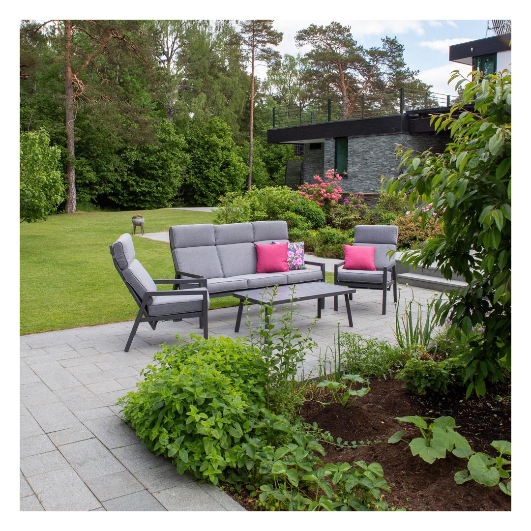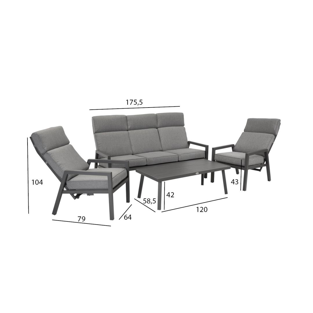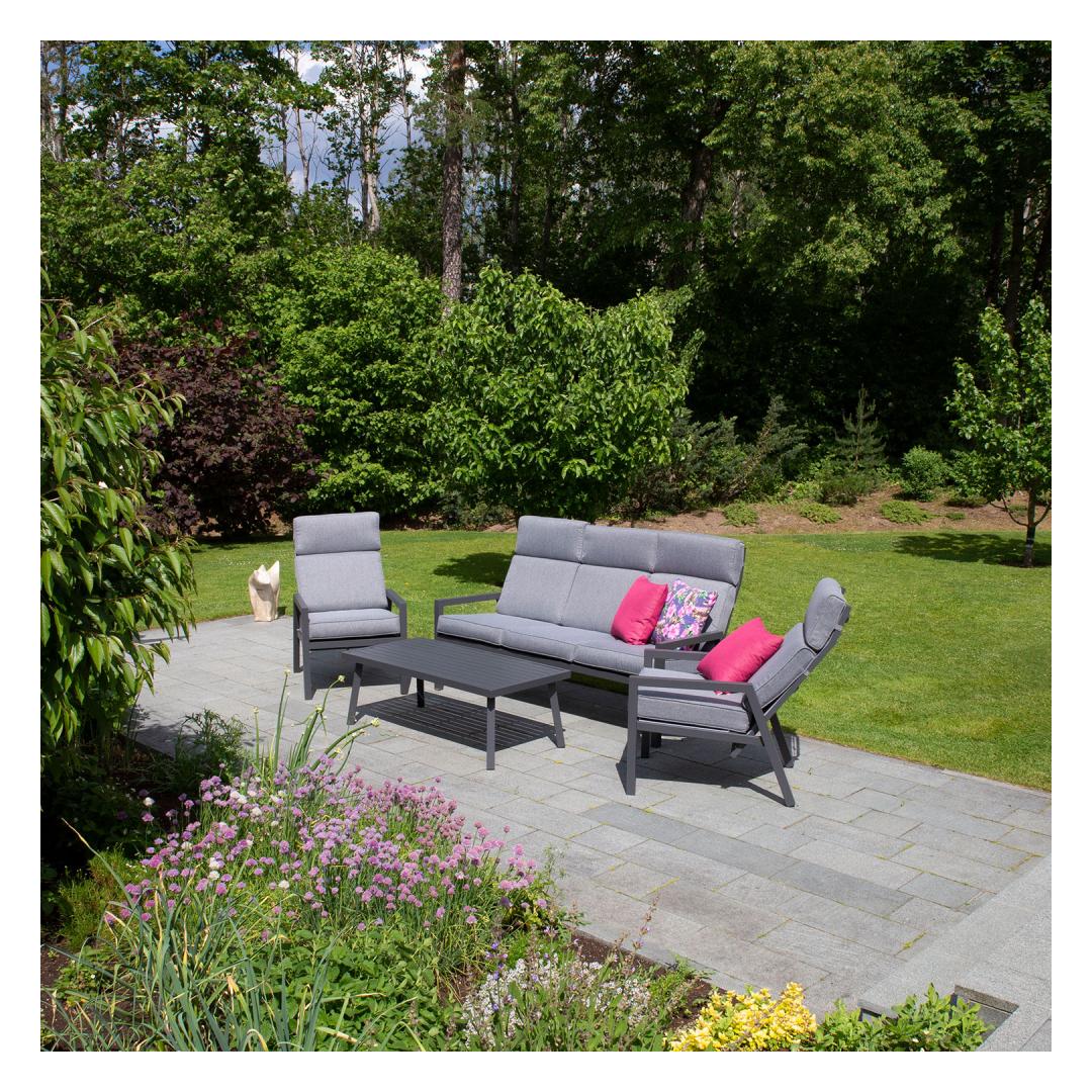 Garden furniture set CASPER table, sofa and 2 chairs. The main construction of all parts of the set and tabletop is made of aluminum and finished with a grey powder coating. Seats and backrests are made of textilene fabric, which is breathable, dries quickly, and is easy to clean. Soft seat cushions are included. The backrests of the armchairs are adjustable. The adjustment lever is located on the right-hand side, under the edge of the seat. Dimensions of the table are 120x58,5xH42cm, dimensions of the sofa and armchairs are 175,5x79xH104cm, 64x79xH104cm. Cushion covers are made of grey polyester fabric. Seat cushion thickness 10cm, back cushion thickness 8cm. The product is durable in changing weather conditions and very easy to maintain, only cushions need protection from the weather. A good solution to protect the cushions and keep them dry is to use a cushion box. To prolong the lifespan of outdoor furniture, we recommend the use of outdoor furniture covers. STORAGE: at the end of the summer season, we recommend storing the garden furniture indoors. Clean and dry the furniture before storing it. Use a dry, well-ventilated room for storage. Aiamööblikomplekt CASPER laud, diivan ja 2 tooli. Kõigi komplekti osade põhikonstruktsioon ja lauaplaat on valmistatud alumiiniumist ja viimistletud halli pulbervärviga. Textilene kangast istmed ja seljatoed lasevad hästi õhku läbi, kuivavad kiiresti ja neid on lihtne puhastada. Pehmed istmepadjad kuuluvad komplekti. Tugitoolide seljatoed on reguleeritavad. Reguleerimiskang asub paremal käel, istme ääre all. Laua mõõdud on 120x58,5xH42cm. Diivani mõõdud 175,5x79xH104cm. Tugitooli mõõdud 64x79xH104cm. Padjakatted on valmistatud hallist polüesterkangast. Istmepatjade paksus 10cm, seljatoepatjade paksus 8cm. Toode on muutlikes ilmastikutingimustes hästi vastupidav ja lihtsalt hooldatav. Kaitset ilmastikuolude eest vajavad ainult padjad. Hea lahendus patjade igapäevaseks hoiustamiseks ja kuivana hoidmiseks on padjakast. Välitingimustes kasutatava mööbli eluea pikendamiseks soovitame kasutada välimööbli katteid. HOIUSTAMINE: suvehooaja lõppedes soovitame aiamööblit hoiustada siseruumides. Puhastage ja kuivatage mööbel enne hoiule panekut. Kasutage hoiustamiseks kuiva ning hea ventilatsiooniga ruumi.