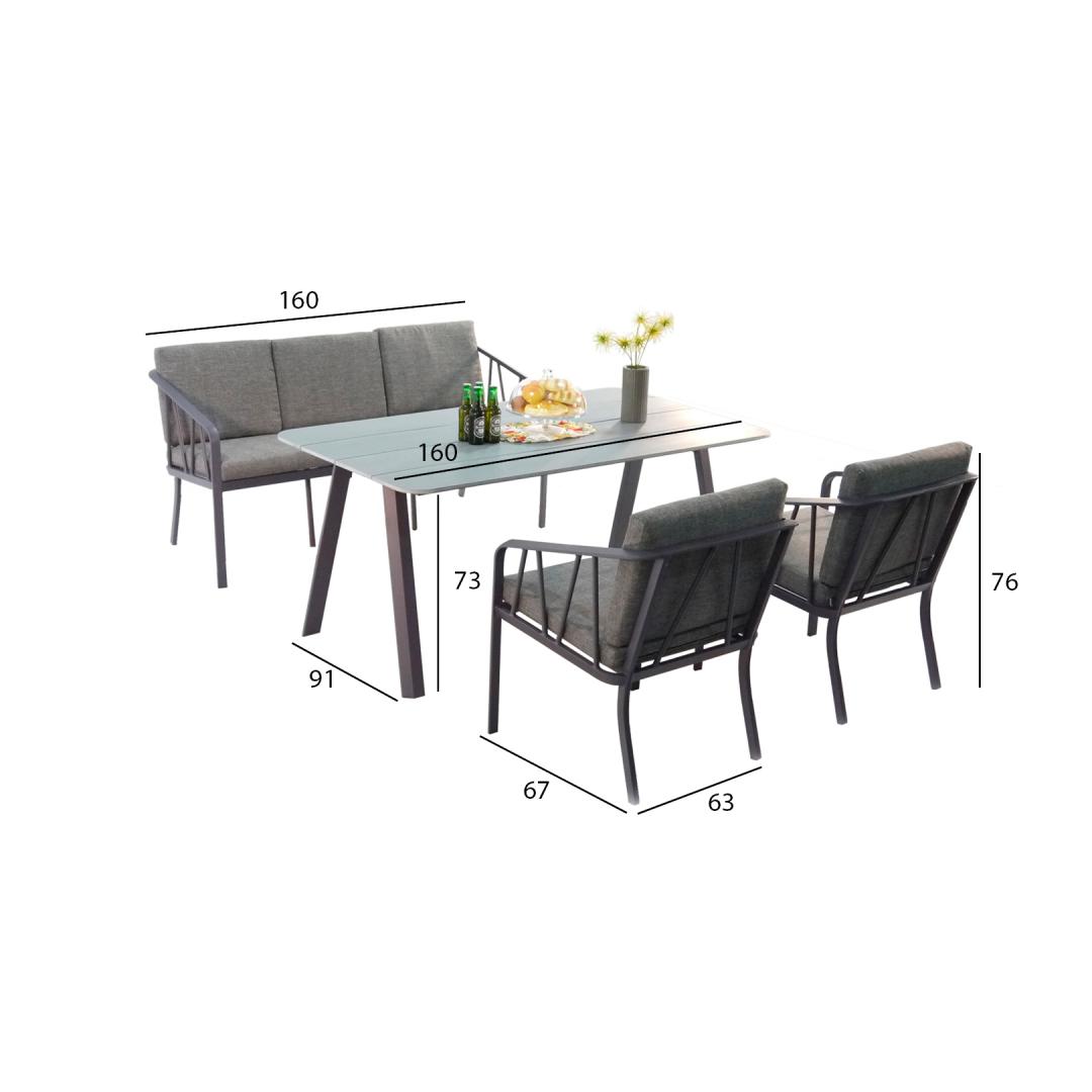 Garden furniture set KAHLA table, sofa and 2 chairs, grey. The frames of the sofa and chairs and the legs and base frame of the table are made of aluminum and finished with purple-gray powder coating. Table top: grey laminated polywood (4 panels 1600x223x15mm). Dimensions of the table are 160x91xH73cm. Dimensions of the chair are 63x67xH76cm, seat cushion 57x54x6cm, back cushion 57x40x6cm. Dimensions of the 3-seater sofa are 160x67xH76cm, seat cushion 3pcs x 51x54x6cm, back cushion 3pcs x 51x40x6cm. Cushion covers are made of grey olefin fabric. Product is durable in changing weather conditions and very easy to maintain, only cushions need protection from the weather. A good solution to protect the cushions and keep them dry is to use a cushion box. To prolong the lifespan of outdoor furniture, we recommend the use of outdoor furniture covers. STORAGE: at the end of the summer season, we recommend storing the garden furniture indoors. Clean and dry the furniture before storing it. Use a dry, well-ventilated room for storage. Aiamööblikomplekt KAHLA laud, diivan ja 2 tooli, hall. Diivani ja toolide raamid, lauajalad ja alusraam on valmistatud alumiiniumist ning kaetud lillakashalli pulbervärviga. Lauaplaat: hall lamineeritud kunstpuit (4 paneeli 1600x223x15mm). Laua mõõdud on 160x91xH73cm. Tooli mõõdud on 63x67xH76cm, istmepadi 57x54x6cm, seljatoepadi 57x40x6cm. 3-kohalise diivani mõõdud on 160x67xH76cm, istmepadi 3tk - 51x54x6cm, seljatoepadi 3tk - 51x40x6cm. Padjakatted on valmistatud hallist olefin kangast. Toode on muutlikes ilmastikutingimustes hästi vastupidav ja lihtsalt hooldatav. Kaitset ilmastikuolude eest vajavad ainult padjad. Hea lahendus patjade igapäevaseks hoiustamiseks ja kuivana hoidmiseks on padjakast. Välitingimustes kasutatava mööbli eluea pikendamiseks soovitame kasutada välimööbli katteid. HOIUSTAMINE: suvehooaja lõppedes soovitame aiamööblit hoiustada siseruumides. Puhastage ja kuivatage mööbel enne hoiule panekut. Kasutage hoiustamiseks kuiva ning hea ventilatsiooniga ruumi.