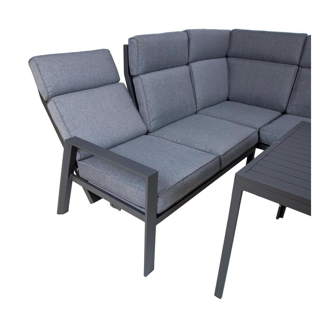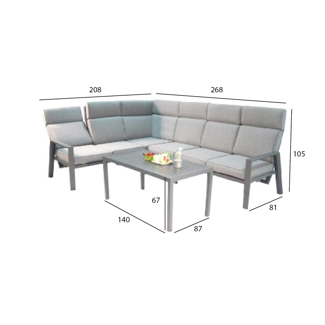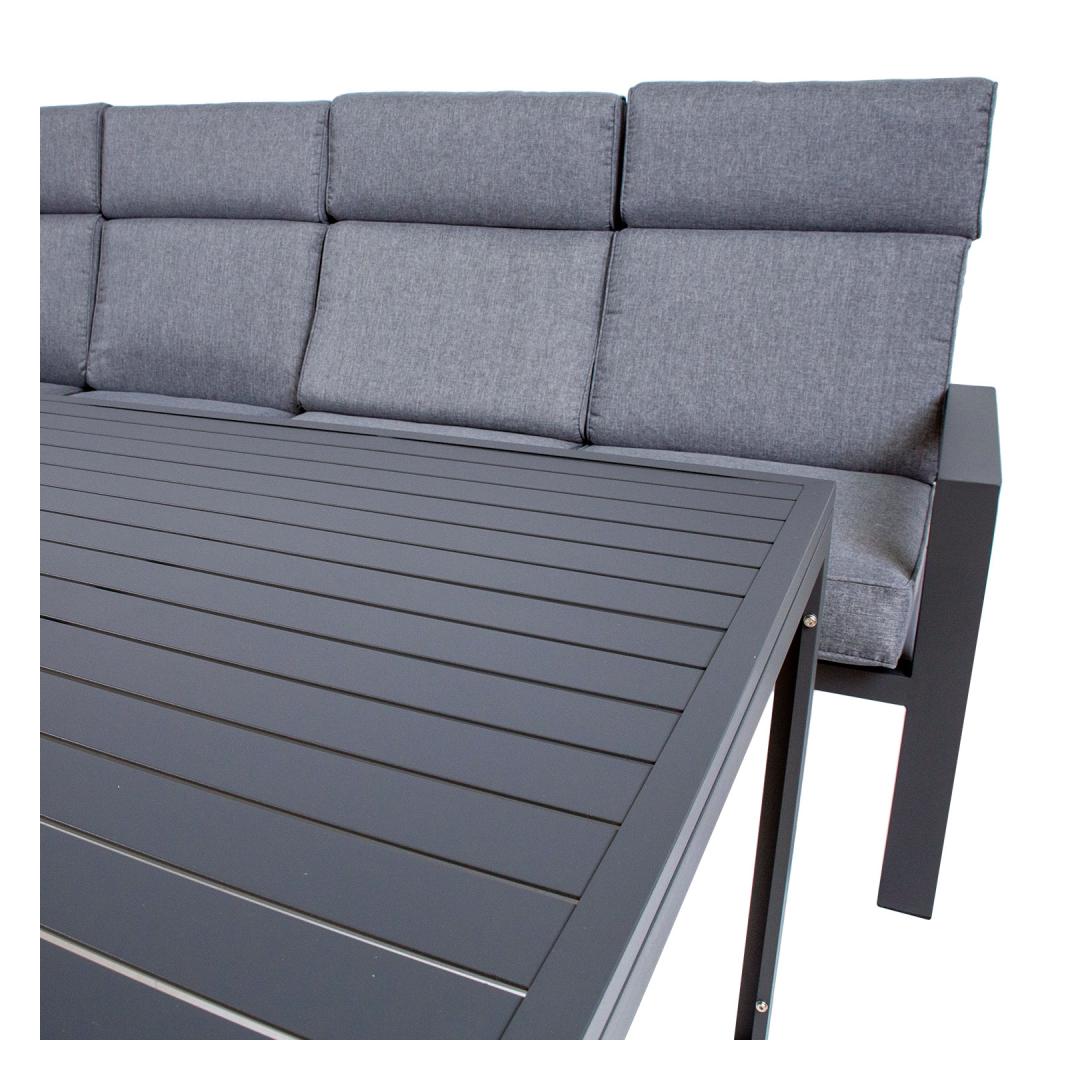 Garden furniture set CASTEN table and corner sofa. The main construction of all parts of the set and tabletop is made of aluminum and finished with a dark grey powder coating. Seats and backrests are made of textilene fabric, which is breathable, dries quickly, and is easy to clean. Thick cushions ensure excellent sitting comfort. The backrest of the sofa seat with armrest (left and right) is adjustable. The adjustment lever is located under the edge of the seat. The dimensions of the table are 140x87xH67cm. Corner sofa consist of 3-parts: 2-seater with right arm 127x81xH105cm, 2-seater with left arm 127x81xH105cm, corner 141x81xH105cm. Set includes 6 seat cushions 60x60x10cm and 7 back cushions 60x65x8cm. Cushion covers are made of grey polyester fabric. The product is durable in changing weather conditions and very easy to maintain, only cushions need protection from the weather. A good solution to protect the cushions and keep them dry is to use a cushion box. To prolong the lifespan of outdoor furniture, we recommend the use of outdoor furniture covers. STORAGE: at the end of the summer season, we recommend storing the garden furniture indoors. Clean and dry the furniture before storing it. Use a dry, well-ventilated room for storage. Aiamööblikomplekt CASTEN laud ja nurgadiivan. Kõigi komplekti osade põhikonstruktsioon ja lauaplaat on valmistatud alumiiniumist ja viimistletud tumehalli pulbervärviga. Textilene kangast istmed ja seljatoed lasevad hästi õhku läbi, kuivavad kiiresti ja neid on lihtne puhastada. Diivani käetoega istme seljatugi (vasakul ja paremal) on reguleeritav. Reguleerimiskang asub istme ääre all. Paksud padjad tagavad suurepärase istumismugavuse. Laua mõõdud on 140x87xH67cm. Nurgadiivan koosneb 3-st osast: parema käetoega 2-kohaline osa 127x81xH105cm, vasaku käetoega 2-kohaline osa 127x81xH105cm, nurk 141x81xH105cm. Komplekti kuulub 6 istmepatja 60x60x10cm ja 7 seljatoepatja 60x65x8cm. Padjakatted on valmistatud hallist polüesterkangast. Toode on muutlikes ilmastikutingimustes hästi vastupidav ja lihtsalt hooldatav. Kaitset ilmastikuolude eest vajavad ainult padjad. Hea lahendus patjade igapäevaseks hoiustamiseks ja kuivana hoidmiseks on padjakast. Välitingimustes kasutatava mööbli eluea pikendamiseks soovitame kasutada välimööbli katteid. HOIUSTAMINE: suvehooaja lõppedes soovitame aiamööblit hoiustada siseruumides. Puhastage ja kuivatage mööbel enne hoiule panekut. Kasutage hoiustamiseks kuiva ning hea ventilatsiooniga ruumi.