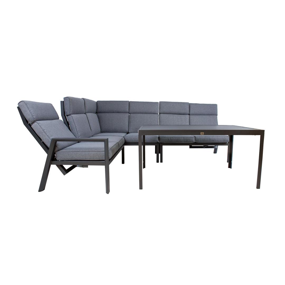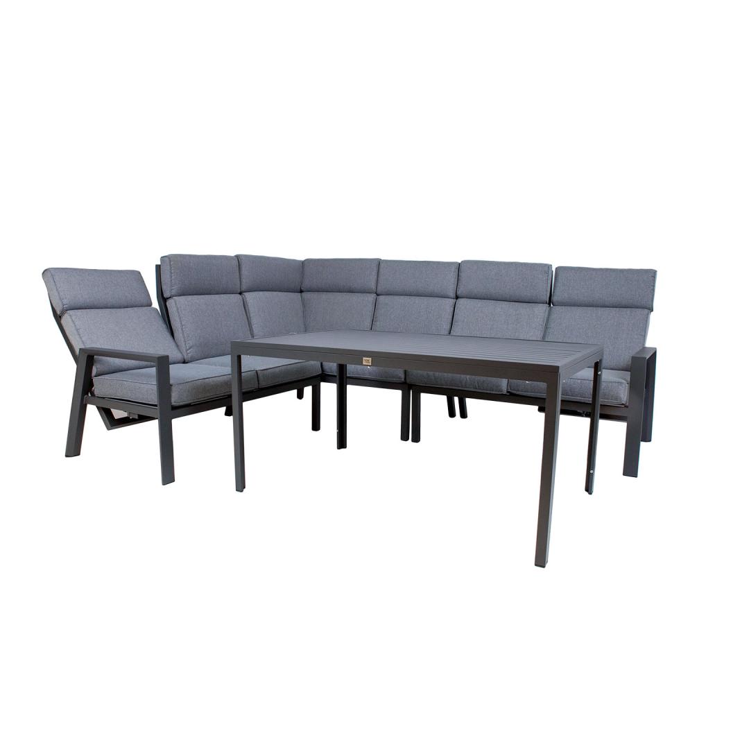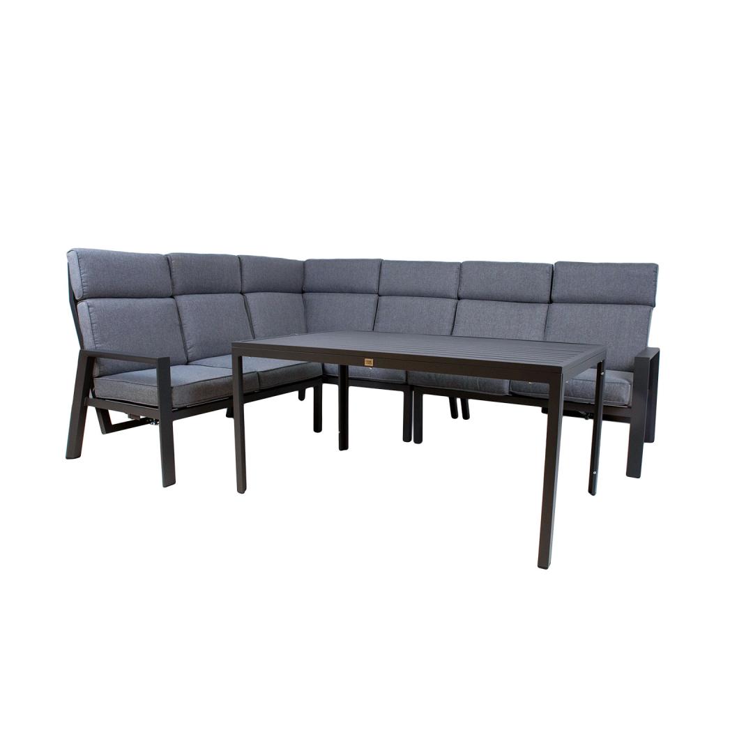 Garden furniture set CASTEN table and corner sofa. The main construction of all parts of the set and tabletop is made of aluminum and finished with a dark grey powder coating. Seats and backrests are made of textilene fabric, which is breathable, dries quickly, and is easy to clean. Thick cushions ensure excellent sitting comfort. The backrest of the sofa seat with armrest (left and right) is adjustable. The adjustment lever is located under the edge of the seat. The dimensions of the table are 140x87xH67cm. Corner sofa consist of 3-parts: 2-seater with right arm 127x81xH105cm, 2-seater with left arm 127x81xH105cm, corner 141x81xH105cm. Set includes 6 seat cushions 60x60x10cm and 7 back cushions 60x65x8cm. Cushion covers are made of grey polyester fabric. The product is durable in changing weather conditions and very easy to maintain, only cushions need protection from the weather. A good solution to protect the cushions and keep them dry is to use a cushion box. To prolong the lifespan of outdoor furniture, we recommend the use of outdoor furniture covers. STORAGE: at the end of the summer season, we recommend storing the garden furniture indoors. Clean and dry the furniture before storing it. Use a dry, well-ventilated room for storage. Aiamööblikomplekt CASTEN laud ja nurgadiivan. Kõigi komplekti osade põhikonstruktsioon ja lauaplaat on valmistatud alumiiniumist ja viimistletud tumehalli pulbervärviga. Textilene kangast istmed ja seljatoed lasevad hästi õhku läbi, kuivavad kiiresti ja neid on lihtne puhastada. Diivani käetoega istme seljatugi (vasakul ja paremal) on reguleeritav. Reguleerimiskang asub istme ääre all. Paksud padjad tagavad suurepärase istumismugavuse. Laua mõõdud on 140x87xH67cm. Nurgadiivan koosneb 3-st osast: parema käetoega 2-kohaline osa 127x81xH105cm, vasaku käetoega 2-kohaline osa 127x81xH105cm, nurk 141x81xH105cm. Komplekti kuulub 6 istmepatja 60x60x10cm ja 7 seljatoepatja 60x65x8cm. Padjakatted on valmistatud hallist polüesterkangast. Toode on muutlikes ilmastikutingimustes hästi vastupidav ja lihtsalt hooldatav. Kaitset ilmastikuolude eest vajavad ainult padjad. Hea lahendus patjade igapäevaseks hoiustamiseks ja kuivana hoidmiseks on padjakast. Välitingimustes kasutatava mööbli eluea pikendamiseks soovitame kasutada välimööbli katteid. HOIUSTAMINE: suvehooaja lõppedes soovitame aiamööblit hoiustada siseruumides. Puhastage ja kuivatage mööbel enne hoiule panekut. Kasutage hoiustamiseks kuiva ning hea ventilatsiooniga ruumi.