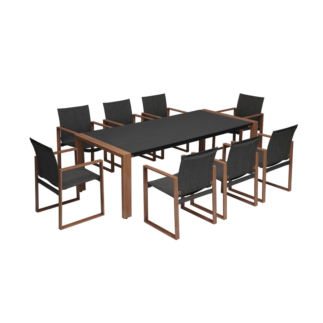 Dining set DUISBURG table, 8 chairs. The set includes a large dining table and 8 chairs. The frames of the table and chairs are made of aluminum. The surface finish, resembling the texture of natural wood grain, is achieved using the heat transfer printing method. To transfer the texture of wood onto the aluminum surface, a transfer film is placed on the aluminum profile and then subjected to high heat. During the process, ink is transferred from the transfer film to the aluminum surface, creating a wood-like effect. The surface finished in this way is very durable and withstands both sunlight and light scratches. The table has a dark gray tempered glass top. The seats of the chairs are made of olefin fabric. The dimensions of the table are 220x100xH74,5cm. The dimensions of the chairs are 57x57xH86,5cm. The product is highly resistant to changing weather conditions and easy to maintain. To extend the lifespan of outdoor furniture, we recommend using furniture covers. STORAGE: at the end of the summer season, we recommend storing the garden furniture indoors. Clean and dry the furniture before storing it. Use a dry, well-ventilated room for Aiamööblikomplekt DUISBURG. Komplekti kuulub suur söögilaud ja 8 tooli. Laua ja toolide raamid on valmistatud alumiiniumist. Naturaalse puidusüü tekstuuri meenutav pinnaviimistlus on saavutatud soojusülekande printimise meetodil. Puidu tekstuuri ülekandmiseks alumiiniumpinnale asetatakse ülekandekile alumiiniumprofiili peale ja seejärel allutatakse kõrgele kuumusele. Protsessi käigus viiakse tint ülekandekilelt alumiiniumpinnale, luues puidutaolise efekti. Sel viisil viimistletud pind on väga vastupidav ja talub hästi nii päikesekiirgust, kui kergemaid kriimustusi. Laual on tumehall karastatud klaasist plaat. Toolide istmed on valmistud olefin kangast. Laua mõõdud on 220x100xH74,5cm. Tooli mõõdud on 57x57xH86,5cm. Toode on muutlikes ilmastikutingimustes hästi vastupidav ja lihtsalt hooldatav. Välitingimustes kasutatava mööbli eluea pikendamiseks soovitame kasutada välimööbli katteid. HOIUSTAMINE: suvehooaja lõppedes soovitame aiamööblit hoiustada siseruumides. Puhastage ja kuivatage mööbel enne hoiule panekut. Kasutage hoiustamiseks kuiva ning hea ventilatsiooniga ruumi.