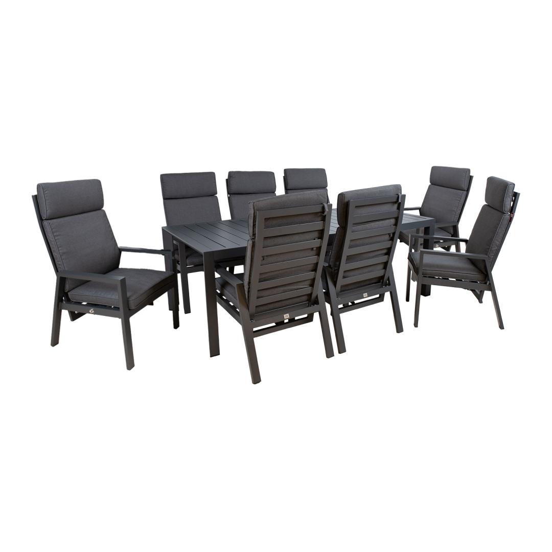 Garden furniture set TOMSON table and 8 chairs. The dimensions of the table are 216x100xH73cm. The tabletop and legs, as well as the legs and frame of the chairs, are made of aluminum and finished with a dark gray powder coating. The back of the chair is adjustable by means of a gas shock absorber. The adjustment knob is located on the right side of the chair seat. Seat cushion included. The dimensions of the seat cushion are 122x51xH6cm. The cushion cover is made of gray olefin fabric. The cover is removable and washable. The seat width is 50cm, the seat depth is 48cm, and the seat height is 40,5/46,5cm. The height of the armrest from the ground is 61cm. Weight limit 120kg. Product is durable in changing weather conditions and very easy to maintain, only cushions need protection from the weather conditions. STORAGE: at the end of the summer season, we recommend storing the garden furniture indoors. Clean and dry the furniture before storing. Use dry, well-ventilated room for storage. Aiamööblikomplekt TOMSON laud ja 8 tooli. Laua mõõdud on 216x100xH73cm. Lauaplaat ja jalad ning toolide jalad ja raam on valmistatud alumiiniumist ja viimistletud tumehalli pulbervärviga. Tooli seljatugi on reguleeritav gaasamordi abil. Reguleerimisnupp asub tooli istme paremal küljel. Istmepadi kuulub komplekti. Istmepadja mõõdud on 122x51xH6cm. Padjakate on valmistatud hallist olefin kangast. Padjakate on eemaldav ja pestav. Tooli istme laius on 50cm, istme sügavus 48cm, istme kõrgus 40,5/46,5cm. Käetoe kõrgus maast 61cm. Kaalupiirang 120kg. Toode on muutlikes ilmastikutingimustes väga hästi vastupidav ja lihtsalt hooldatav. Kaitset ilmastikuolude eest vajavad ainult padjad. HOIUSTAMINE: suvehooaja lõppedes soovitame aiamööblit hoiustada siseruumides. Puhastage ja kuivatage mööbel enne hoiule panekut. Kasutage hoiustamiseks kuiva ning hea ventilatsiooniga ruumi.