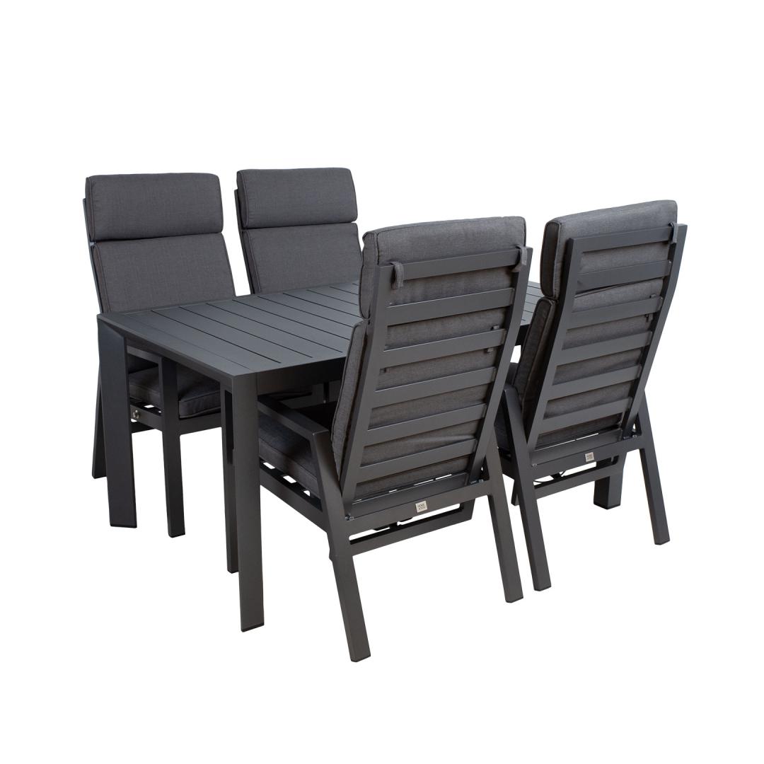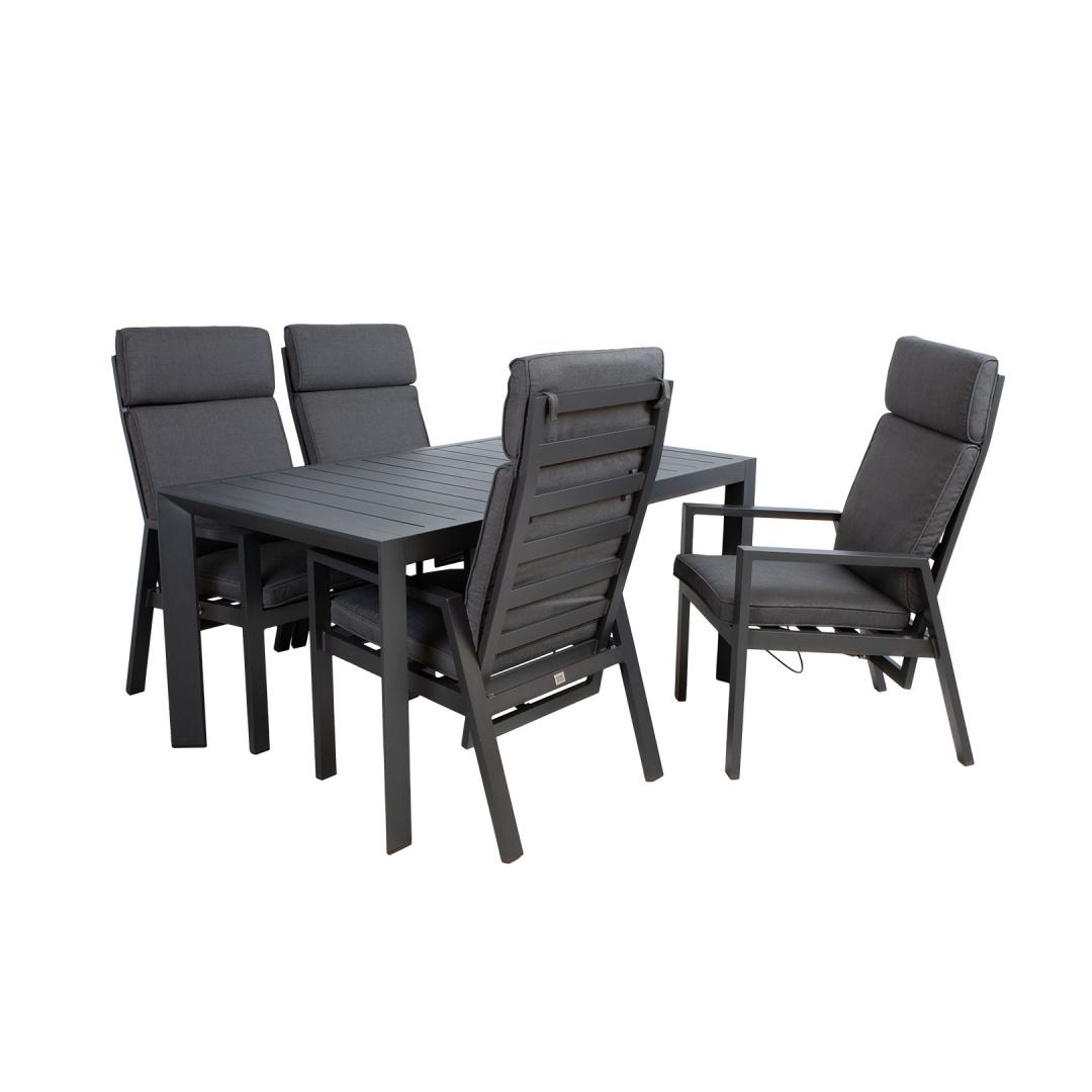 Garden furniture set TOMSON table and 4 chairs. The dimensions of the table are 160x90xH73cm. The tabletop and legs, as well as the legs and frame of the chairs, are made of aluminum and finished with a dark gray powder coating. The back of the chair is adjustable by means of a gas shock absorber. The adjustment knob is located on the right side of the chair seat. Seat cushion included. The dimensions of the seat cushion are 122x51xH6cm. The cushion cover is made of gray olefin fabric. The cover is removable and washable. The seat width is 50cm, the seat depth is 48cm, and the seat height is 40,5/46,5cm. The height of the armrest from the ground is 61cm. Weight limit 120kg. Product is durable in changing weather conditions and very easy to maintain, only cushions need protection from the weather conditions. STORAGE: at the end of the summer season, we recommend storing the garden furniture indoors. Clean and dry the furniture before storing. Use dry, well-ventilated room for storage. Aiamööblikomplekt TOMSON laud ja 4 tooli. Laua mõõdud on 160x90xH73cm. Lauaplaat ja jalad ning toolide jalad ja raam on valmistatud alumiiniumist ja viimistletud tumehalli pulbervärviga. Tooli seljatugi on reguleeritav gaasamordi abil. Reguleerimisnupp asub tooli istme paremal küljel. Istmepadi kuulub komplekti. Istmepadja mõõdud on 122x51xH6cm. Padjakate on valmistatud hallist olefin kangast. Padjakate on eemaldav ja pestav. Tooli istme laius on 50cm, istme sügavus 48cm, istme kõrgus 40,5/46,5cm. Käetoe kõrgus maast 61cm. Kaalupiirang 120kg. Toode on muutlikes ilmastikutingimustes väga hästi vastupidav ja lihtsalt hooldatav. Kaitset ilmastikuolude eest vajavad ainult padjad. HOIUSTAMINE: suvehooaja lõppedes soovitame aiamööblit hoiustada siseruumides. Puhastage ja kuivatage mööbel enne hoiule panekut. Kasutage hoiustamiseks kuiva ning hea ventilatsiooniga ruumi.