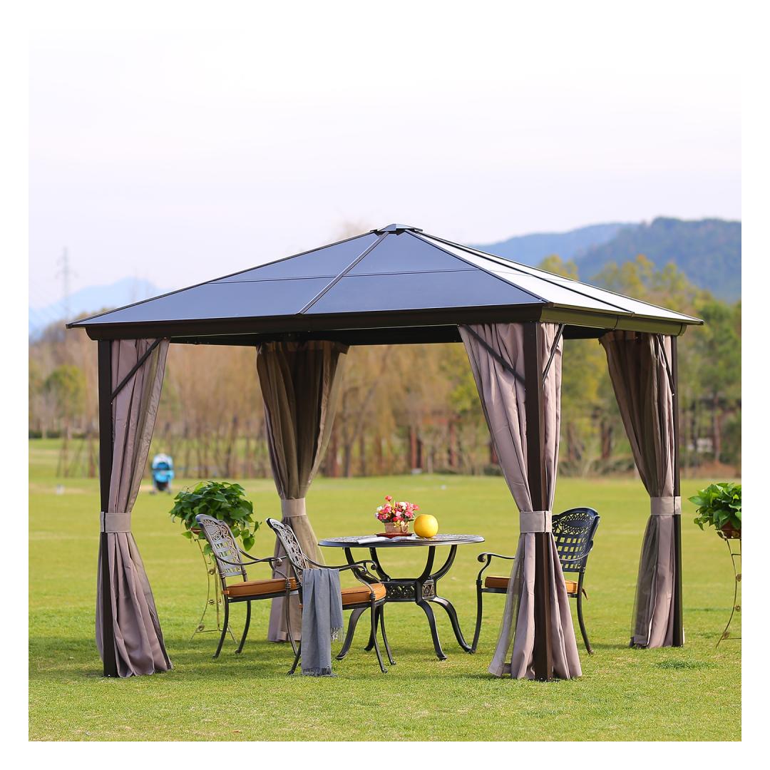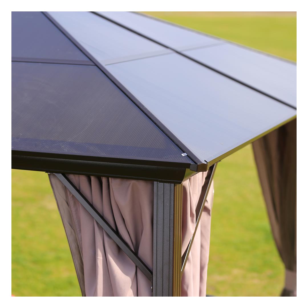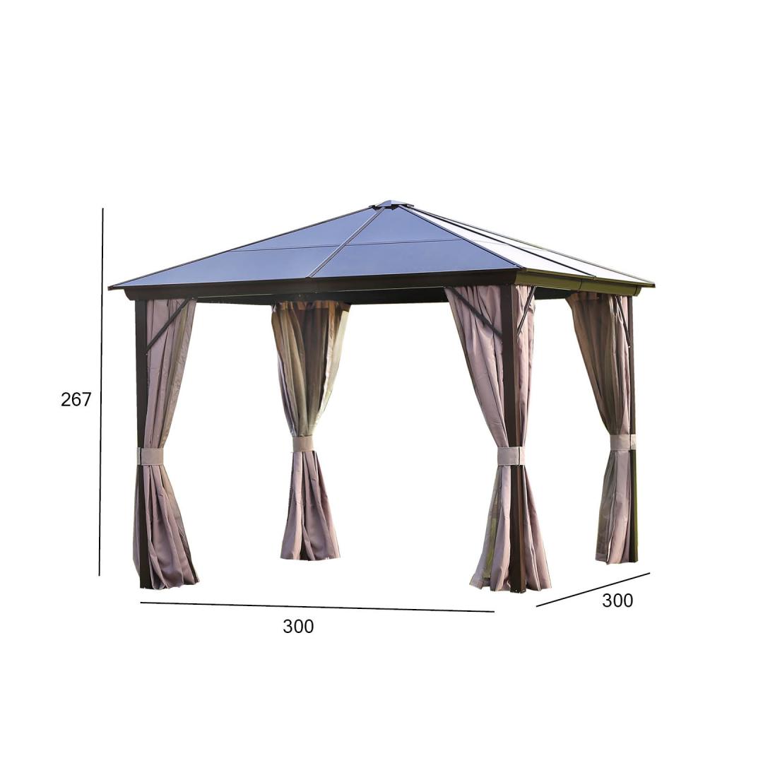 Gazebo SUNSET 3x3H2,67m, brown/taupe. The elegant and functional gazebo/garden pavilion provides protection and shade from both light rain and scorching sun and allows you to enjoy the outdoors regardless of the weather or time. The gazebo has polyester fabric (180g/m²) curtains on all sides and nylon mosquito nets with zippers. The main construction of the gazebo is made of aluminum. All frame parts are finished with a brown powder coating. The dimensions of the side pole are 76x76mm, cross beams 116x76mm, roof ribs 29x26mm. Roof panels: 6mm polycarbonate. It is a weatherproof, environmentally friendly material that offers a unique combination of durability with excellent impact strength. The material also has a good light transmission and high-temperature resistance. WARNING: in extreme weather conditions or during a storm warning, do not leave the canopy unattended. Strong wind, rain or snow can damage the gazebo. STORAGE: to extend the life span of the gazebo, it is recommended to disassemble and store it in a well-ventilated space at the end of the summer season. If the canopy remains up during the winter, ensure that excessive snow does not accumulate on the roof. Remove accumulated snow at the earliest opportunity. Remove the mosquito nets and curtains at the end of the summer season. Clean and dry the curtains before storing them. Varikatus SUNSET 3x3xH2,67m, pruun/taupe. Elegantne ja funktsionaalne varikatus/aiapaviljon pakub kaitset ja varju nii kerge vihma, kui kõrvetava päikese eest ning võimaldab nautida õues olemist ilmast ja kellaajast olenemata. Varikatuse kõigil külgedel on polüesterkangast (180g/m²) kardinad ja lukuga suletavad nailonist sääsevõrgud. Varikatuse põhikonstruktsioon on valmistatud alumiiniumist. Kõik raami osad on viimistletud pruuni pulbervärviga. Küljepostide mõõdud on 76x76mm, risttala mõõdud 116x76mm, katuseribid 29x26mm. Katusepaneelid: 6mm polükarbonaat ehk kihtplastik. Polükarbonaat on ilmastikukindel, keskkonnasõbralik materjal, mis pakub ainulaadset kombinatsiooni vastupidavusest koos väga hea löögitugevusega. Samuti on materjalil hea valguse läbilaskvus ja kõrge temperatuuritaluvus. HOIATUS: ekstreemsete ilmastikutingimuste või tormihoiatuse korral ei tohi jätta varikatust järelevalveta. Tugev tuul, vihm või lumi võivad varikatus kahjustada. HOIUSTAMINE: varikatuse eluea pikendamiseks soovitame see suvehooaja lõppedes lahti monteerida ja hoiustada kuivas ning hea ventilatsiooniga ruumis. Juhul kui varikatus jääb talveks üles tuleb jälgida, et katusele ei koguneks liigselt lund. Eemaldage kogunenud lumi esimesel võimalusel. Suvehooaja lõppedes eemaldage sääsevõrgud ja kardinad. Puhastage ja kuivatage kardinad enne hoiule panekut.