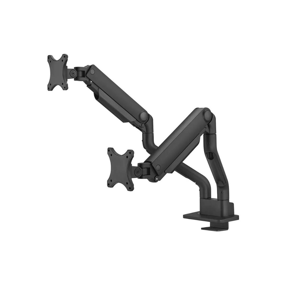 The Neomounts DS70S-950BL2 NEXT One is a full motion desk mount for two screens up to 35". The DS70S-950BL2 is a true all-in one solutions for small to large displays. The NEXT One features a strengthened head to support a higher maximum weight up to 18 kg per screen. The versatile tilt (180°), rotate (360°) and swivel (180°) technology allows the mount to change to any viewing angle to fully benefit from the capabilities of the screen. Additionally, the mount has gas spring height adjustment (20,2-52,2 cm) and depth adjustment (8,8-62,5 cm), to create the perfect working position.