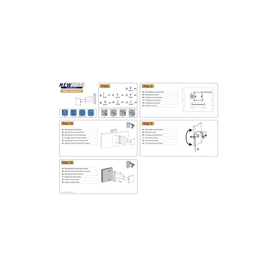 NewStar FPMA-W830BLACK has three pivot points and is suitable for screens up to 24" (60 cm). The weight capacity of this product is 12 kg each screen. The wall mount is suitable for screens that meet VESA hole pattern 75x75 and 100x100mm. Different hole patterns can be covered using NewStar VESA adapter plates.