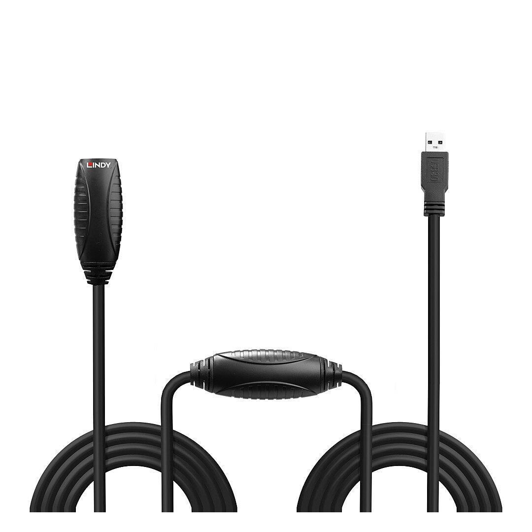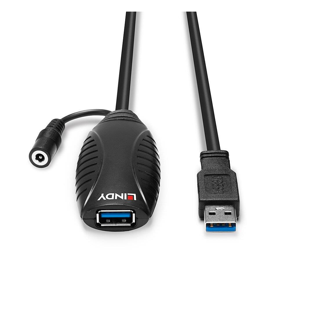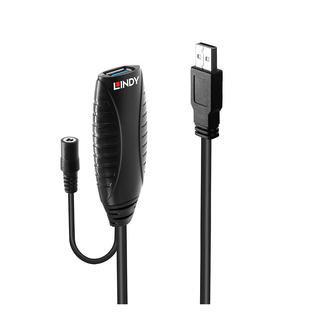 The Lindy USB 3.0 Active Extension Cable uses built-in active electronics to extend the cable length of a USB 3.0 device by an additional 15m whilst continuing to support data transfer rates of up to 5Gbps. With its USB A male and USB A female connector it allows Type A devices such as storage devices, webcams and other Type A devices to be connected at longer distances to PCs, laptops and tablets, while also ensuring flexible positioning. Up to 2 extension cables can be chained together to achieve a distance of 30m. The Lindy USB 3.0 Active Extension Cable is compatible with all USB Type A equipped computers. With plug and play functionality, this extension cable can be installed quickly and with minimum fuss, ideal for both professional and first time users.The USB active extension cable also features a DC socket for connecting an external power supply (5V 2A, not included) when using USB peripherals which have higher power requirements.