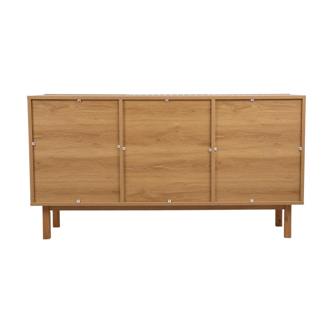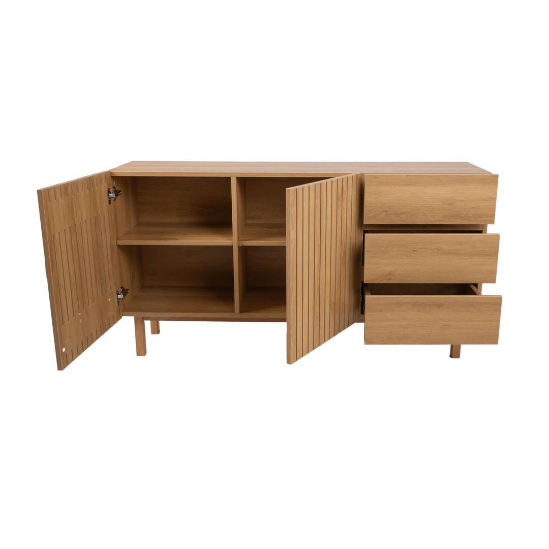 The sideboard is made of melamine board with light oak bark. Door panels made of thin slats create an airy and elegant impression.