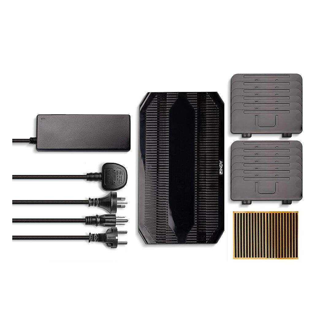 11 plastic separators; 12V 8A PSU with 5.5/2.5mm DC connector and 4 country specific power cables (EU/US/UK/AUS to IEC C5); LINDY User Manual