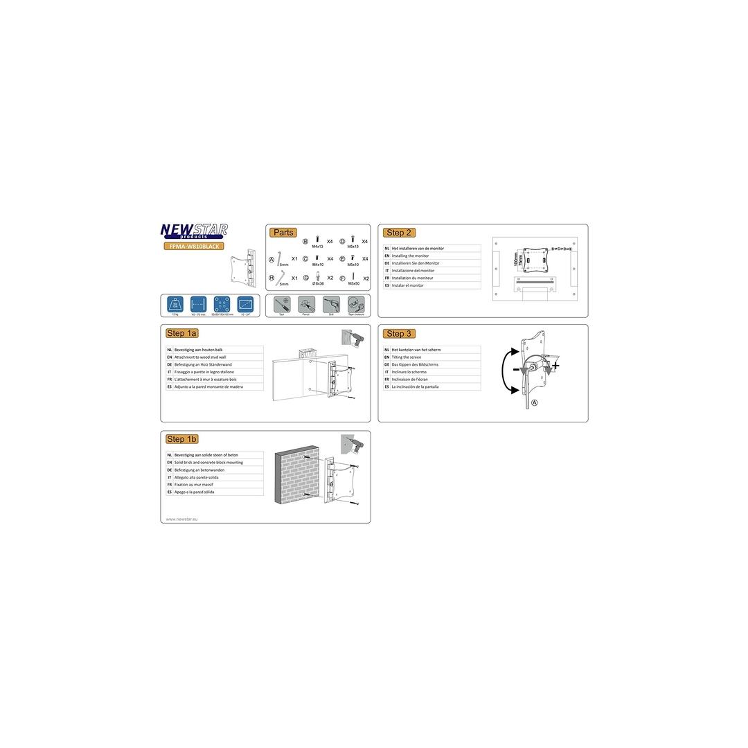 NewStar FPMA-W810BLACK has one pivot point and is suitable for screens up to 24" (60 cm). The weight capacity of this product is 12 kg each screen. The wall mount is suitable for screens that meet VESA hole pattern 75x75 and 100x100mm. Different hole patterns can be covered using NewStar VESA adapter plates.