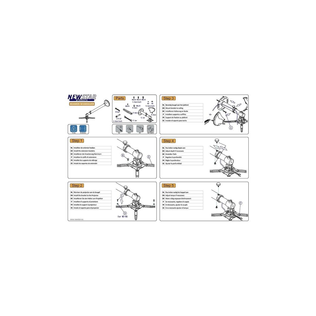 This universal NewStar projector wall mount, model BEAMER-W100SILVER, allows you to mount a projector/beamer to any wall.