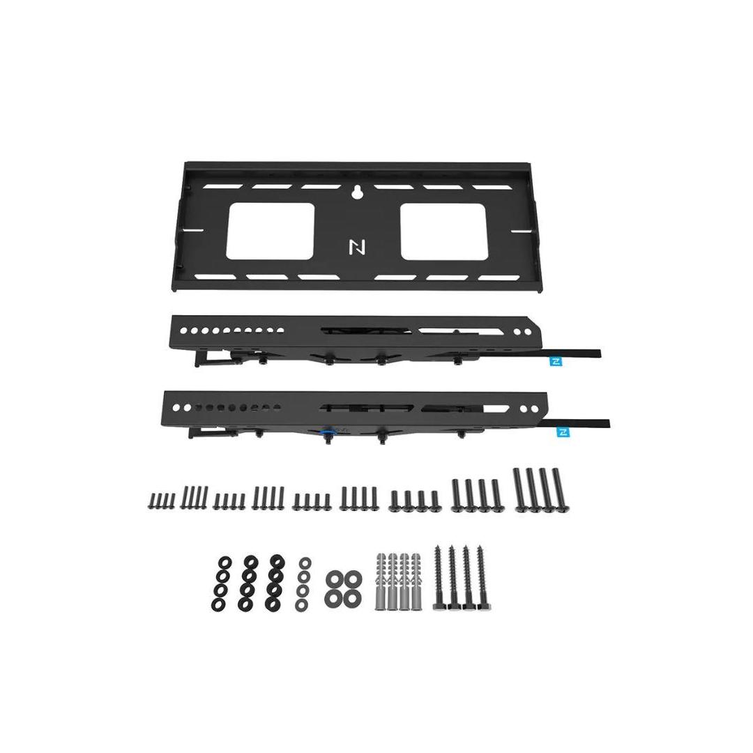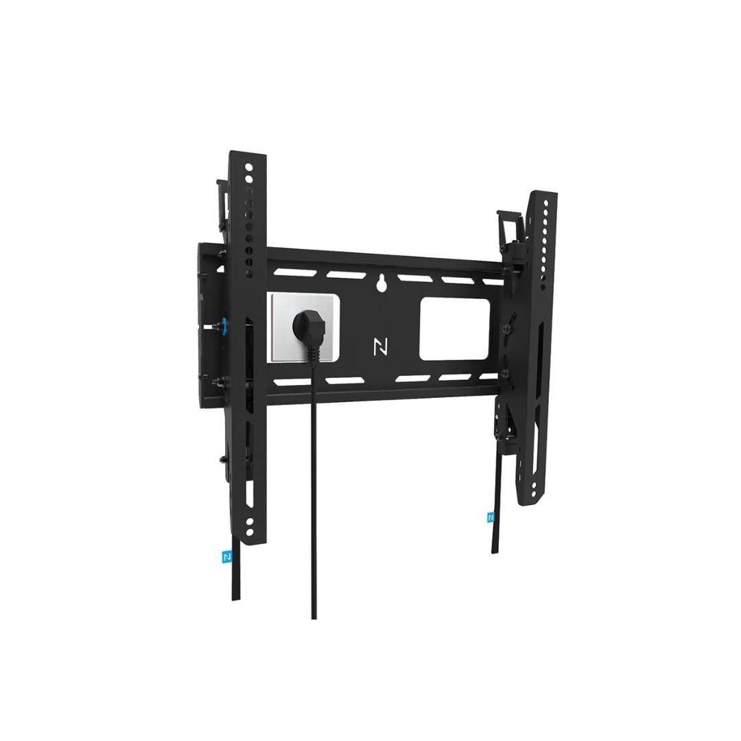 The LEVEL-750 wall mount has a profile of 9,3 cm and is suitable for screens that meet VESA hole pattern 100x100 to 400x400 mm. Its quickly connectable wall plate allows for multiple screen mounting. Additionally, the wall plate is designed with specific cut-outs for wall sockets and securing devices and cables. It features various perforated holes for easy tie-wrap cable fixing and provides space for cable storage, ensuring a clean and tidy finishing.