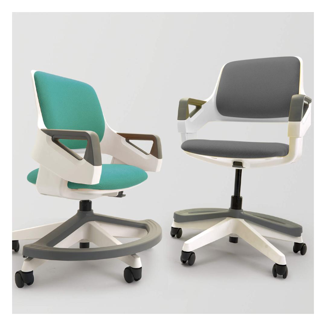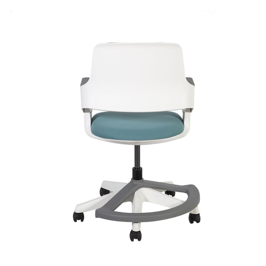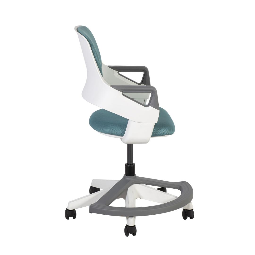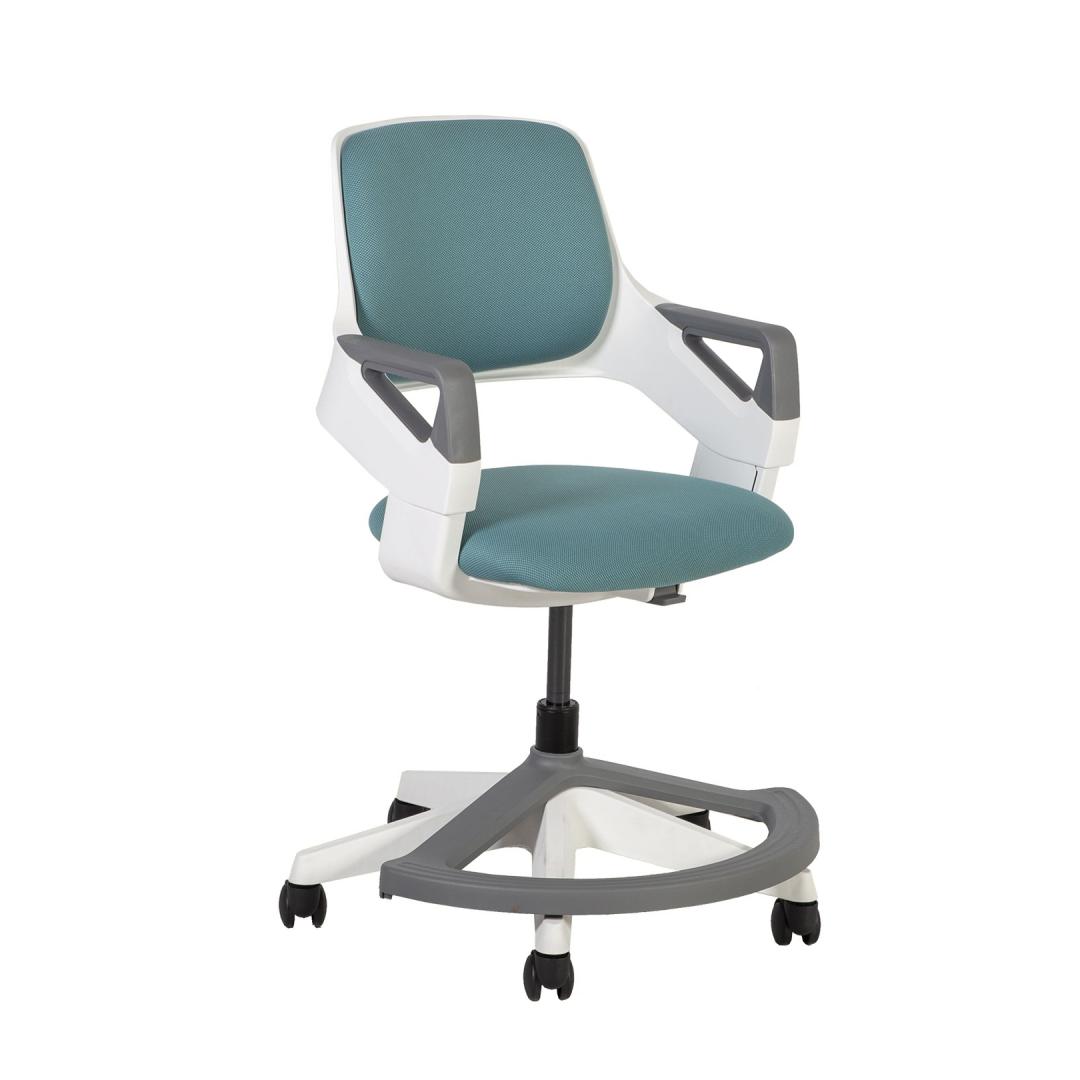 Children's chair ROOKEE teal blue. ROOKEE grows with your child! The chair is suitable for children aged 4-14 (110-160cm). The key feature that ROOKEE boasts is its ability to adjust the back to 7 different positions. Each adjustment changes both the back height and seat depth simultaneously, accommodating different size users. The footrest can swivel out of the way to accommodate larger users. Weight-sensitive auto-braking castors ensure safe use of the chair. Castors roll freely only when sitting in a chair. Free rolling stops as soon as the user gets up and pressure on the castors disappears. Both the back and seat pad can easily be removed for thorough cleaning, furthermore the upholstery can be replaced in case of need. White and grey injection molded polypropylene (100% recyclable) outer shell, arm pads, base and footrest. Seat height is adjustable 38-50cm. Backrest height is adjustable 38-43cm. The dimensions of the product are 64x64xH76-93cm. Weight limit 60kg.