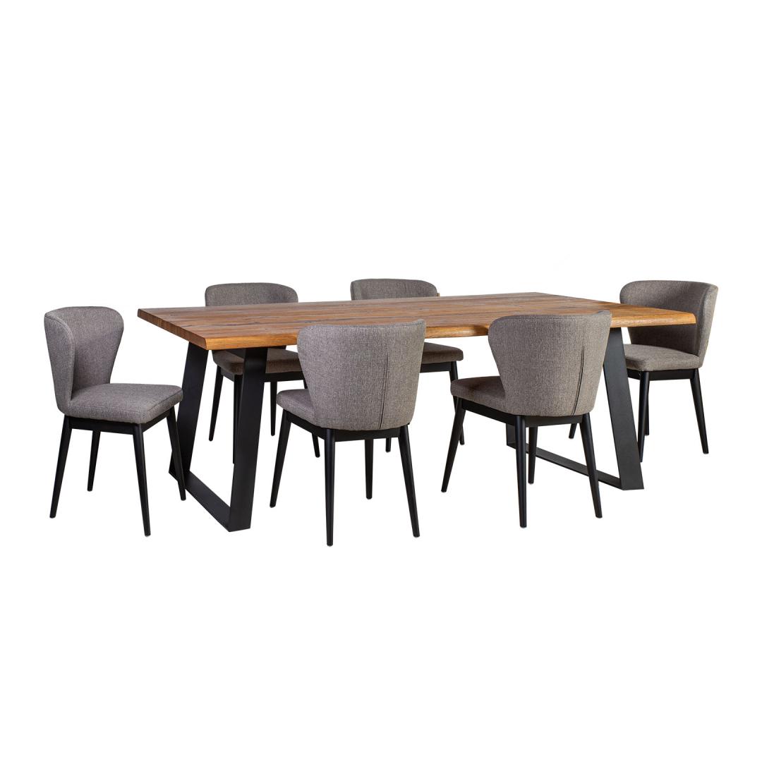 Dining set ROTTERDAM table and 6 chairs, The dimensions of the table are 220x100xH75cm. The tabletop is made of furniture board and covered with a natural rustic oak veneer. Rustic veneer has a colorful and lively structure. Large knots, caulked cracks, and lots of tonal variation are allowed. The edges of the table have solid wood slats. The Tabletop consists of two panels. The tabletop is finished with oil. The table legs are made of metal and finished with a black powder coating. The dimensions of the chair are 53,5x54xH81,5cm. The upholstered seat and backrest are covered with grey polyester fabric. The legs and base frame of the chair are made of solid wood and finished in black paint. Weight limit 100kg. It is possible to buy a 50cm extension plate (code 18114) at one or both ends of the table, which can be used to create up to 3+3 seats. The extension plates are not included in the set. CARE TIPS: protect the veneered surfaces from liquids. Wipe up spills immediately with a damp cloth to prevent moisture damage. Always use table mats and heat coasters. Söögilauakomplekt ROTTERDAM 6-tooliga. Laua mõõdud on 220x100xH75cm. Mööbliplaadist valmistatud lauaplaat on kaetud naturaalse rustik tammespooniga. Rustik spoon on kirju ja elava struktuuriga. Suured oksakohad, pahteldatud lõhed ja rohke tooni varieerumine on lubatud. Laua äärtes on täispuidust liistud. Lauaplaat koosneb kahest paneelist. Lauaplaat on viimistletud õliga. Lauajalad on valmistatud metallist ja viimistletud musta pulbervärviga. Tooli mõõdud on 53,5x54xH81,5cm. Tooli iste ja seljatugi on polsterdatud ja kaetud halli polüesterkangaga. Tooli jalad ja alusraam on valmistatud täispuidust ja viimistletud musta värviga. Kaalupiirang 100kg. Laua ühte või mõlemasse otsa on võimalik juurde osta 50cm pikendus (kood 18114), mille abil saab tekitada lisaks kuni 3+3 istumiskohta. Pikendusplaadid ei kuulu komplekti. HOOLDUS: kaitske spoonitud pinda vedelike eest. Igasugune lauale sattunud vedelik tuleb koheselt pühkida pehme, õrnalt niiske lapiga. Kasutage alati lauamatte ja kuumaaluseid.