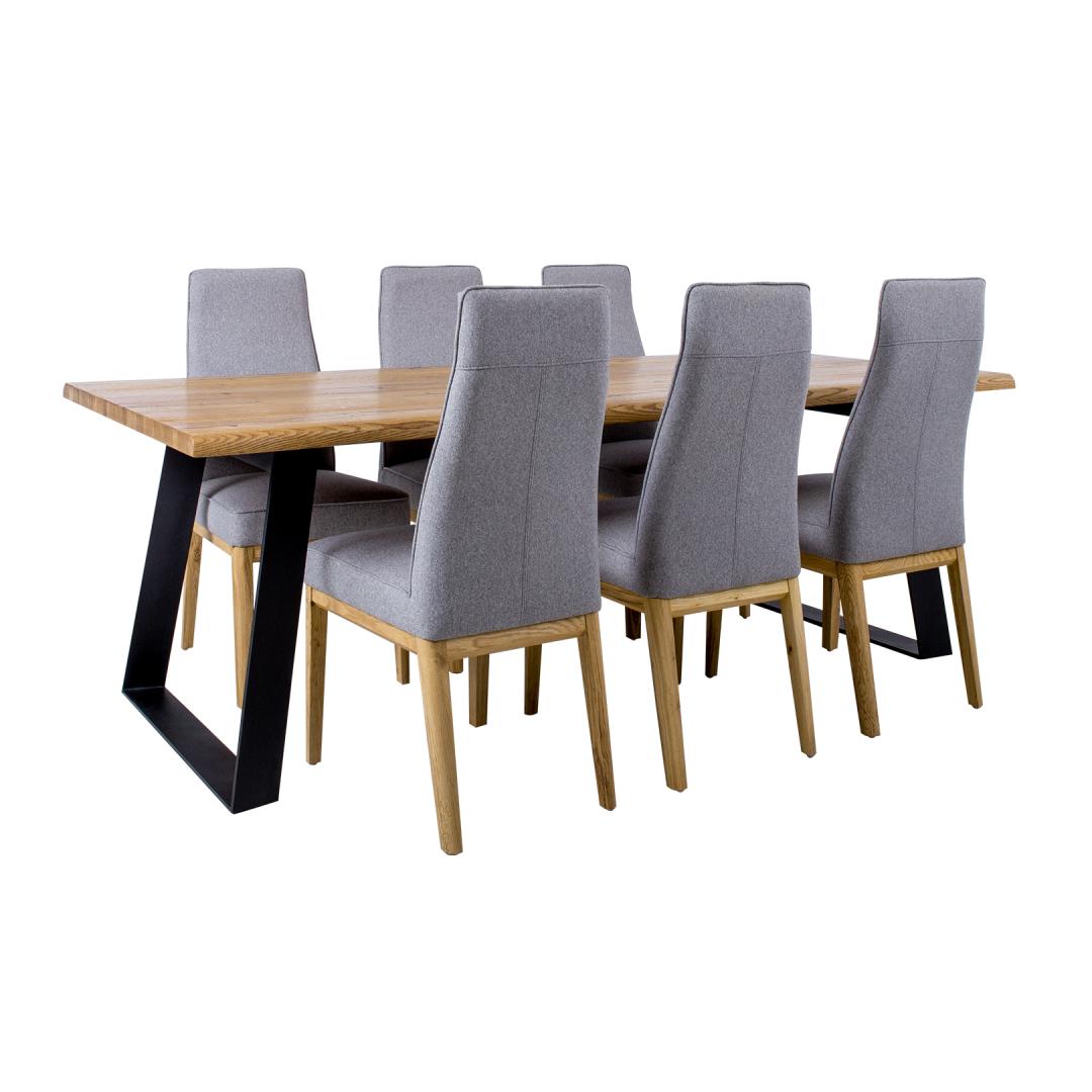 Dining set ROTTERDAM table and 6 chairs. The dimensions of the table are 220x100xH75cm. The tabletop is made of furniture board and covered with a natural rustic oak veneer. Rustic veneer has a colorful and lively structure. Large knots, caulked cracks, and lots of tonal variation are allowed. The edges of the table have solid wood slats. The Tabletop consists of two panels. The tabletop is finished with oil. The table legs are made of metal and finished with a black powder coating. The dimensions of the chair are 46x58,5xH102cm, grey. The upholstered seat and backrest are covered with polyester fabric. The legs and base frame of the chair are made of solid oak. Seat height 48cm. Weight limit 100kg. It is possible to buy a 50cm extension plate (code 18114) at one or both ends of the table, which can be used to create up to 3+3 seats. The extension plates are not included in the set. CARE TIPS: protect the veneered surfaces from liquids. Wipe up spills immediately with a damp cloth to prevent moisture damage. Always use table mats and heat coasters. Söögilauakomplekt ROTTERDAM 6-tooliga. Laua mõõdud on 220x100xH75cm. Mööbliplaadist valmistatud lauaplaat on kaetud naturaalse rustik tammespooniga. Rustik spoon on kirju ja elava struktuuriga. Suured oksakohad, pahteldatud lõhed ja rohke tooni varieerumine on lubatud. Laua äärtes on täispuidust liistud. Lauaplaat koosneb kahest paneelist. Lauaplaat on viimistletud õliga. Lauajalad on valmistatud metallist ja viimistletud musta pulbervärviga. Tooli mõõdud on 46x58,5xH102cm. Tooli iste ja seljatugi on polsterdatud ja kaetud halli polüesterkangaga. Jalad ja alusraam on valmistatud tammepuidust. istmekõrgus 48cm. Kaalupiirang 100kg. Laua ühte või mõlemasse otsa on võimalik juurde osta 50cm pikendus (kood 18114), mille abil saab tekitada lisaks kuni 3 + 3 istumiskohta. Pikendusplaadid ei kuulu komplekti. HOOLDUS: kaitske spoonitud pinda vedelike eest. Igasugune lauale sattunud vedelik tuleb koheselt pühkida pehme, õrnalt niiske lapiga. Kasutage alati lauamatte ja kuumaaluseid.