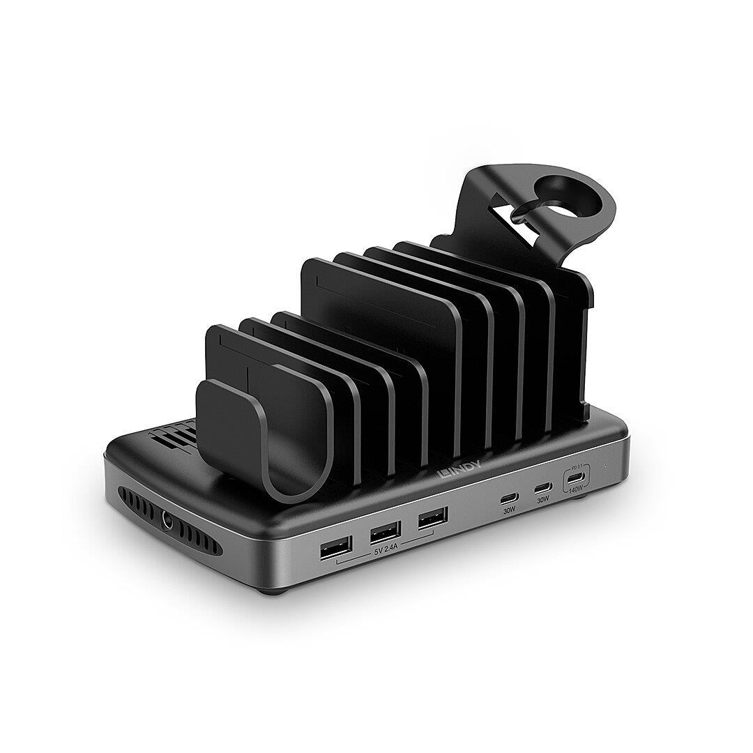 Simultaneous charging of up to 6 tablets, smartphones and/or a laptop or Macbook with up to 140W or other USB devices